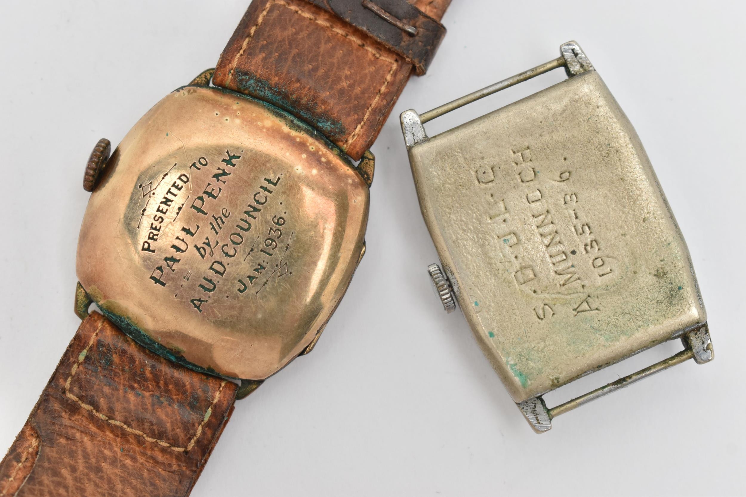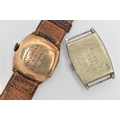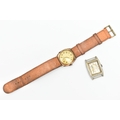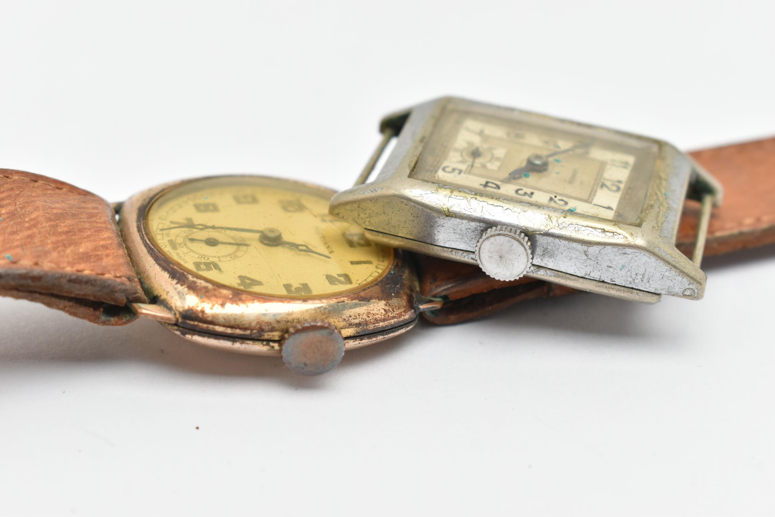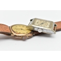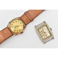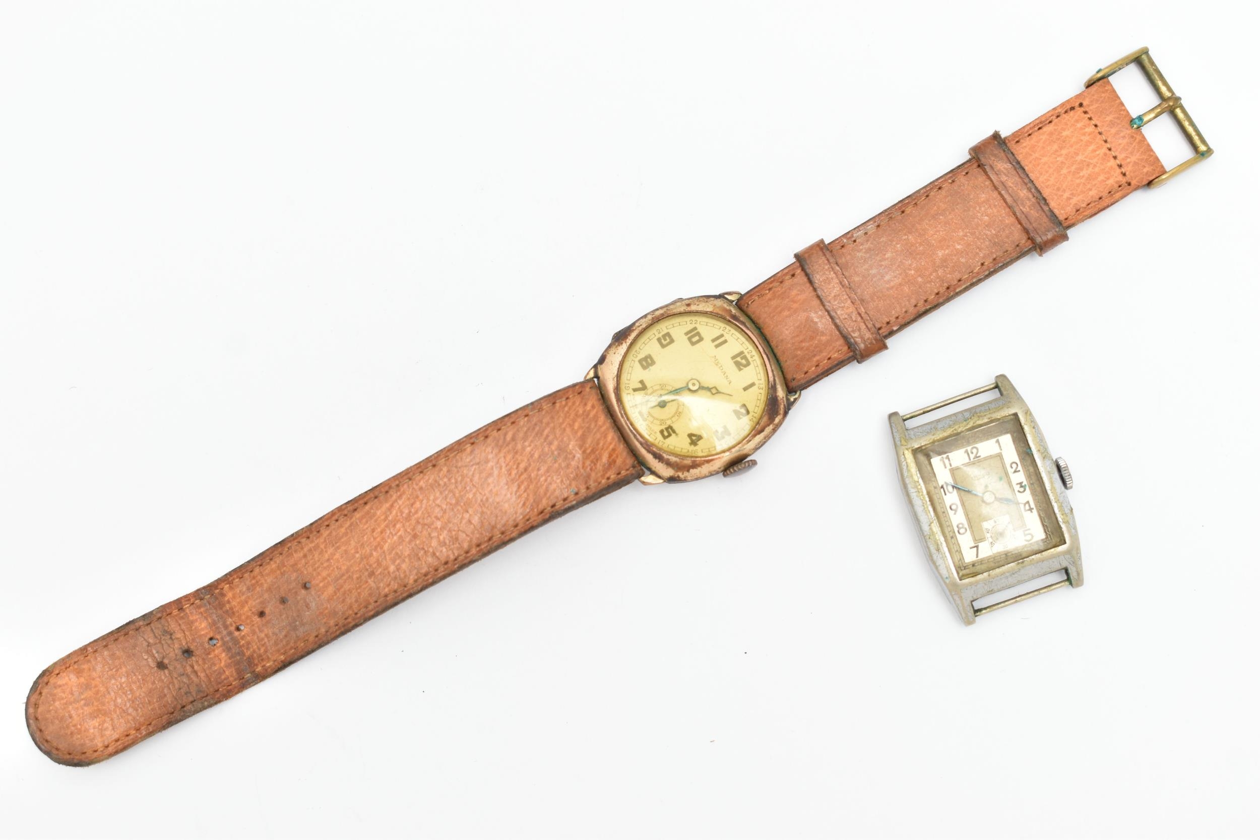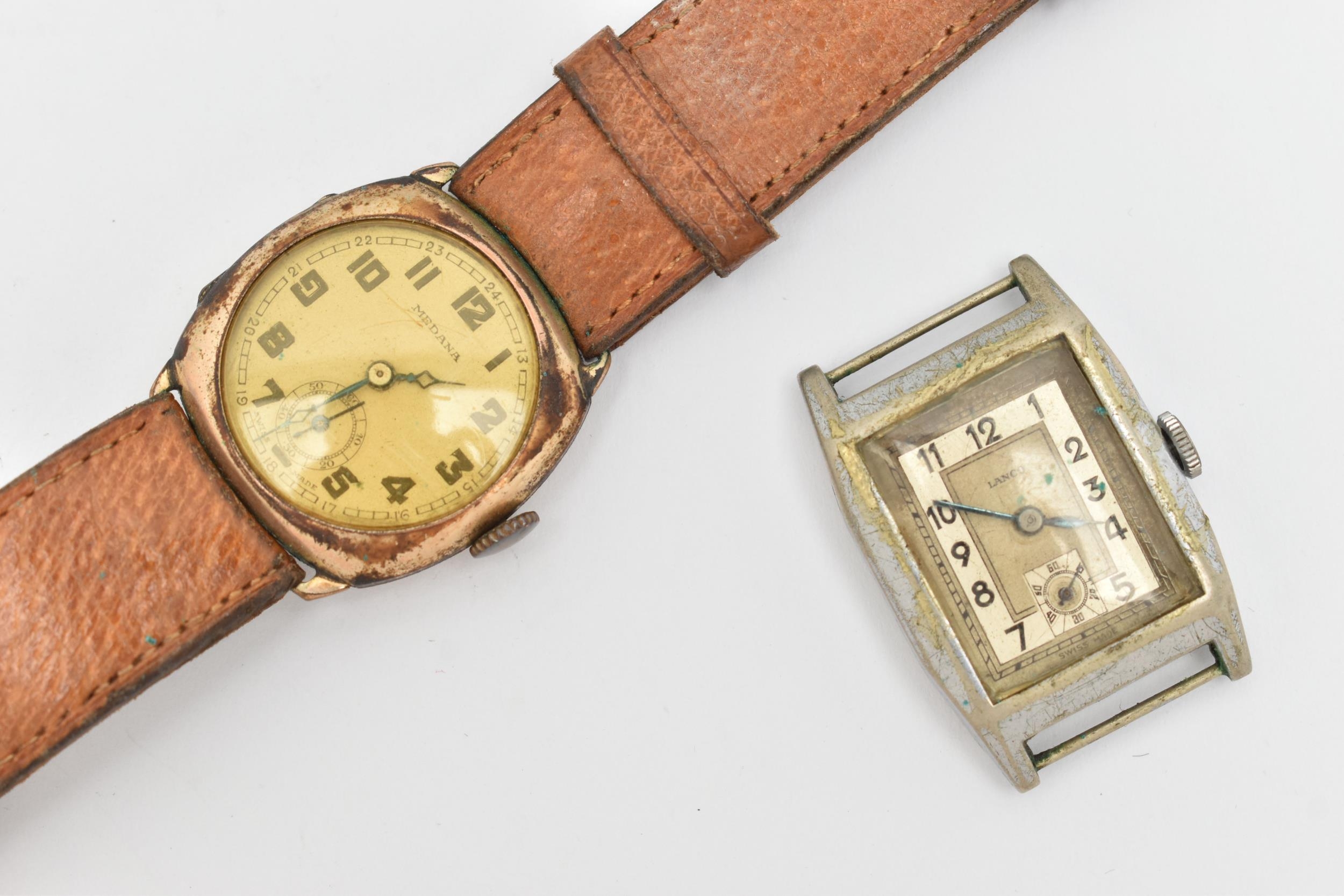 TWO GENTS WATCHES, the first a gold plated, manual wind 'Medana' wristwatch, round Arabic numeral dial signed, with subsidiary dial at the six o'clock position, engraved case back, fitted with a brown strap, the second a base metal 'Lanco' manual wind tonneau watch head, missing bracelet/strap (condition report: both watches require attention)