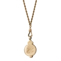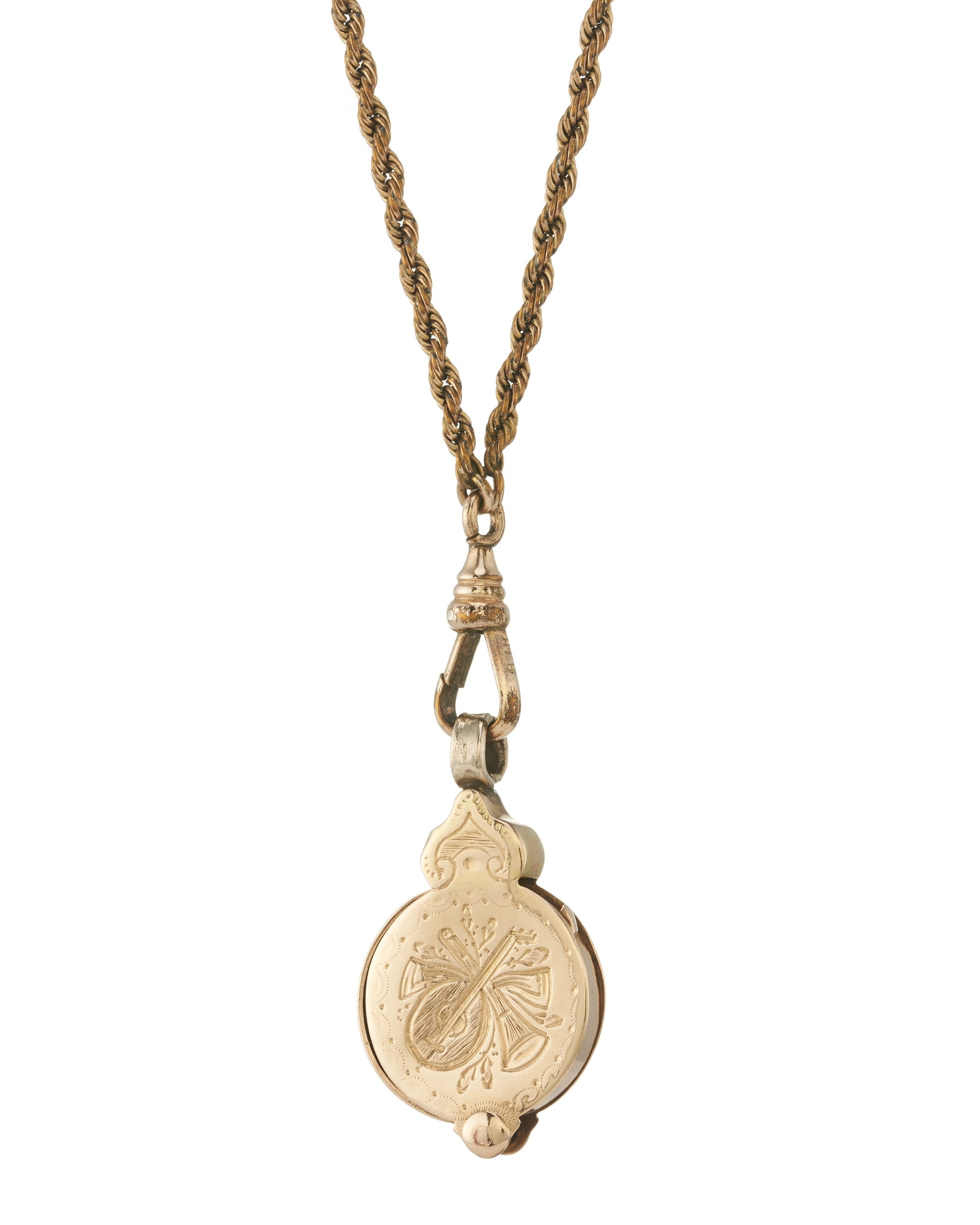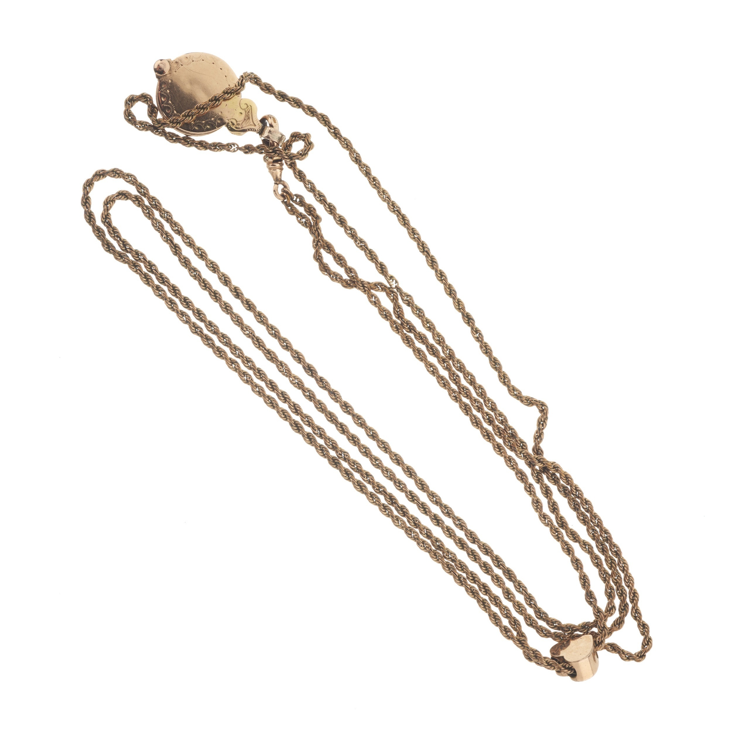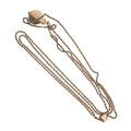 An early 20th century yellow metal longuard chain, with opal cabochon accent heart-shape slider, suspending a 9ct gold magnifying glass, length of magnifying glass 3cm, length of chain 118cm, total weight 20.8g
