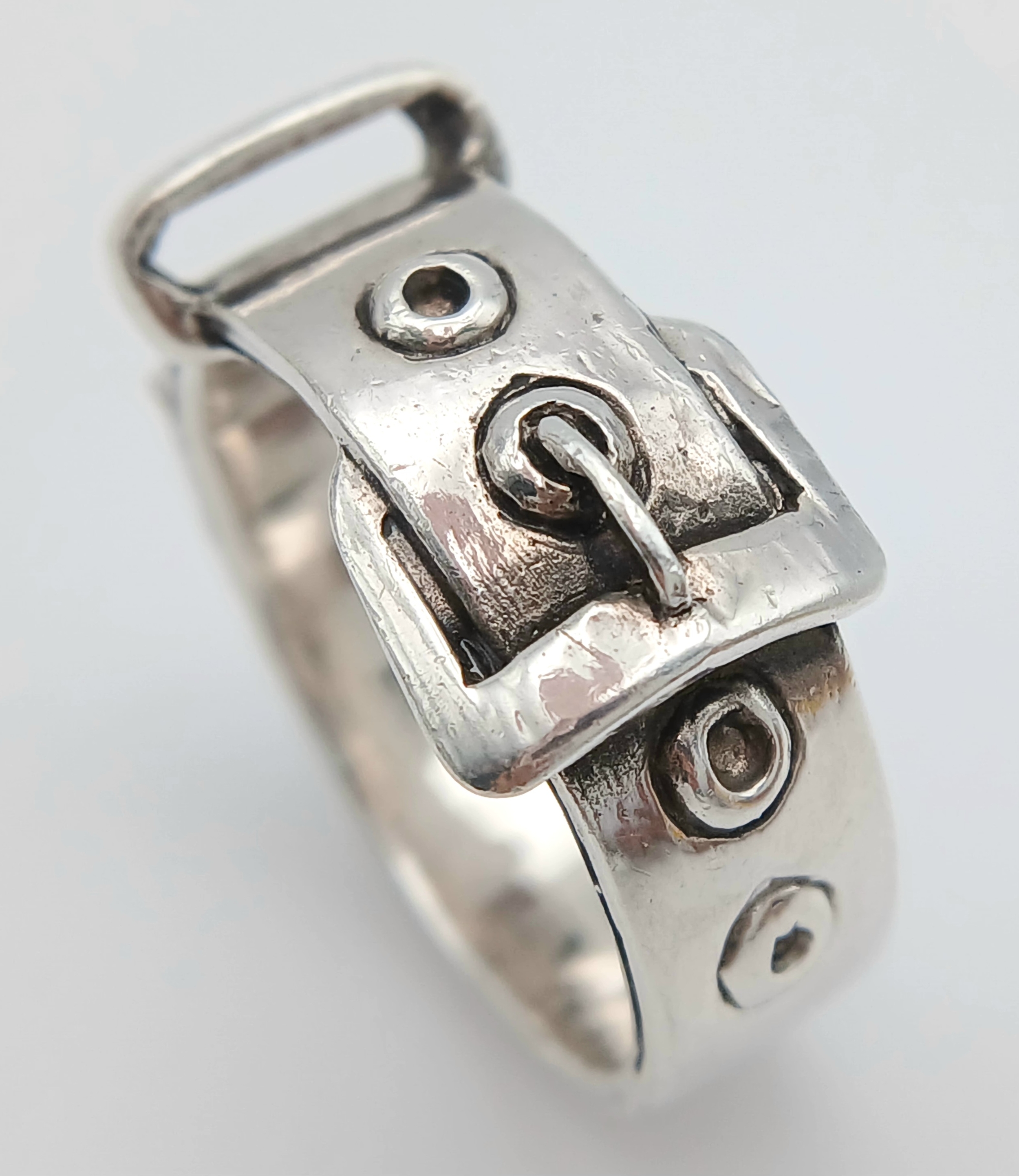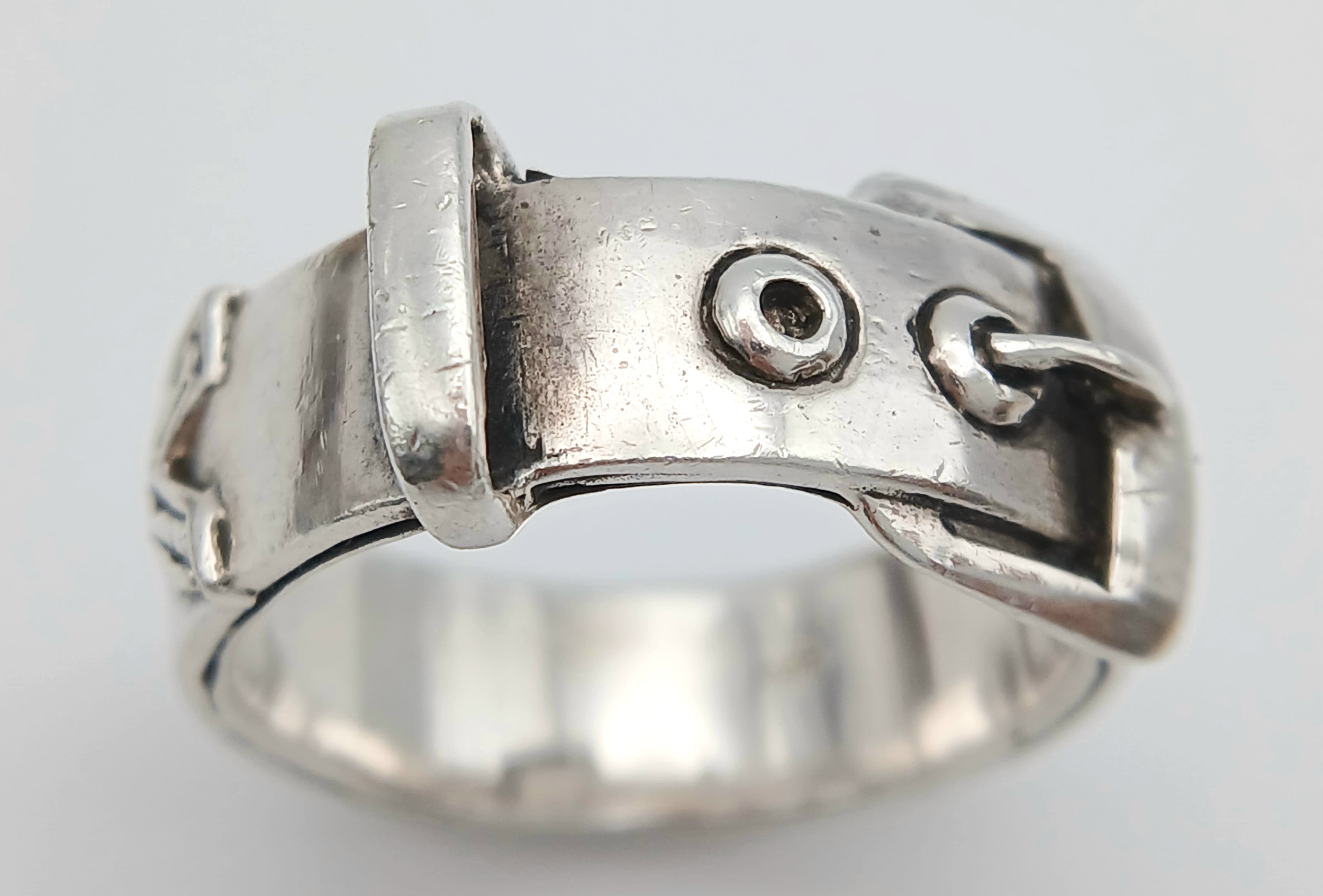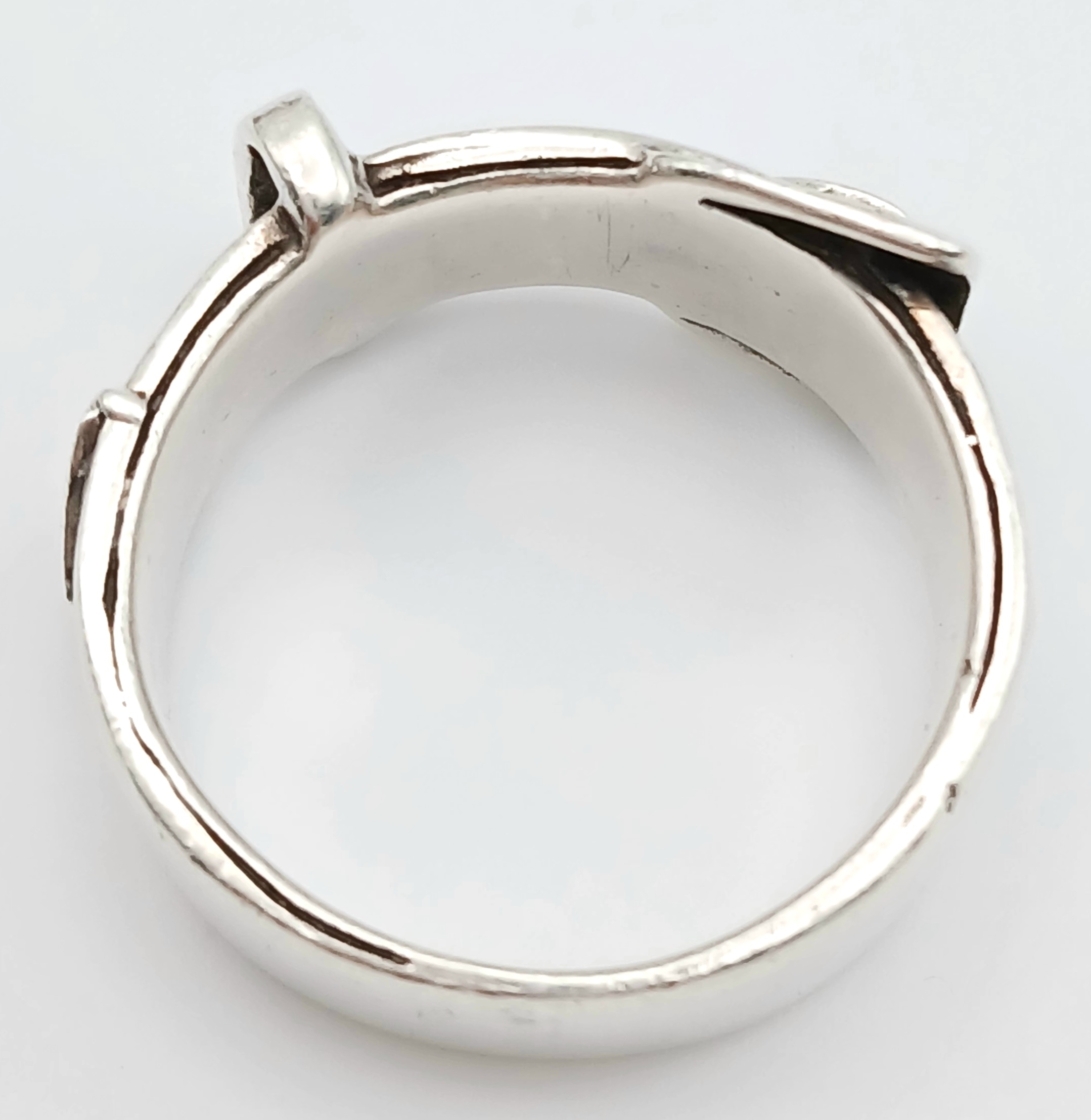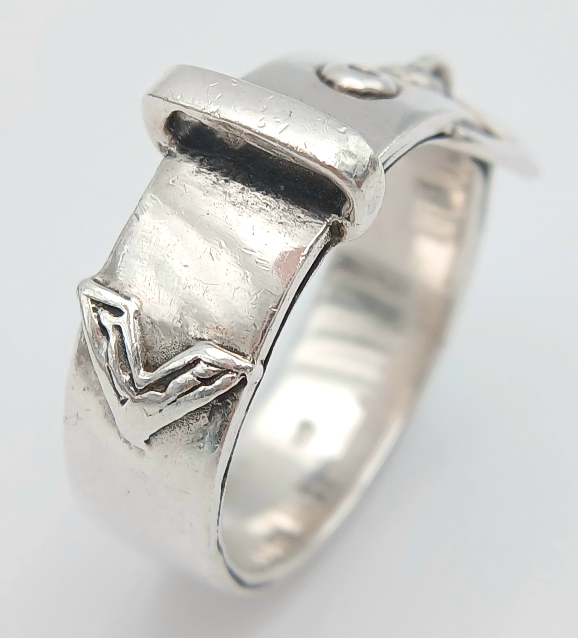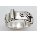 A STERLING SILVER, BUCKLE RING. 9.6G, SIZE V. A/S RED 1