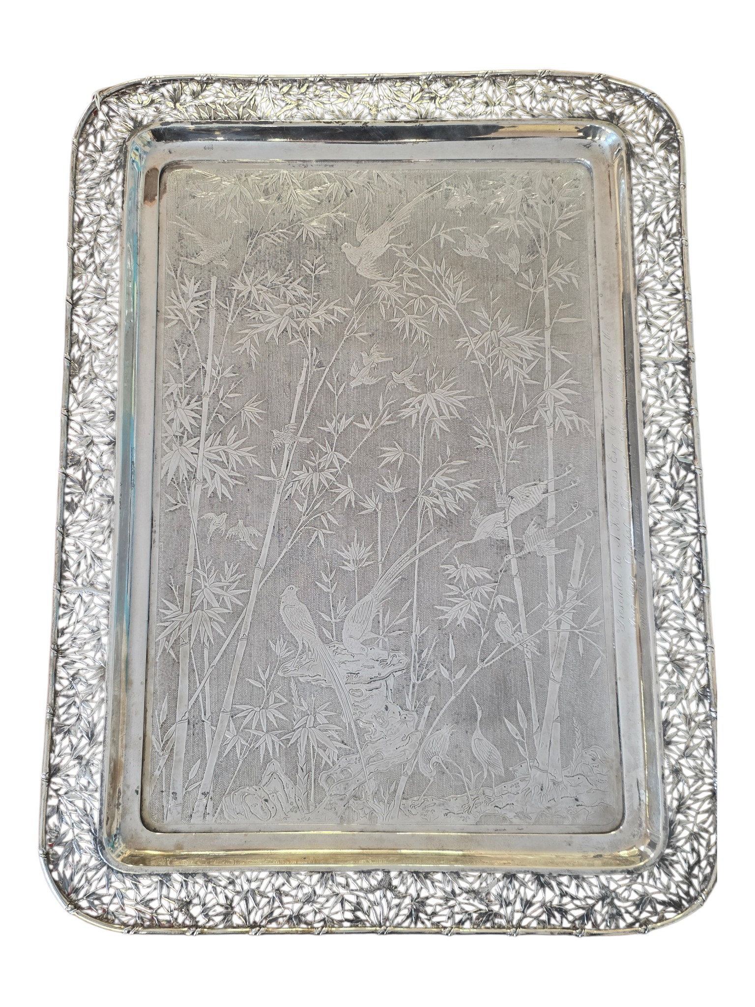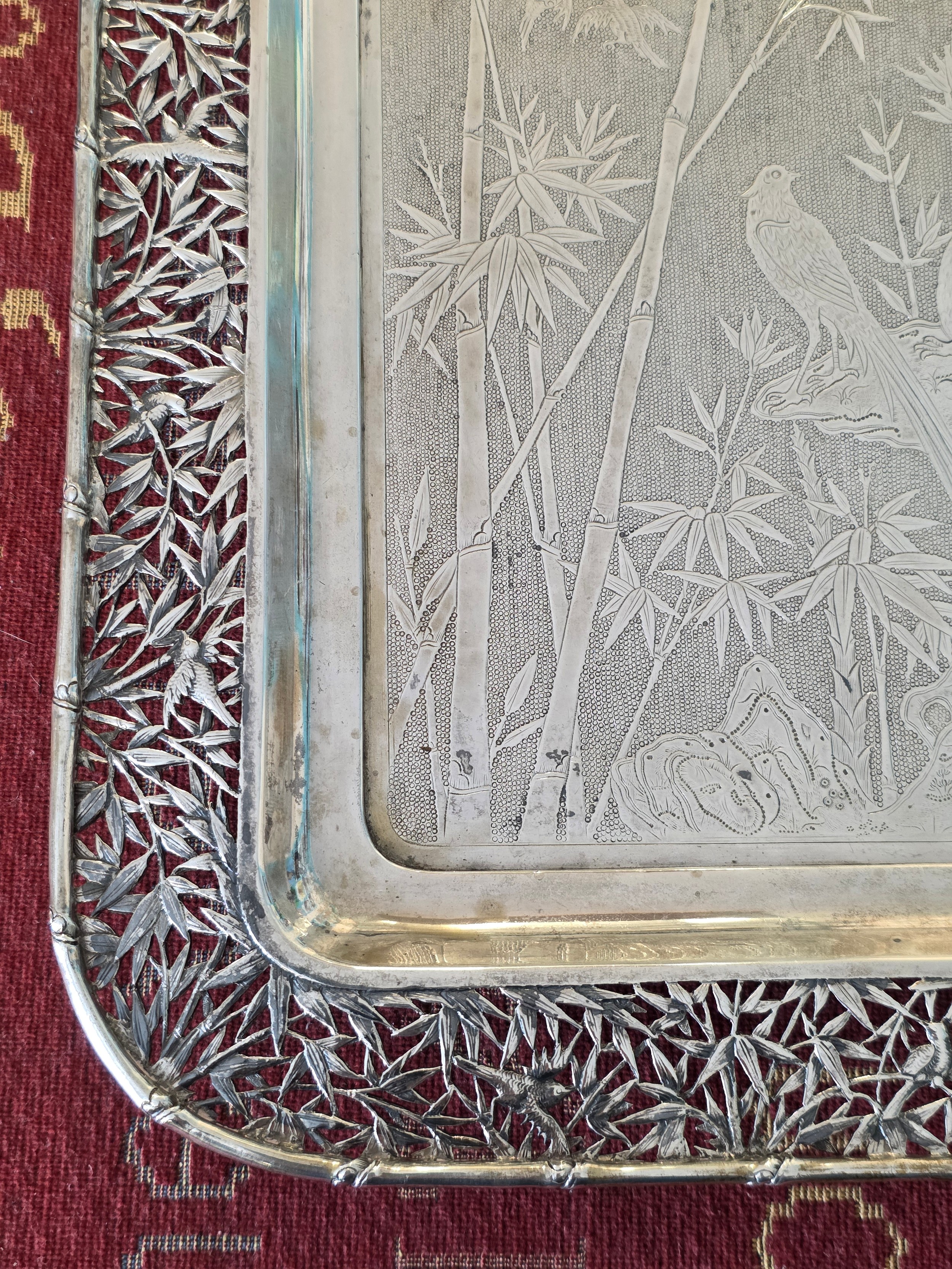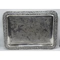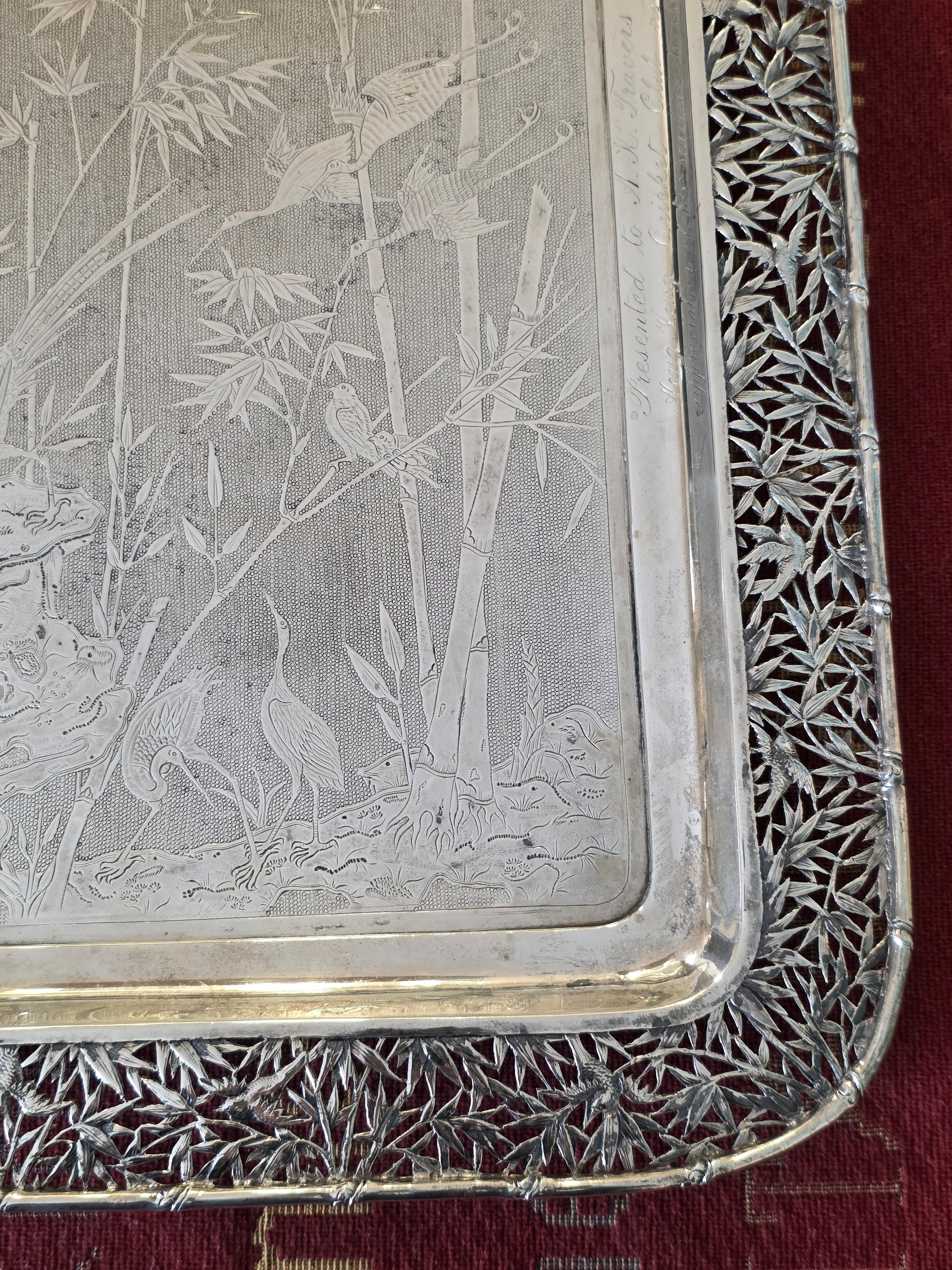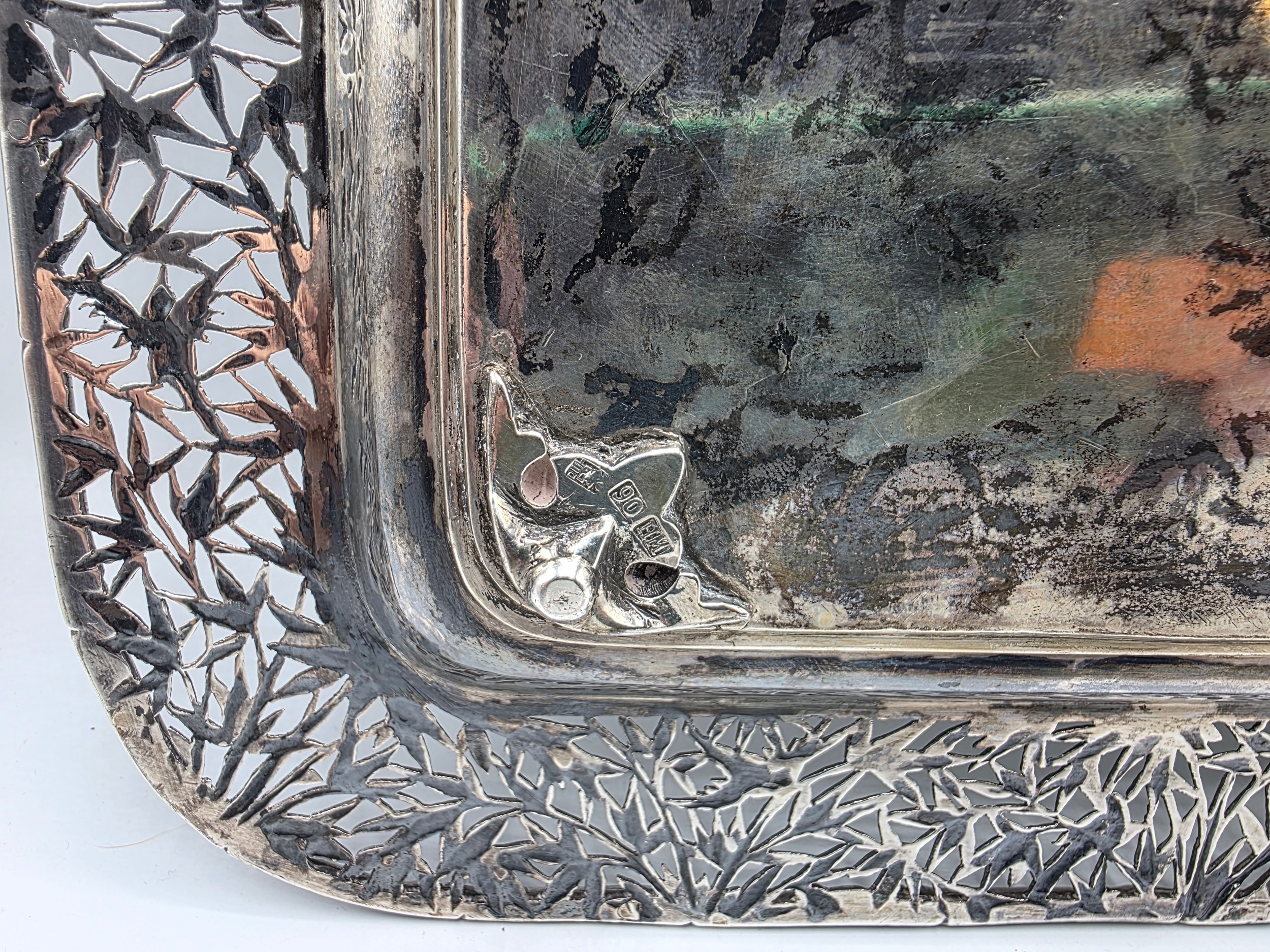 A Hong Kong Chinese silver oblong tray with pierced floral edge and chased flora and fauna decoration 50 cm x 36.5 cm, marked to base HM 90 & Chinese Character mark. 2302 g