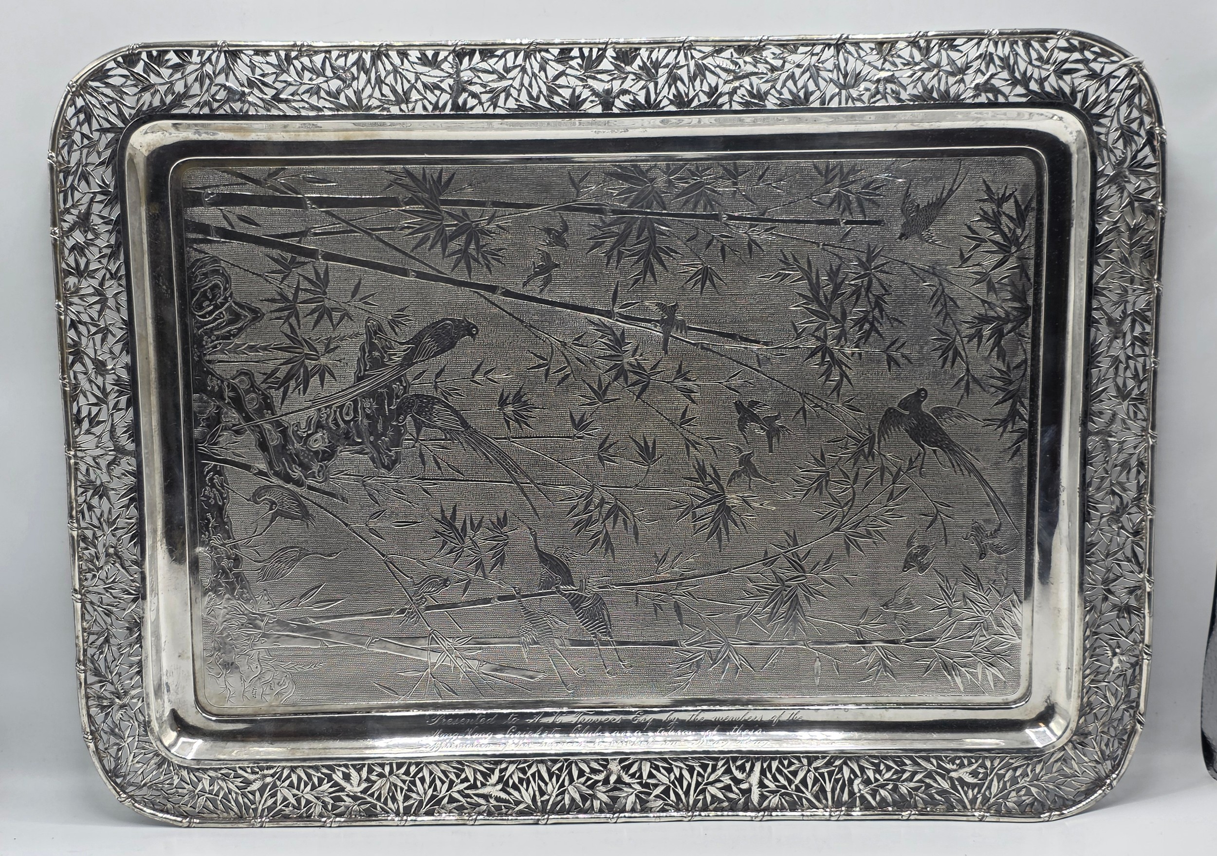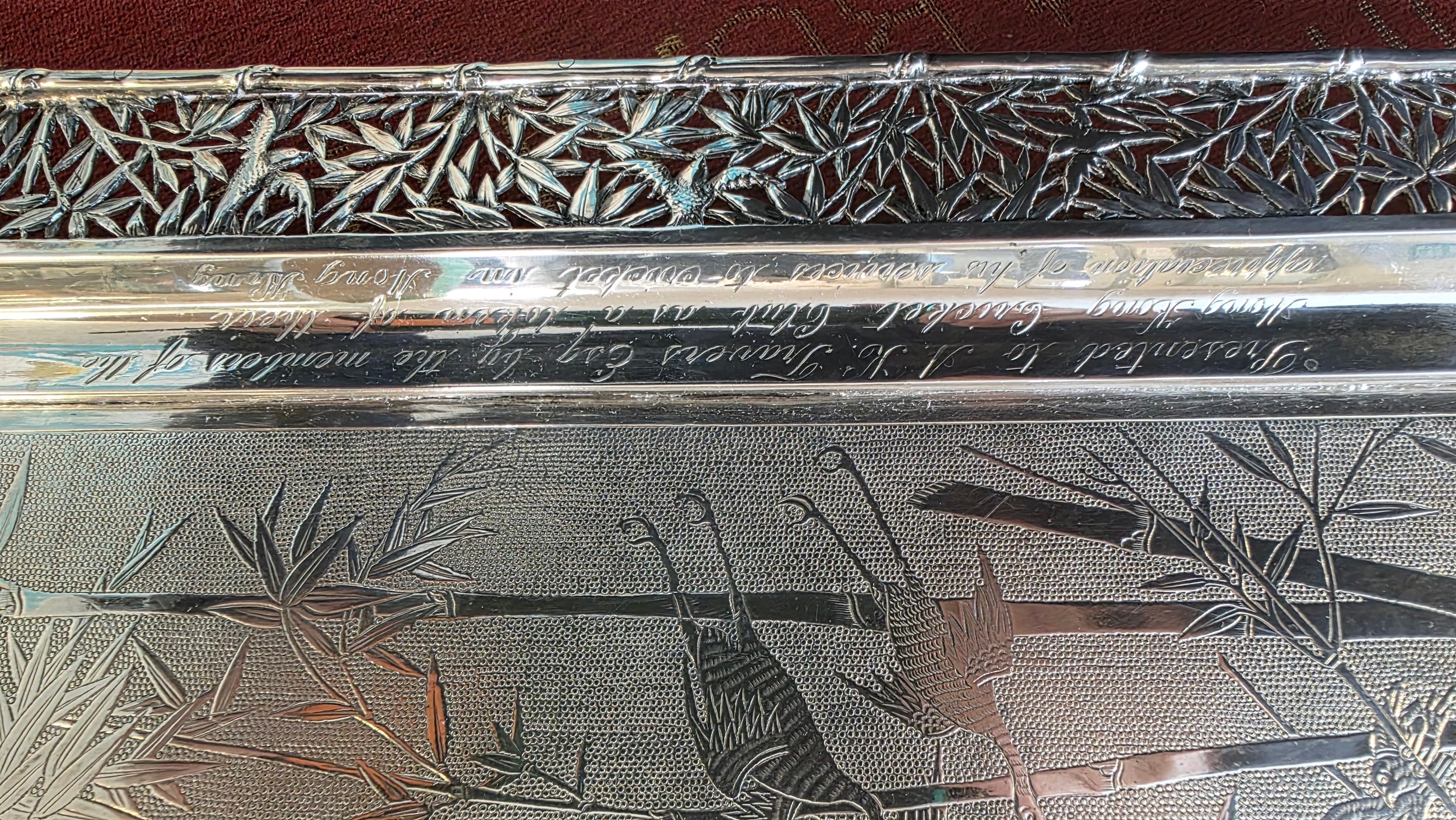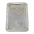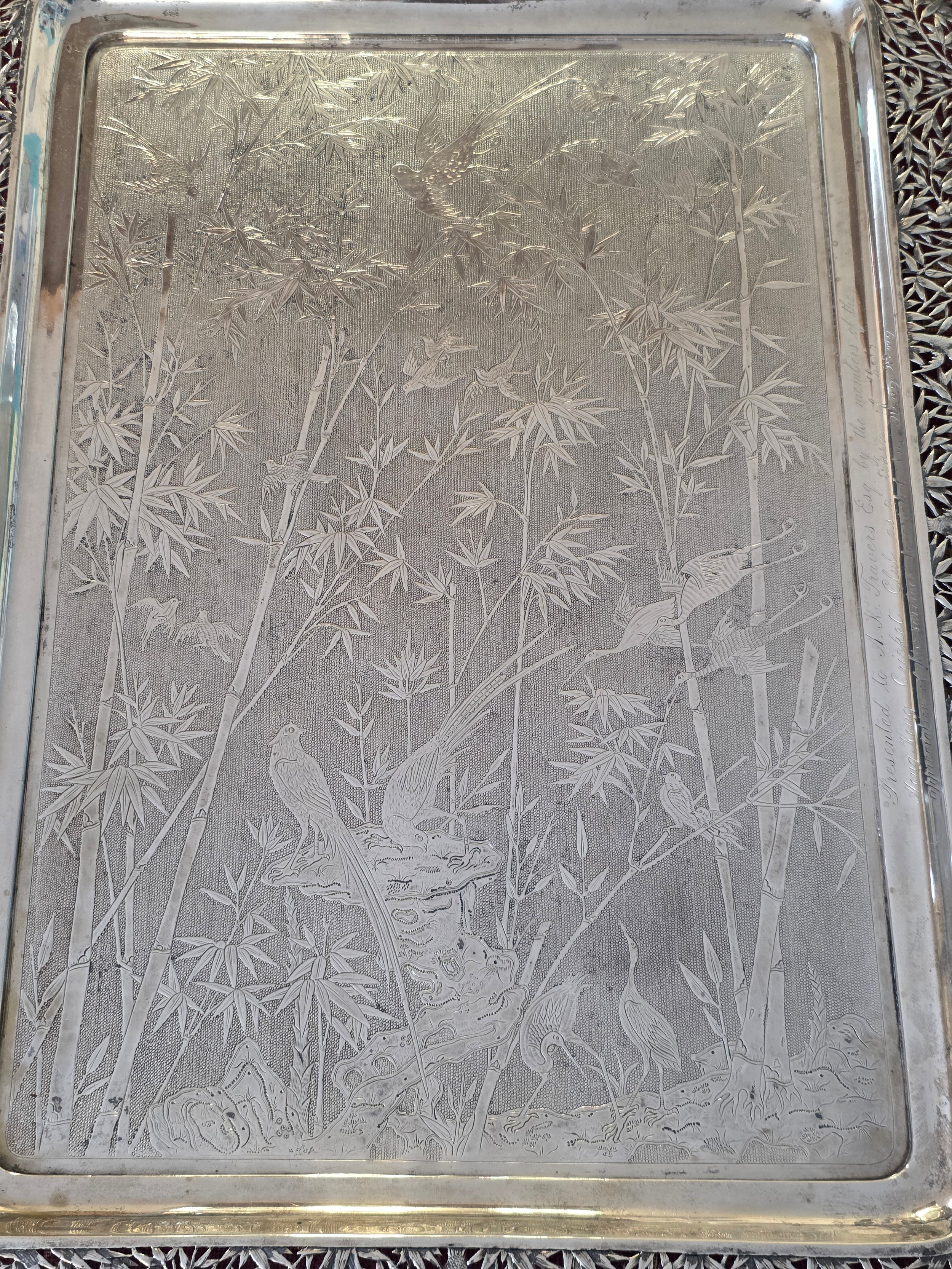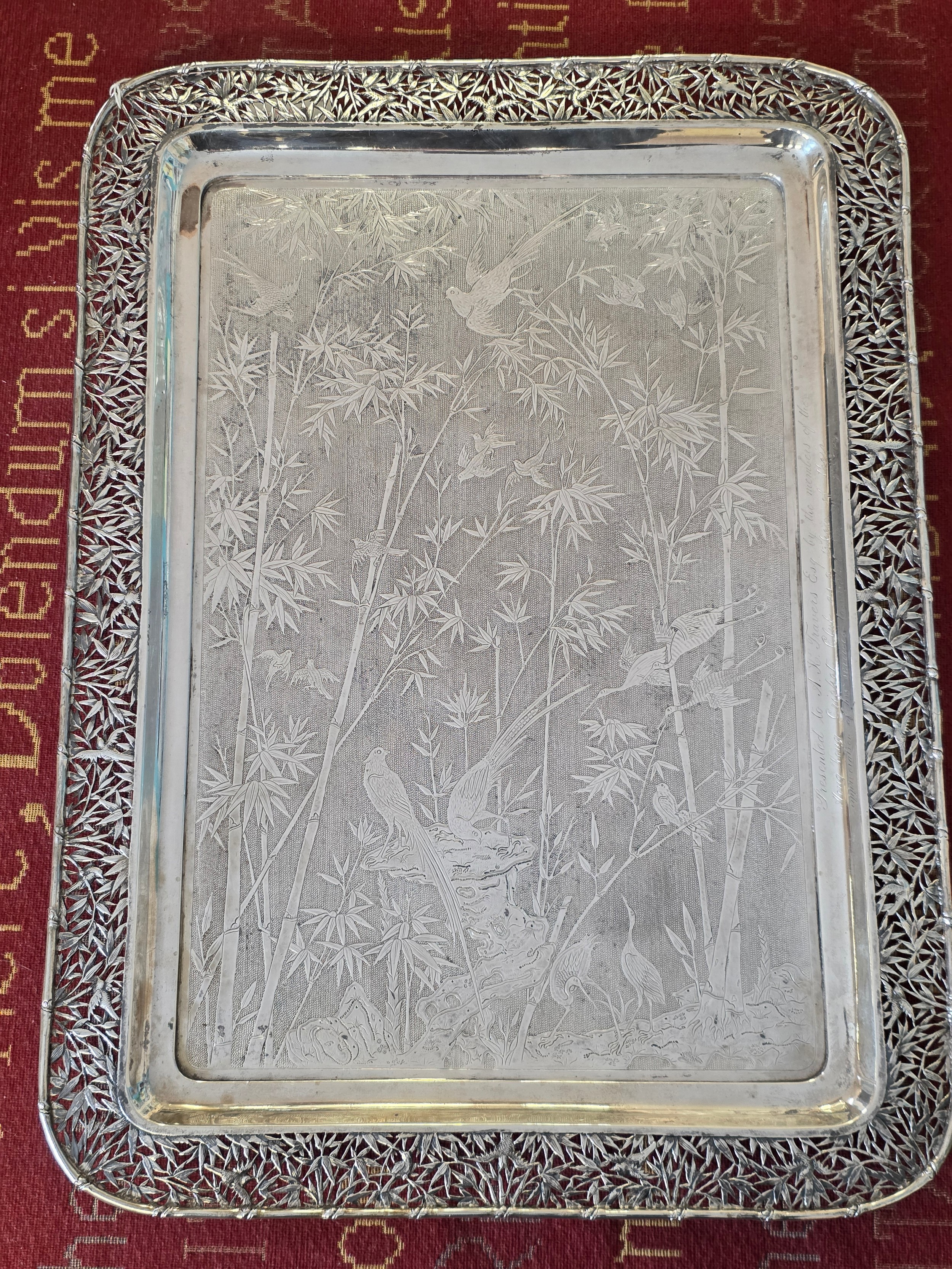 A Hong Kong Chinese silver oblong tray with pierced floral edge and chased flora and fauna decoration 50 cm x 36.5 cm, marked to base HM 90 & Chinese Character mark. 2302 g