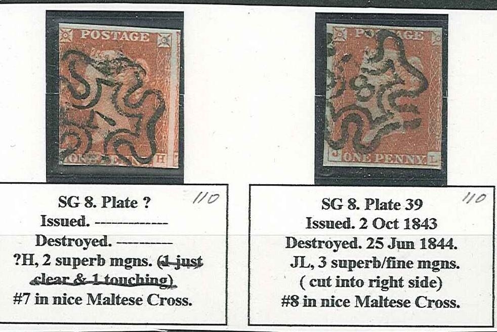 UK; 1841 two Penny Imperfs - one each with "7" and "8" in Maltese Cross cancel. Cat.£320.