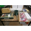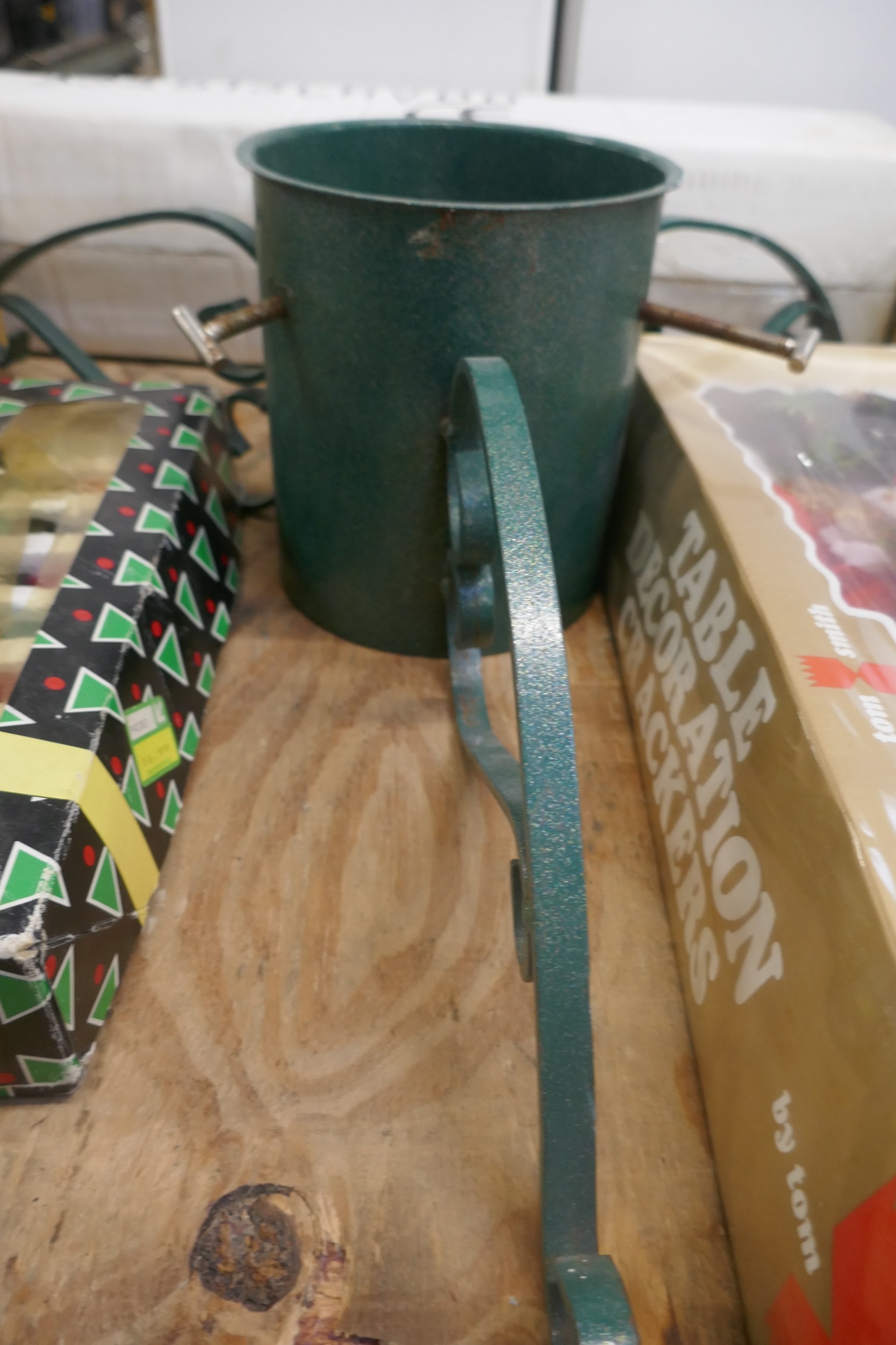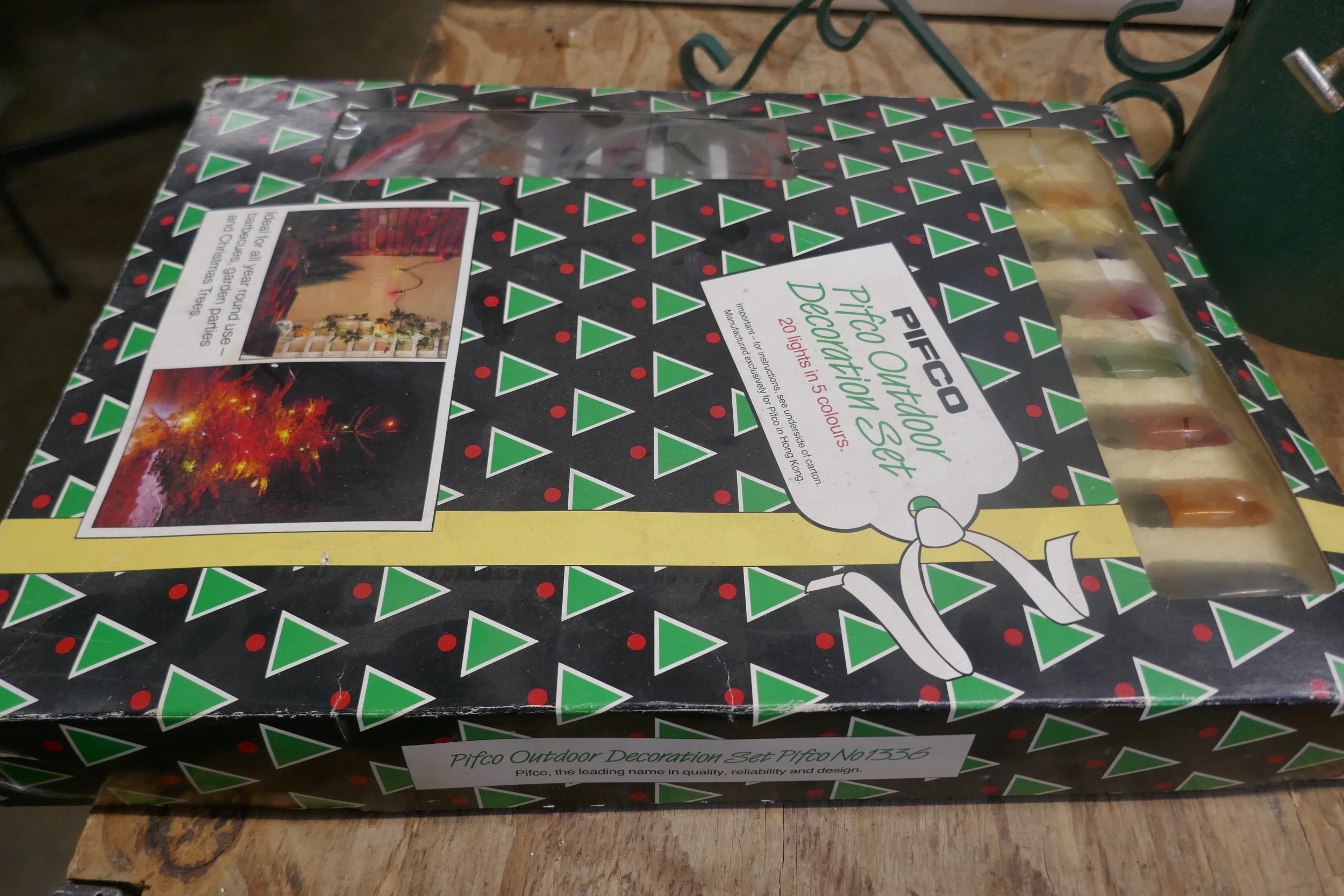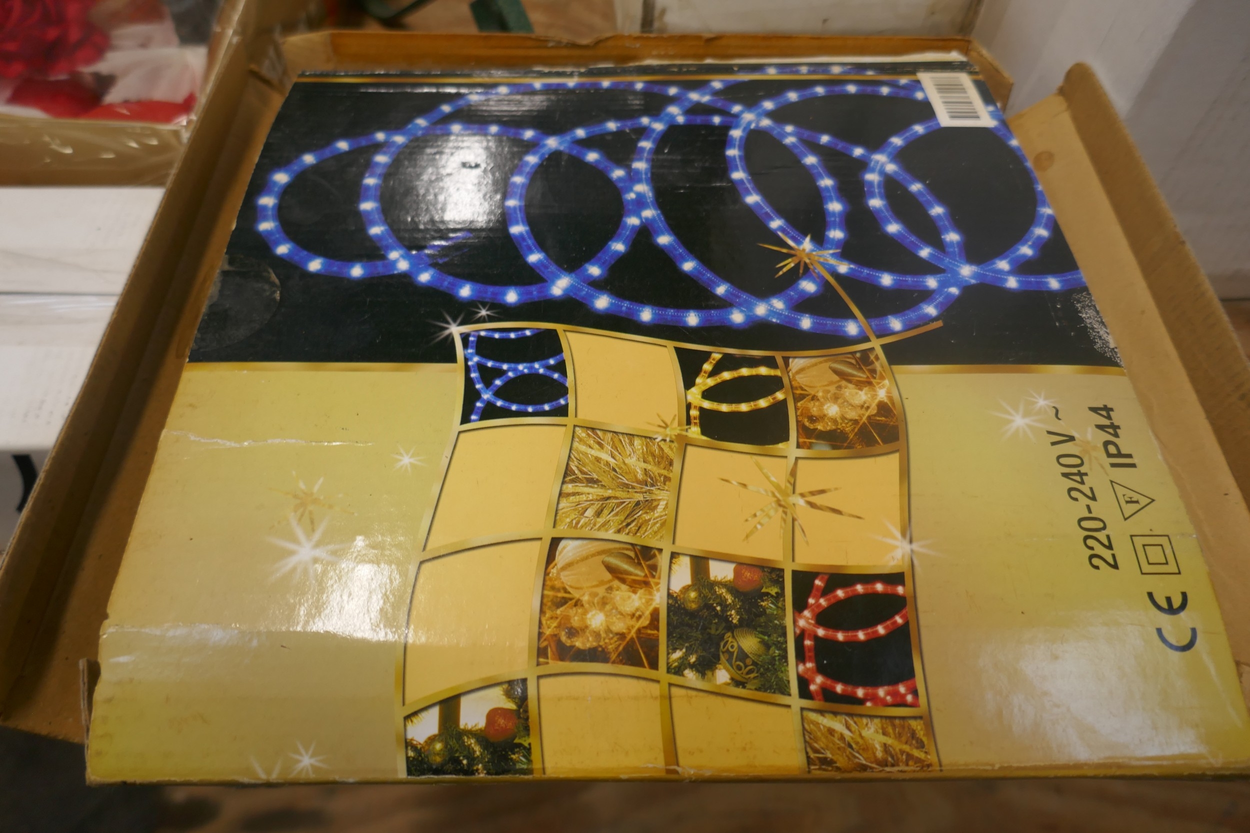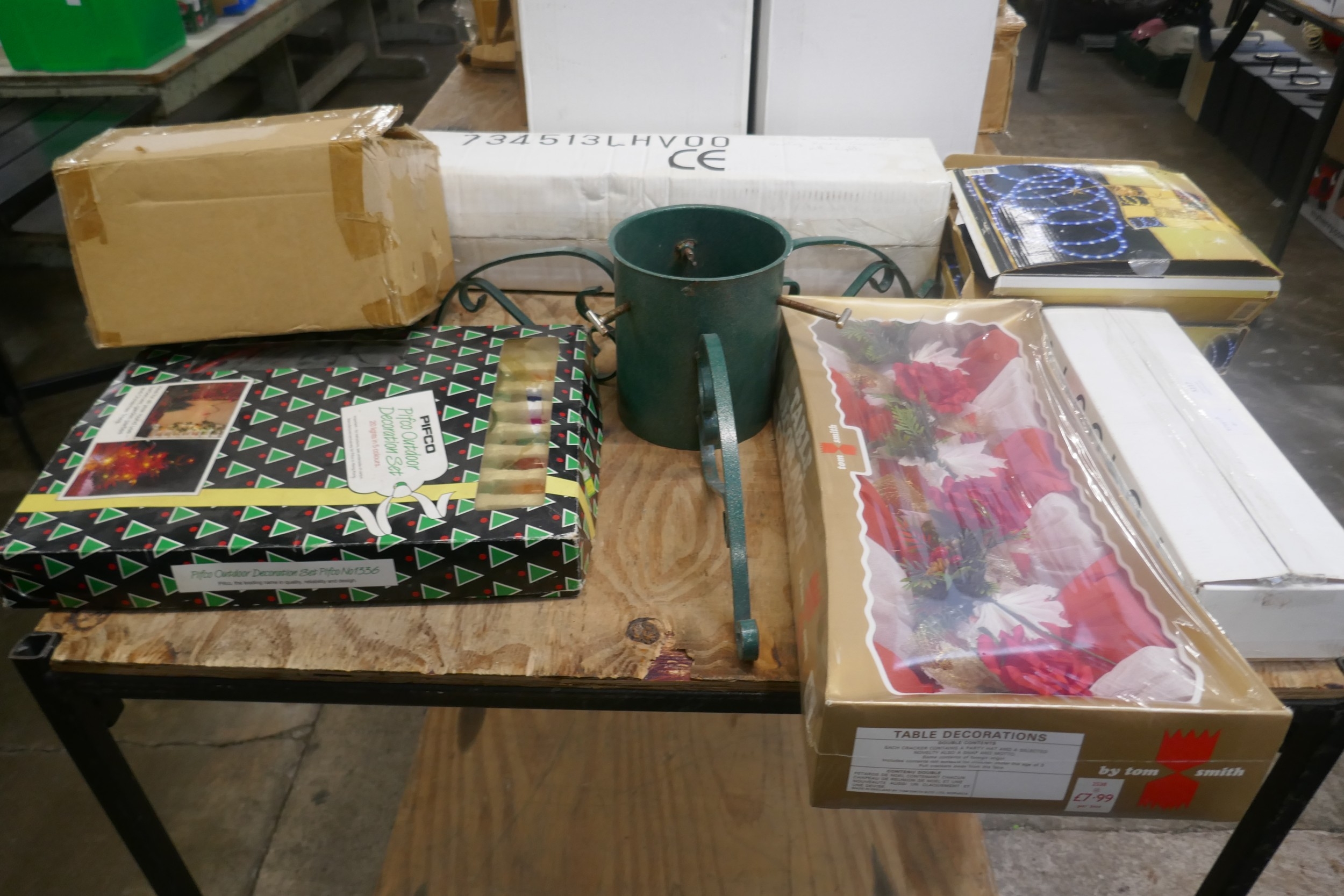A large quantity of Christmas items including string lights, glow up moose, glow up snowman, tree base, etc.