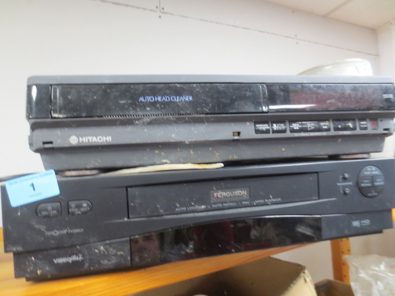 A pair of VHS Video players one is a Ferguson and the other an Hitachi the Hitachi one missing a mains power lead .