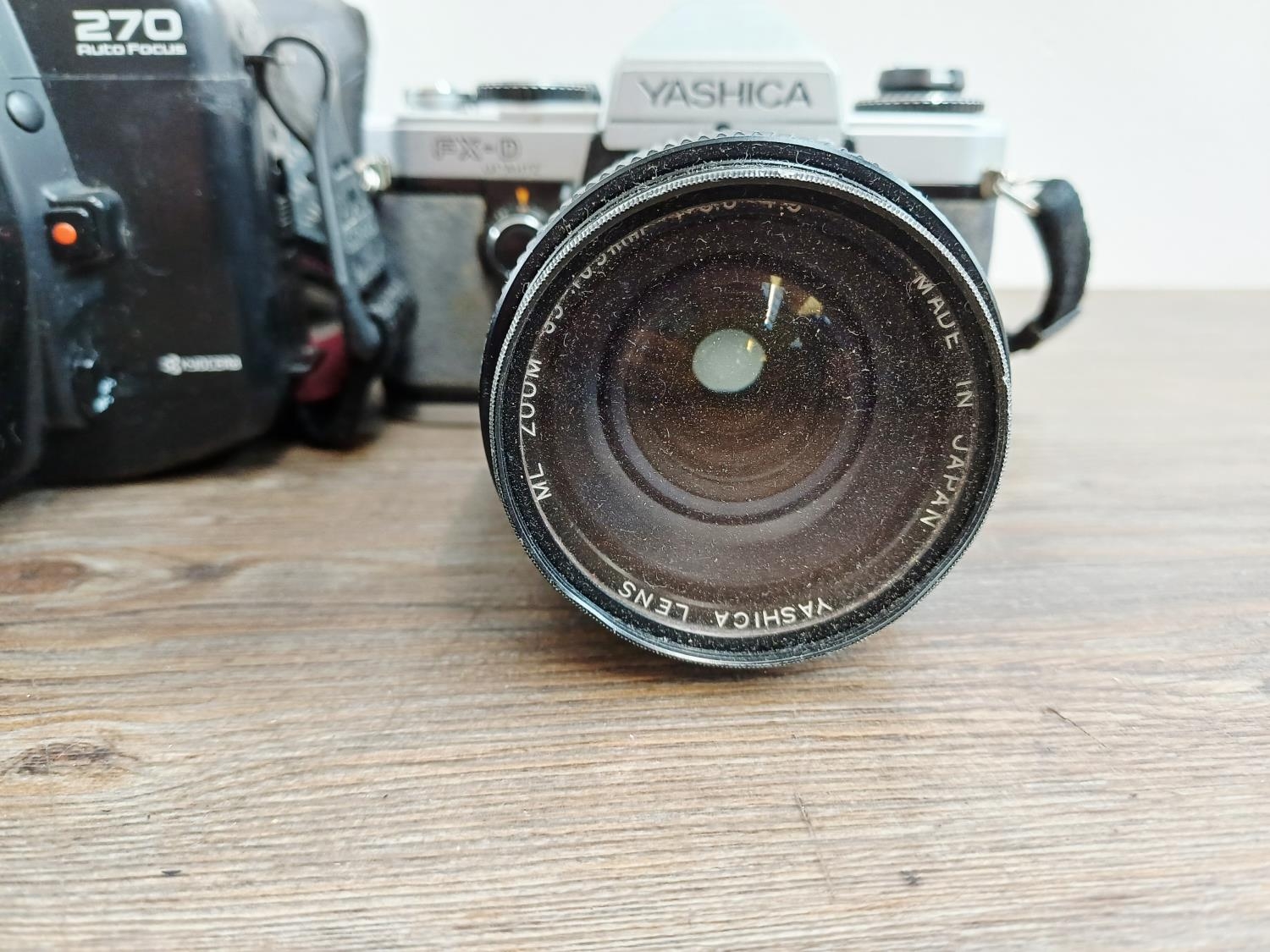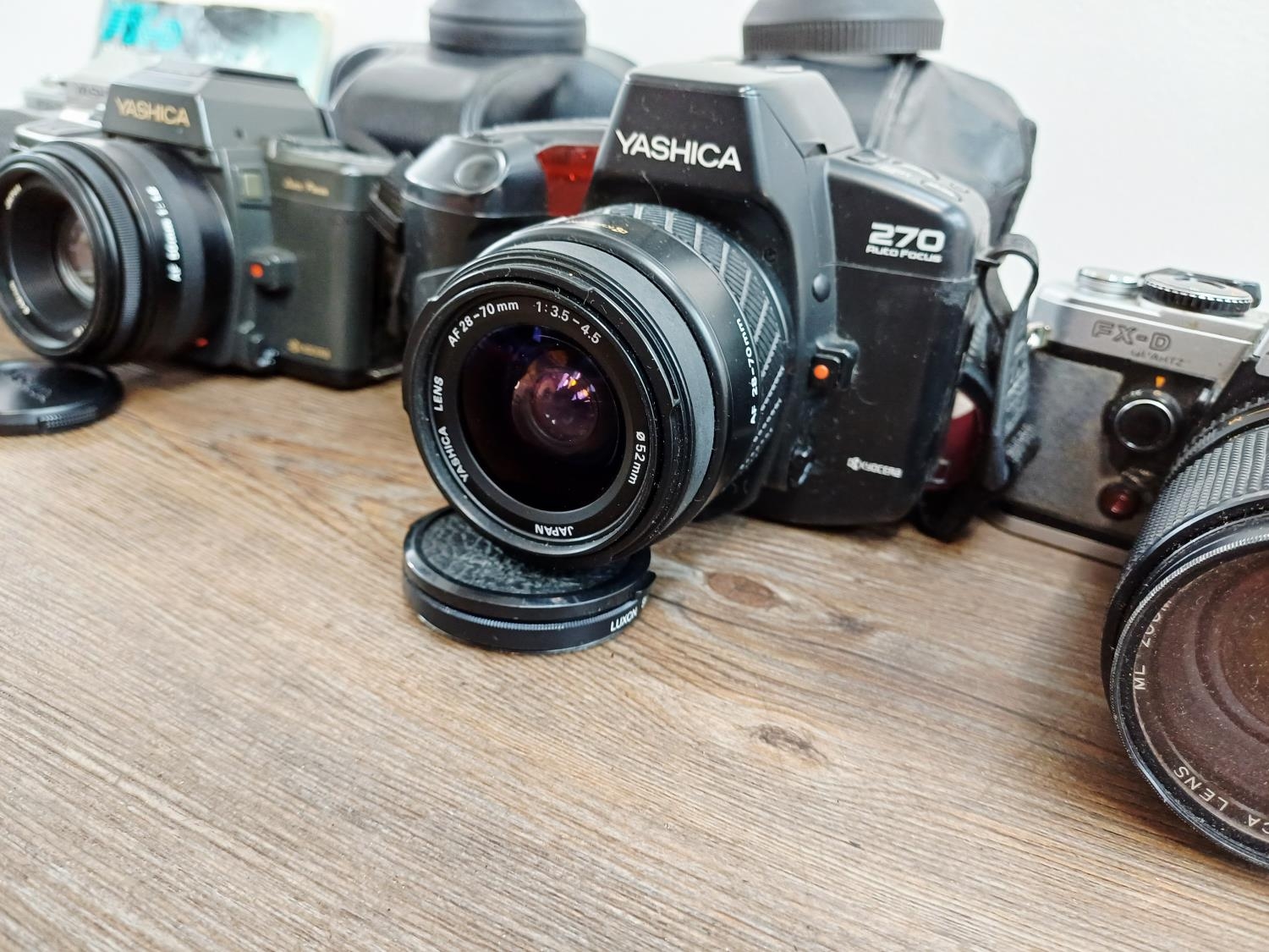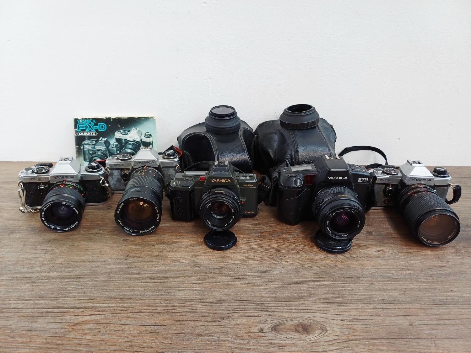 Five Yashica 35mm SLR cameras, three FX-D Quartz C/Y mount, one 270 AF auto-focus Kyocera/Yashica-mount fitted with 1:1.8 50mm lens and one 230 AF auto-focus Kyocera/Yashica-mount fitted with 1:3.5-4.5 28-70mm lens