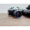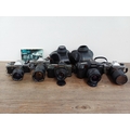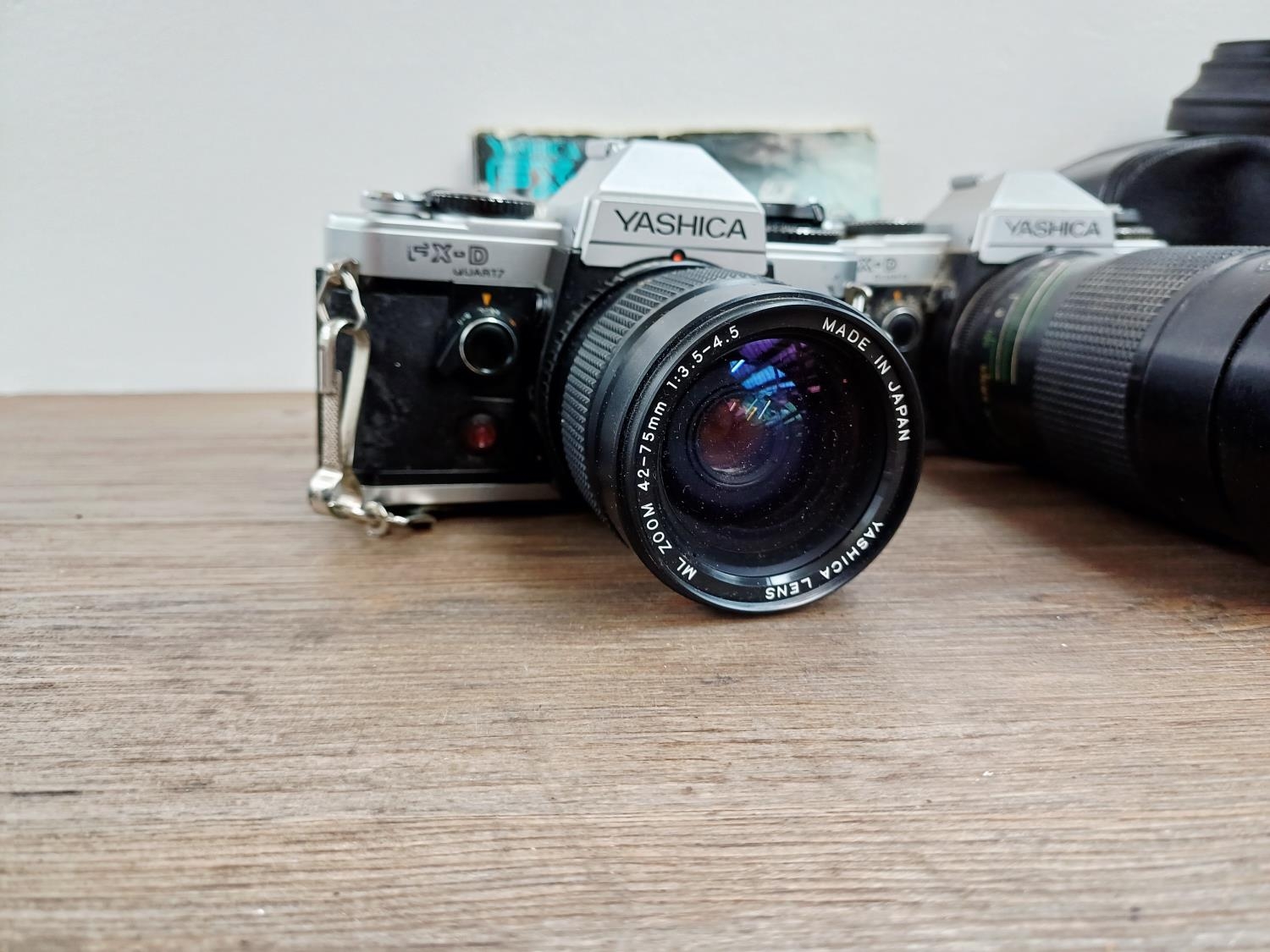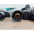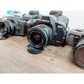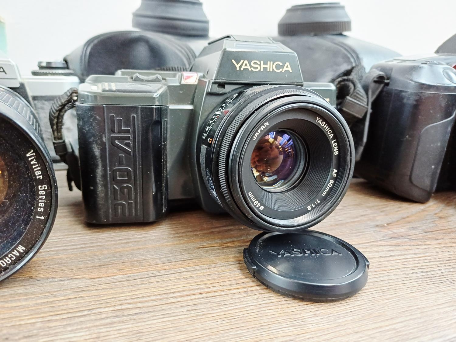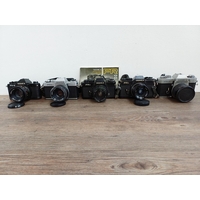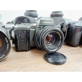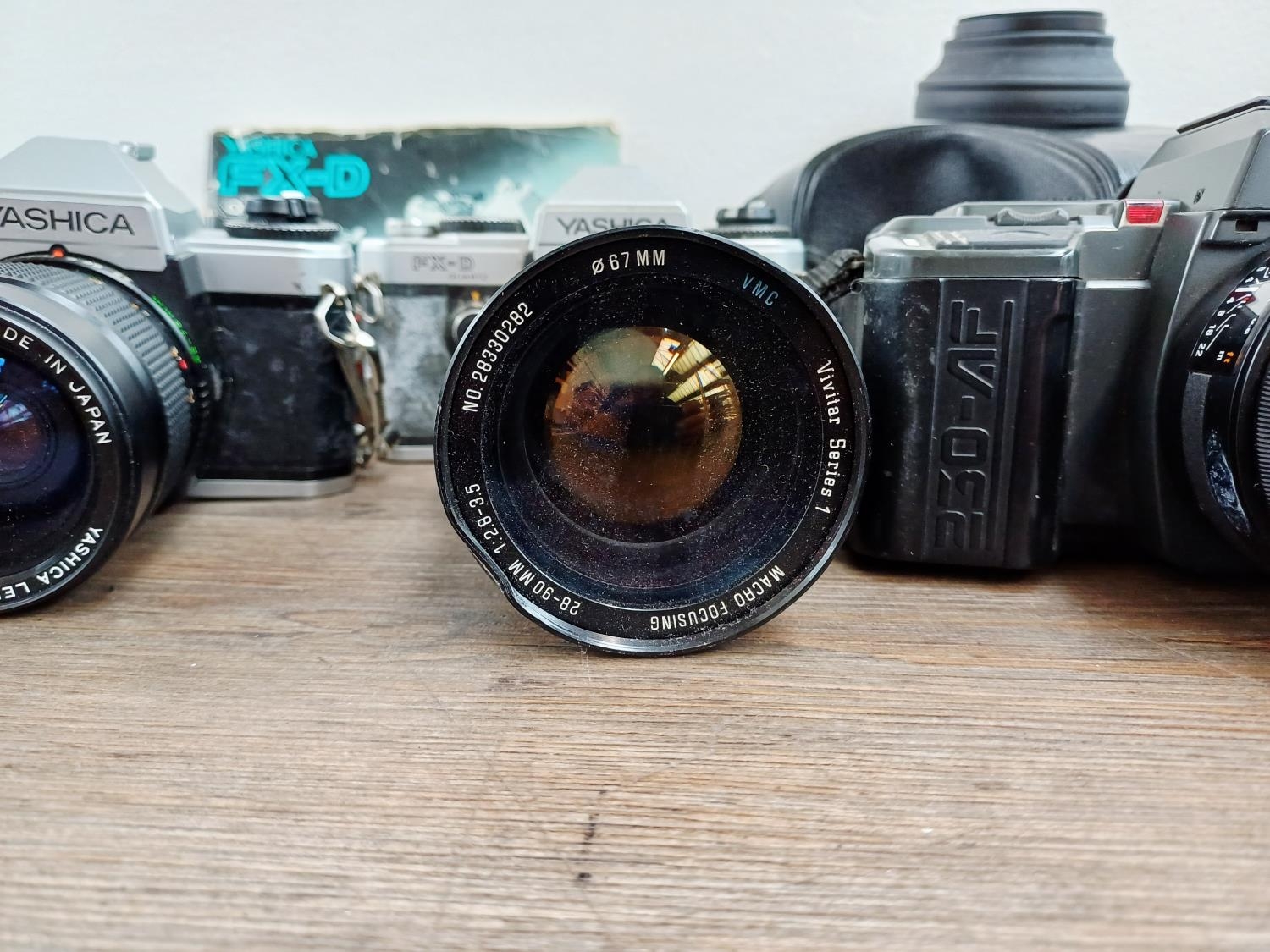Five Yashica 35mm SLR cameras, three FX-D Quartz C/Y mount, one 270 AF auto-focus Kyocera/Yashica-mount fitted with 1:1.8 50mm lens and one 230 AF auto-focus Kyocera/Yashica-mount fitted with 1:3.5-4.5 28-70mm lens