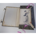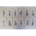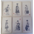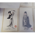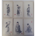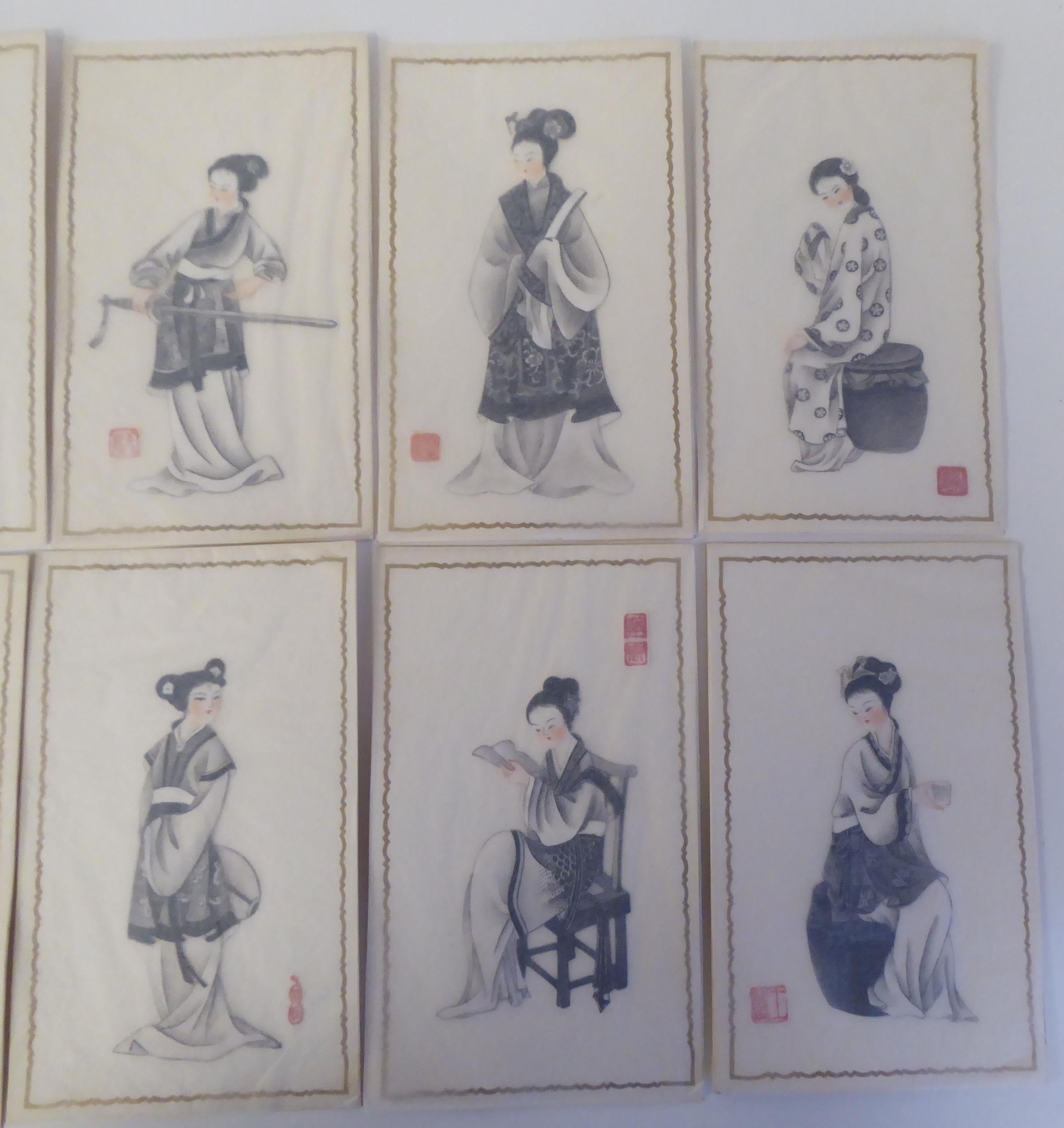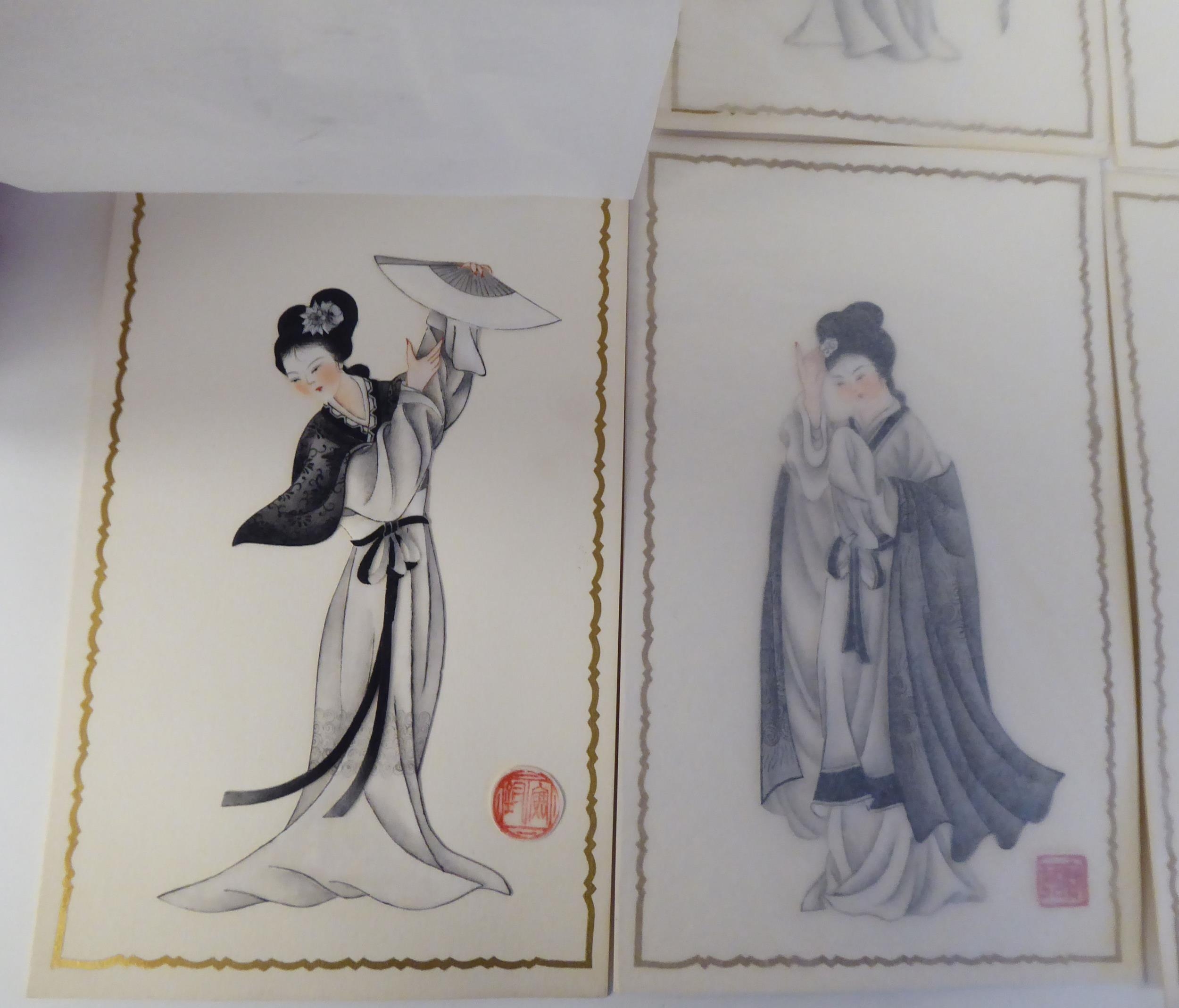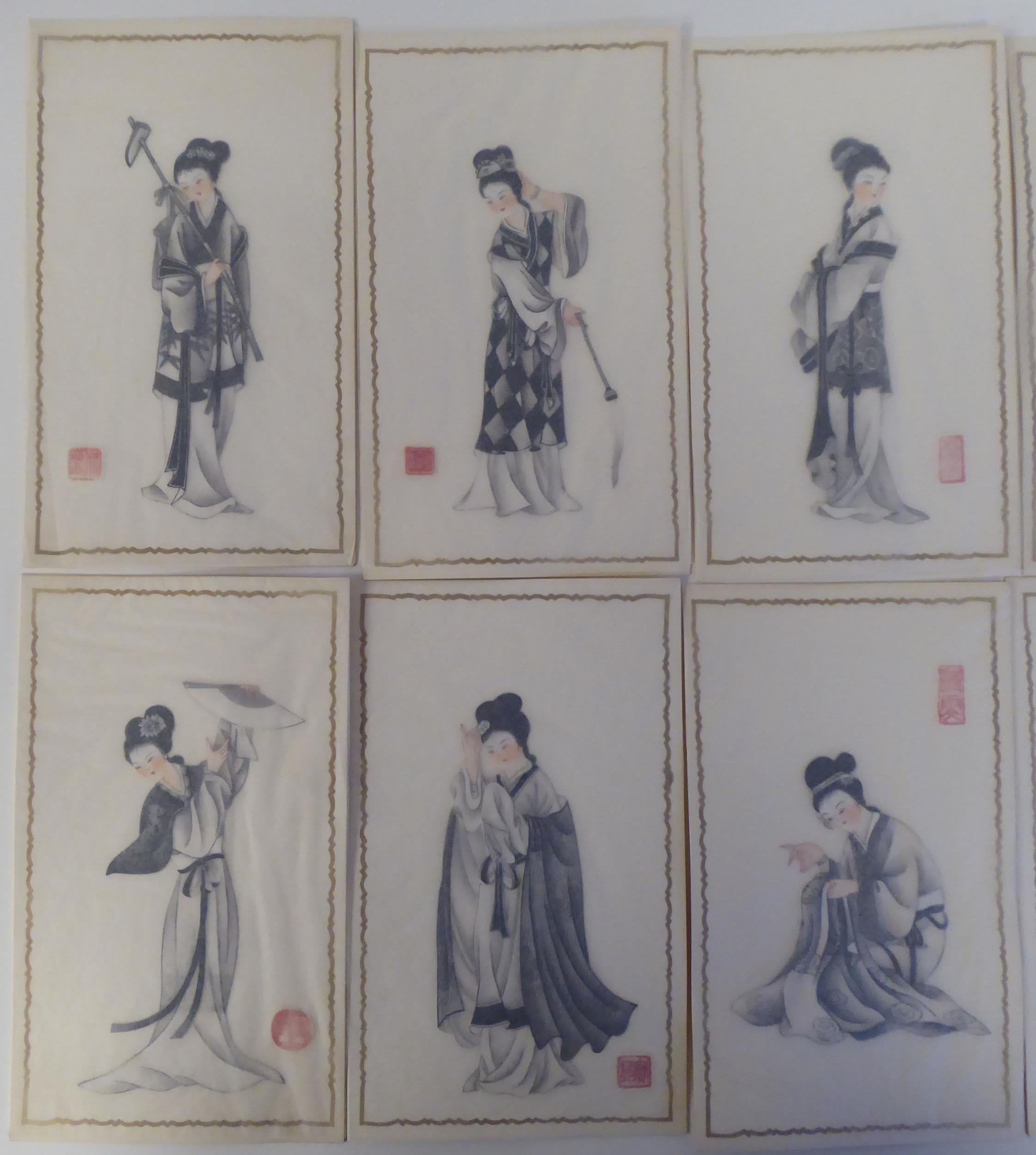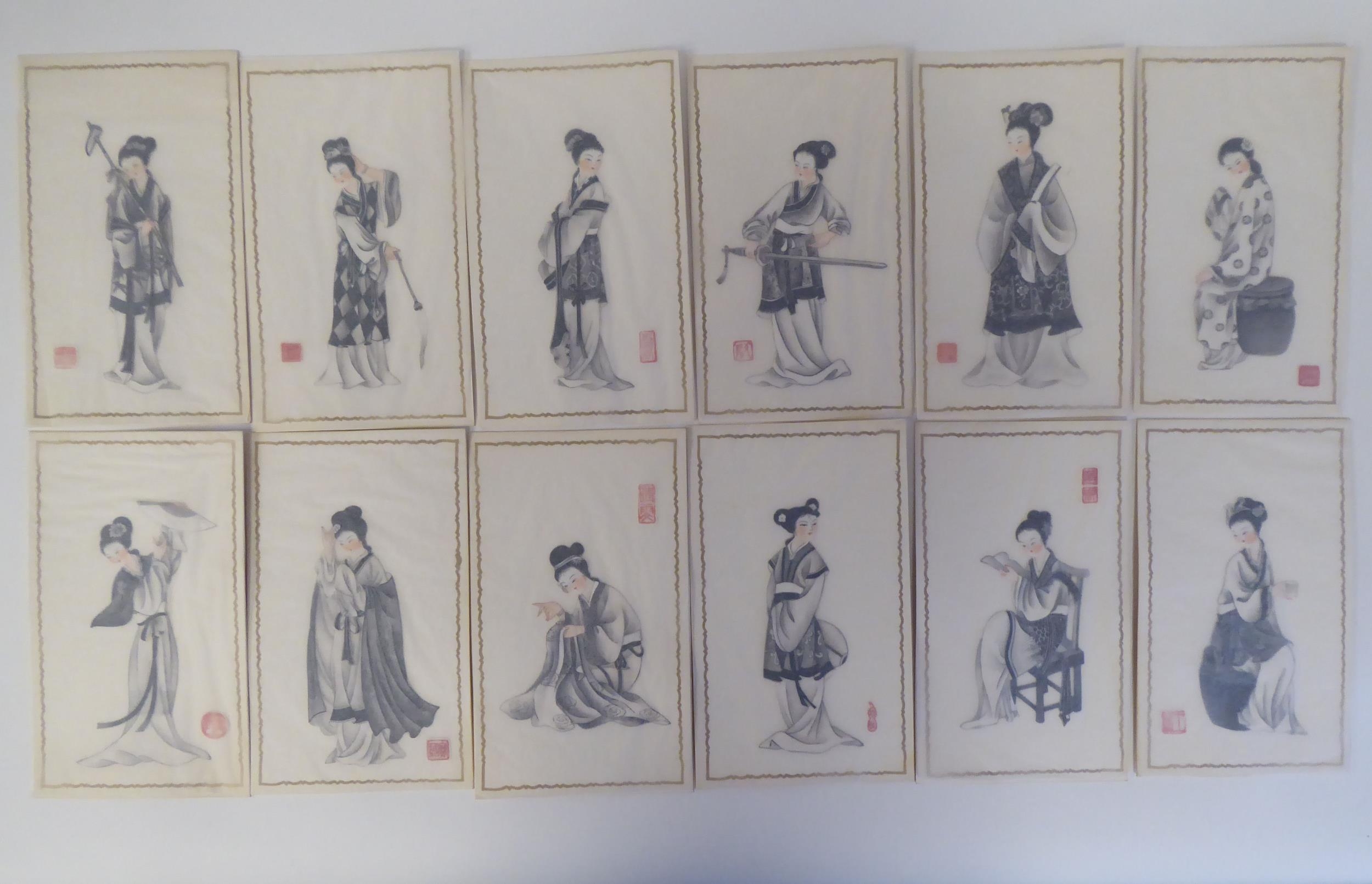 A series of twelve 20thC Chinese figure studies - young women, displaying fashionable costumes watercolour mounted on card with red seal marks 7.5" x 4.5" in a patterned, ribbon tied, fabric covered folio