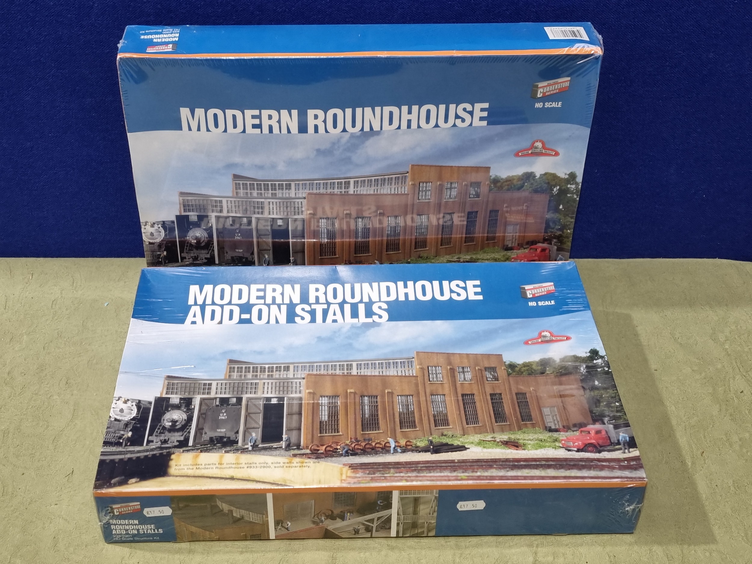 A boxed Walthers Cornerstone 933-2900 Modern Roundhouse and 933-2901 Modern Roundhouse Add-on Stalls, both sealed from new