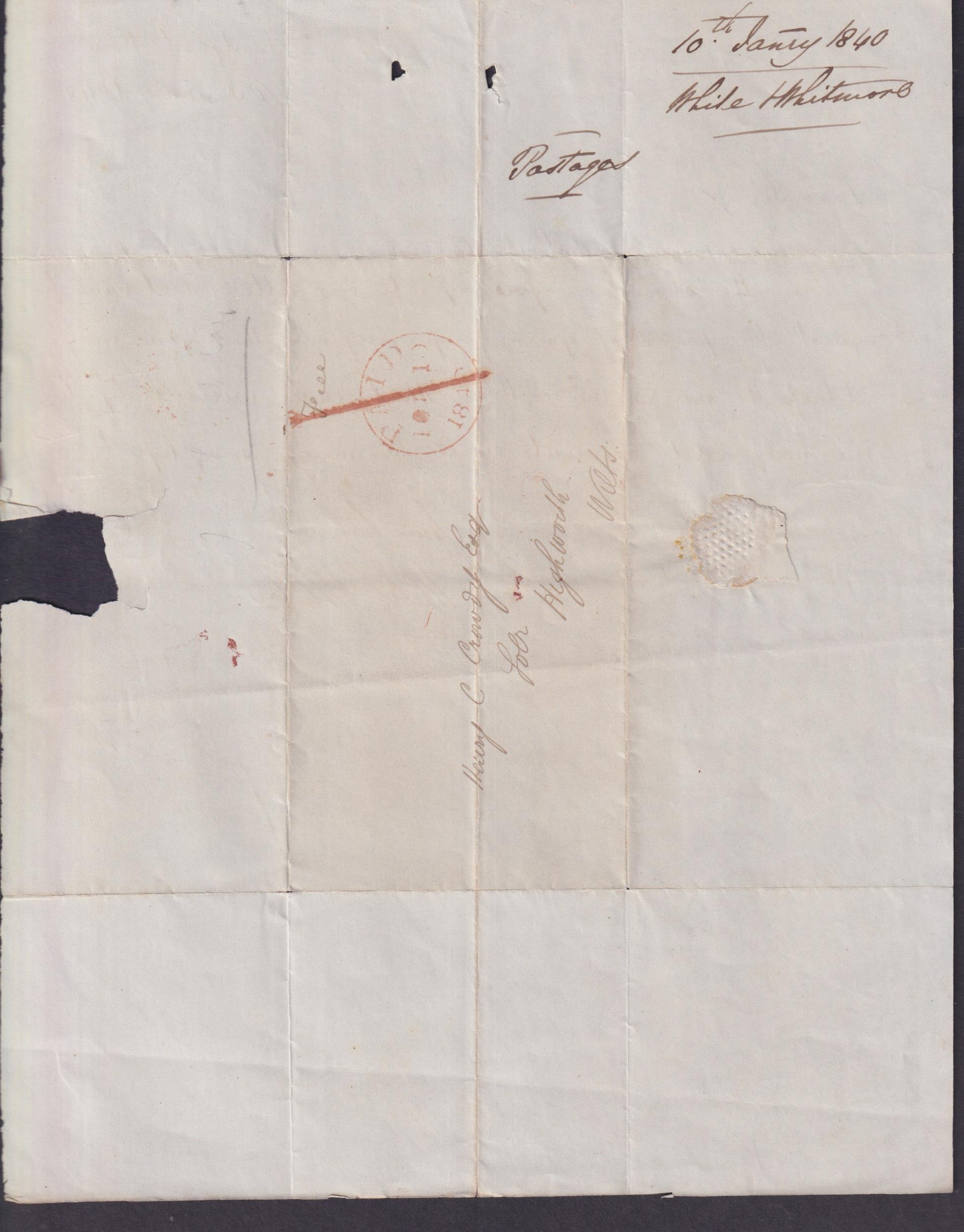 1840 First day of Uniform Penny Postage entire to Highworth, Wilts, with fine ‘Paid Jan 10 1840’ circle and handstruck ‘1’ each in red. A fine example of this scarce pre-stamp item.