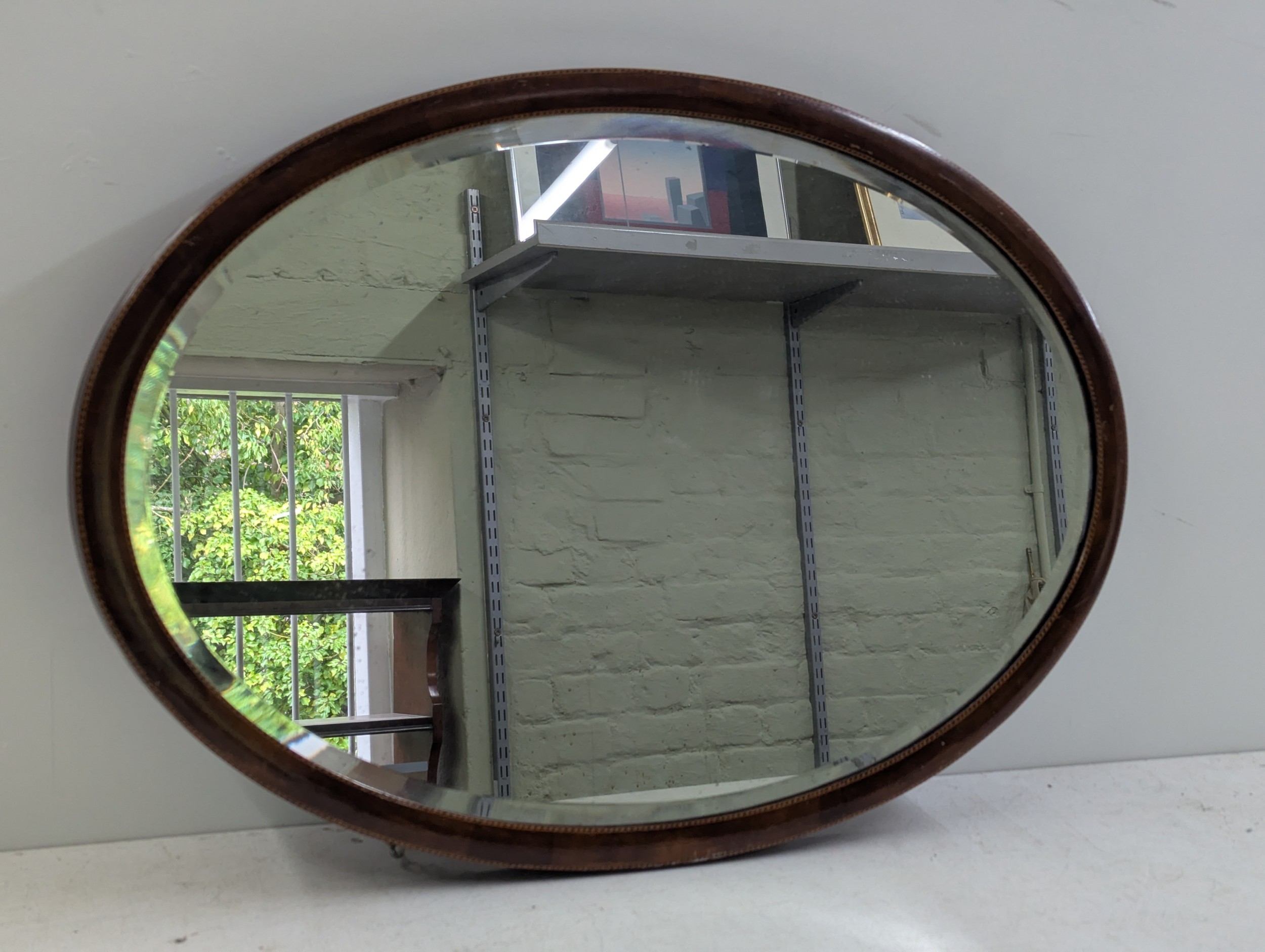 An Edwardian oval wall mirror with an inlaid mahogany frame 81 x 55cm Location: RWB