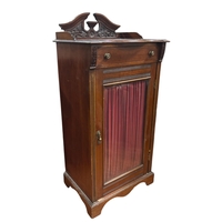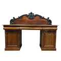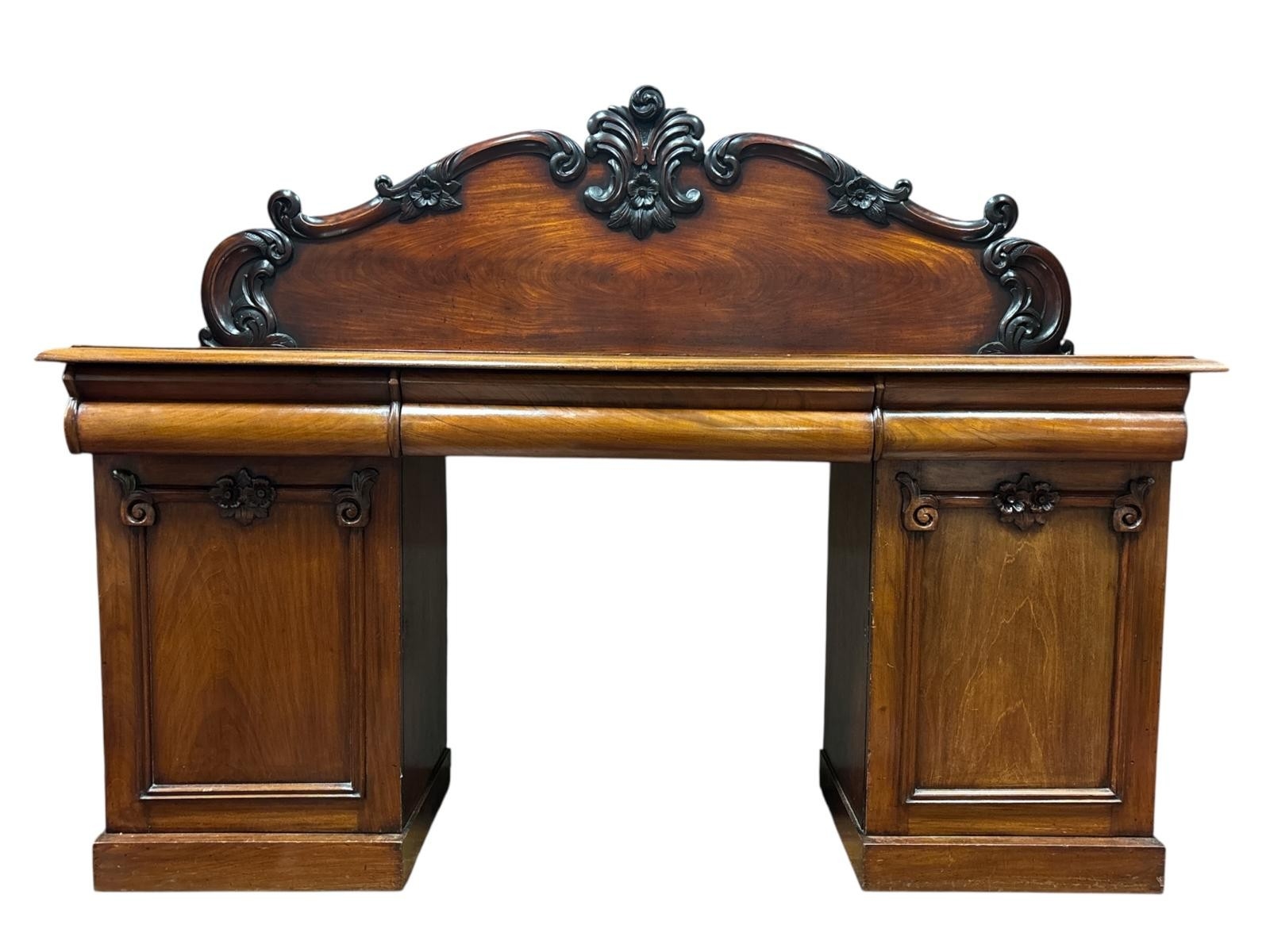 A VICTORIAN MAHOGANY PEDESTAL SIDEBOARD the serpentine shaped back with applied foliate and scroll decoration above three frieze drawers and cupboards on platform support 150cm (h) x 190cm (w) x 60cm (d)