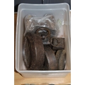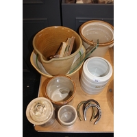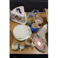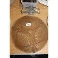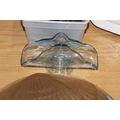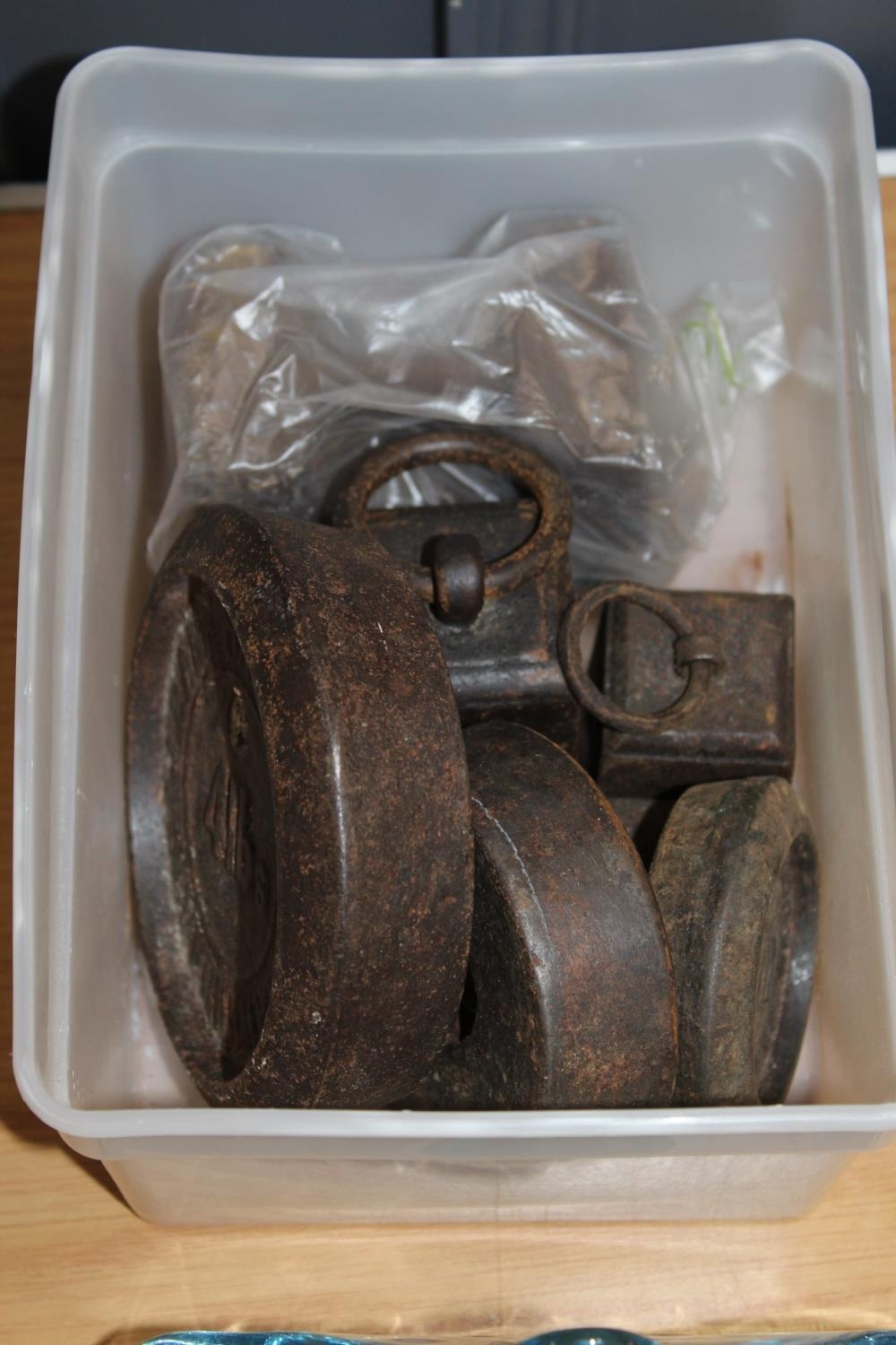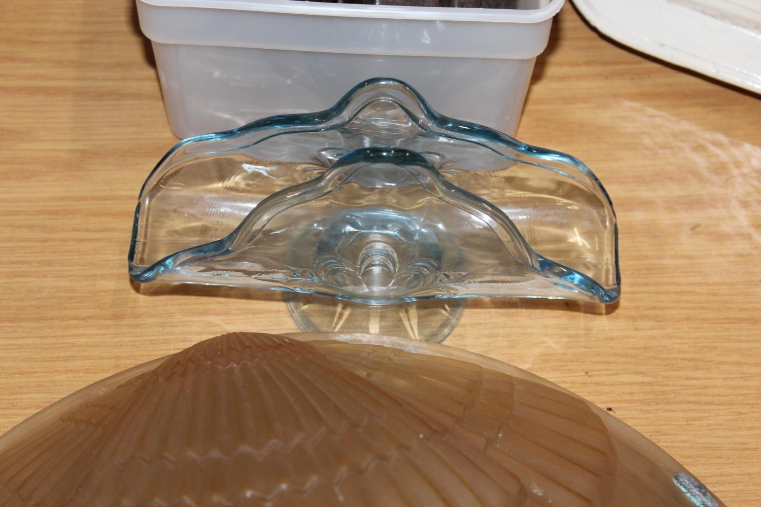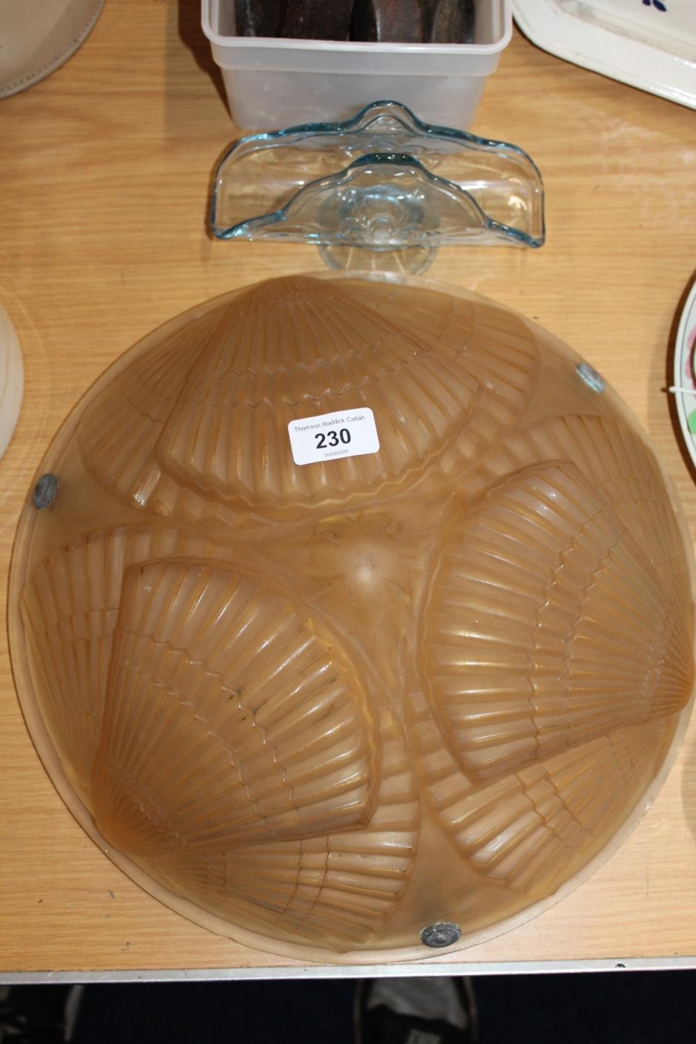 French style frosted glass ceiling light shade with fan decoration, a moulded blue glass letter stand and a box of weights.