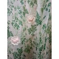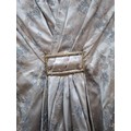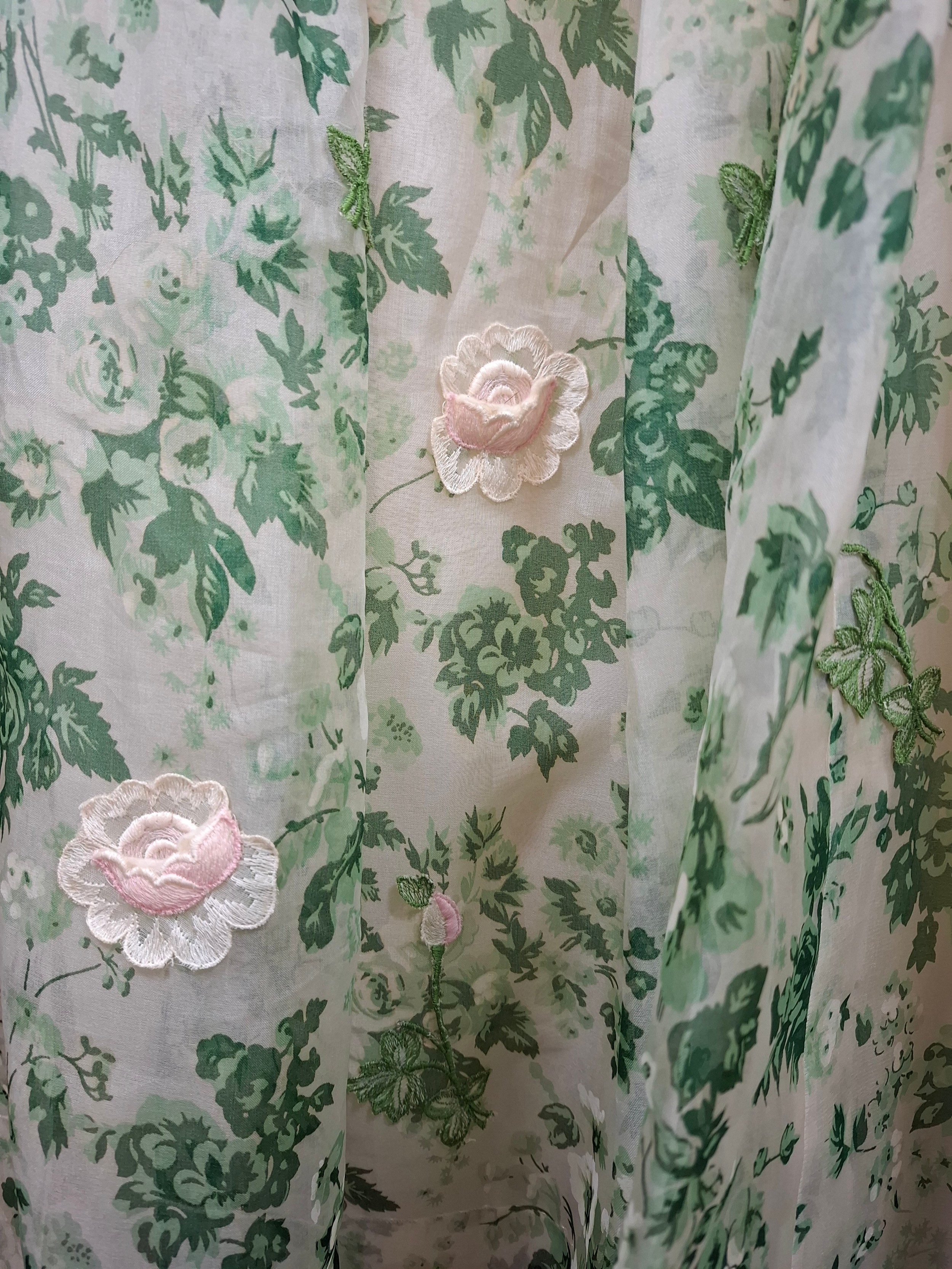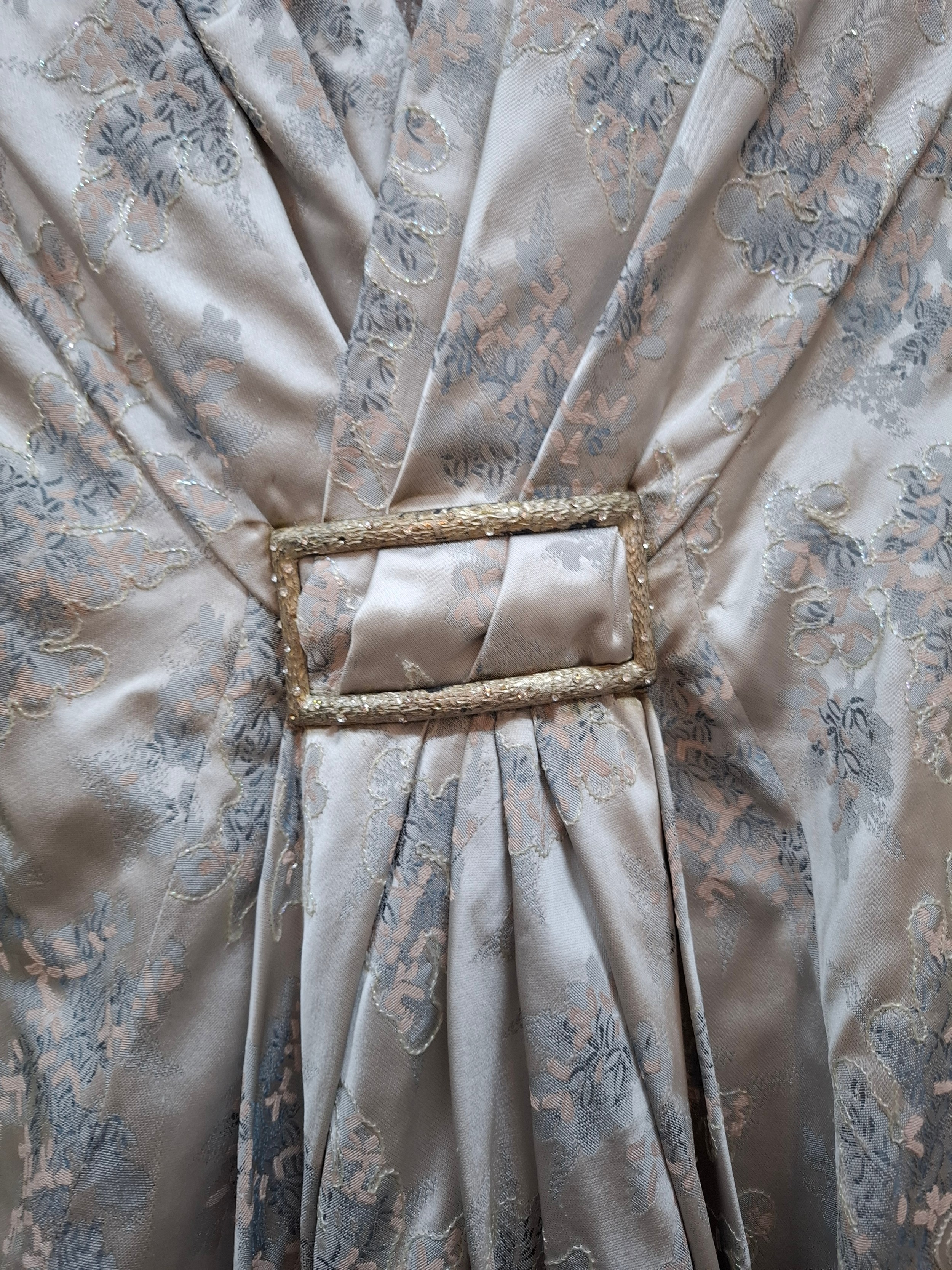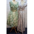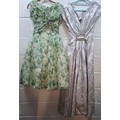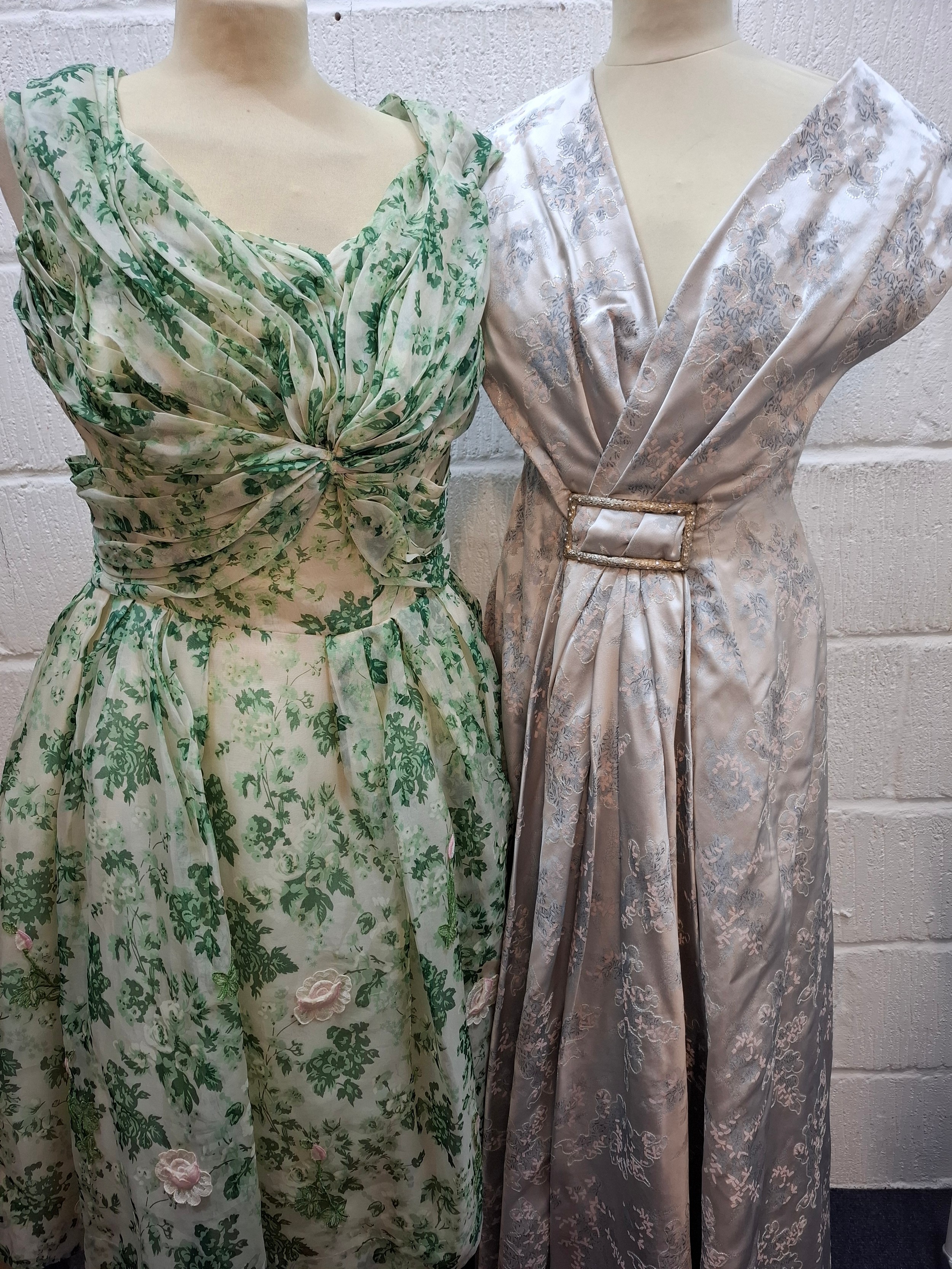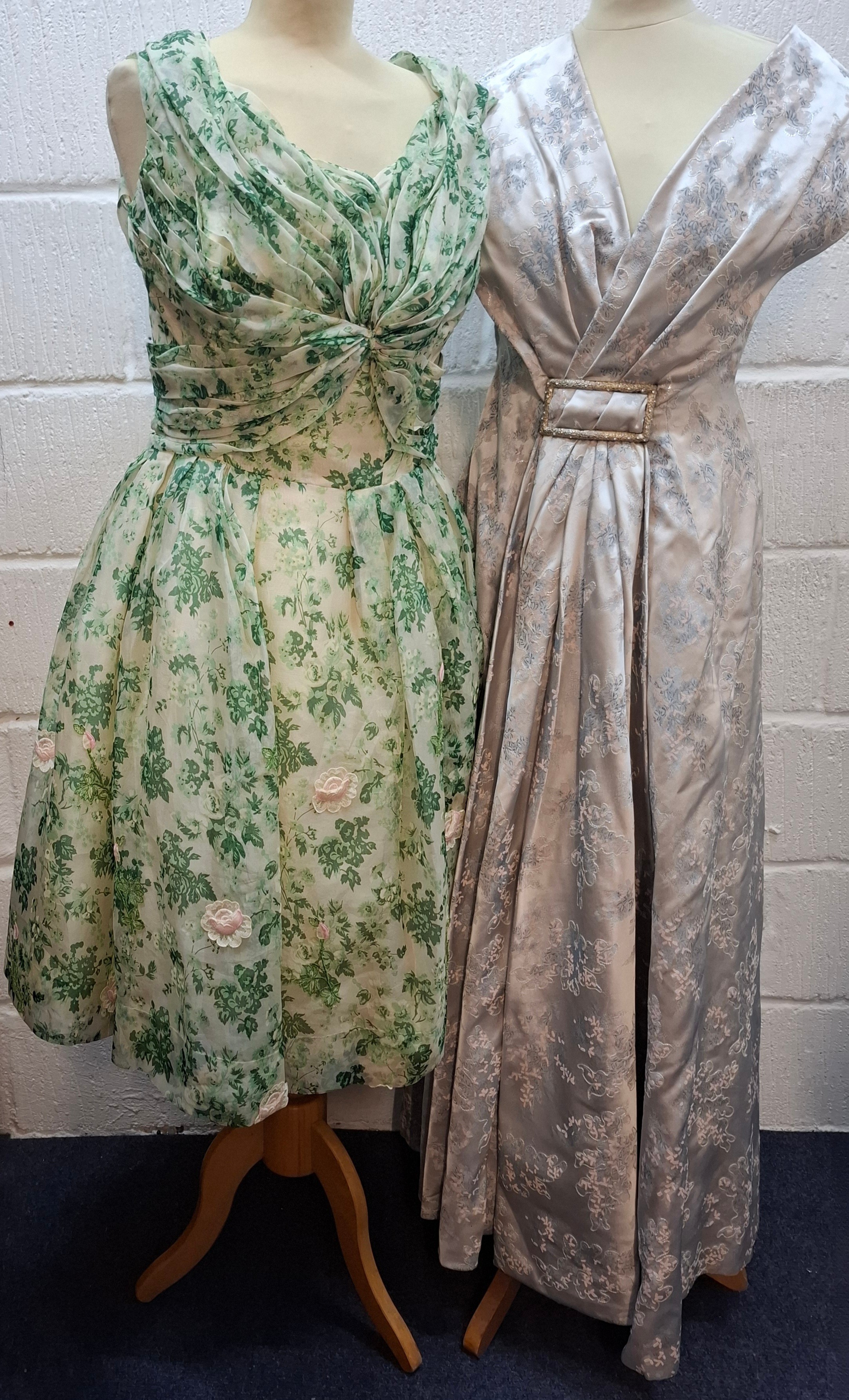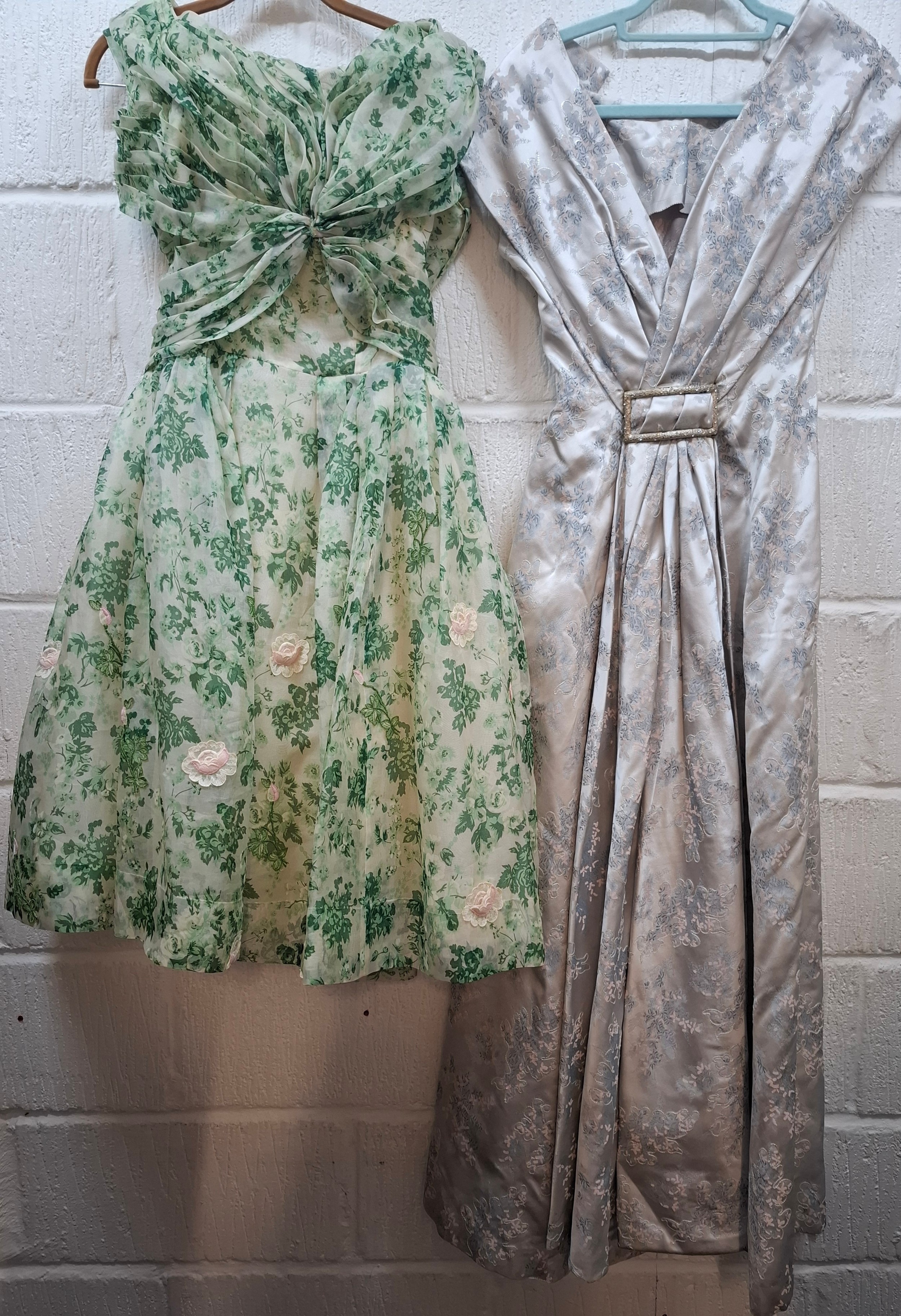 Two vintage dresses comprising a mid 20th Century Forelle Cappa green netted tea length dress A/F with gathered skirt decorated with applique pink flowers approx 30/32" chest and a silver brocade full length dress with silver tone buckle to the waist approx 30/32" chest. Location:Rail