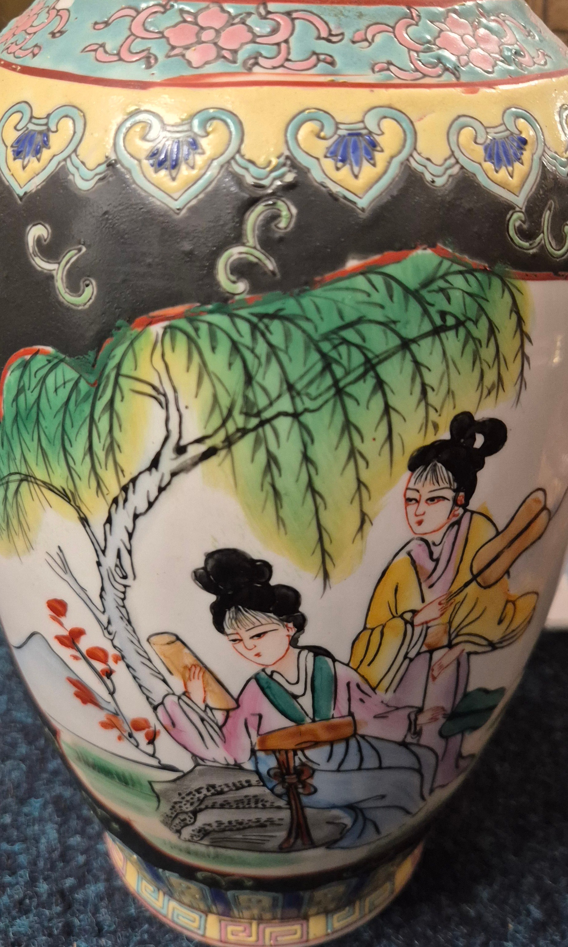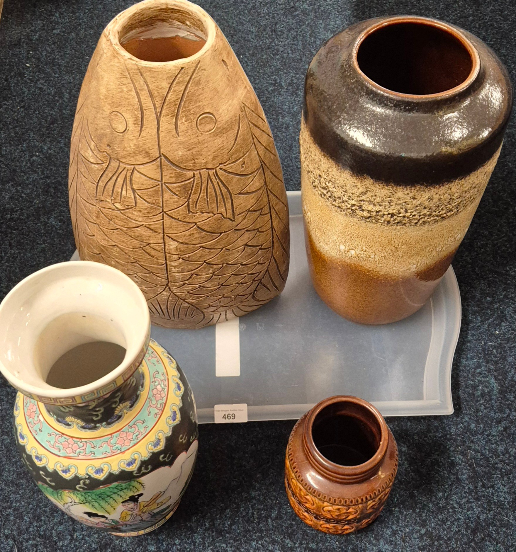 Tray of collectables; Pottery fish design vase, Two West German pottery vases and Chinese vase.