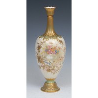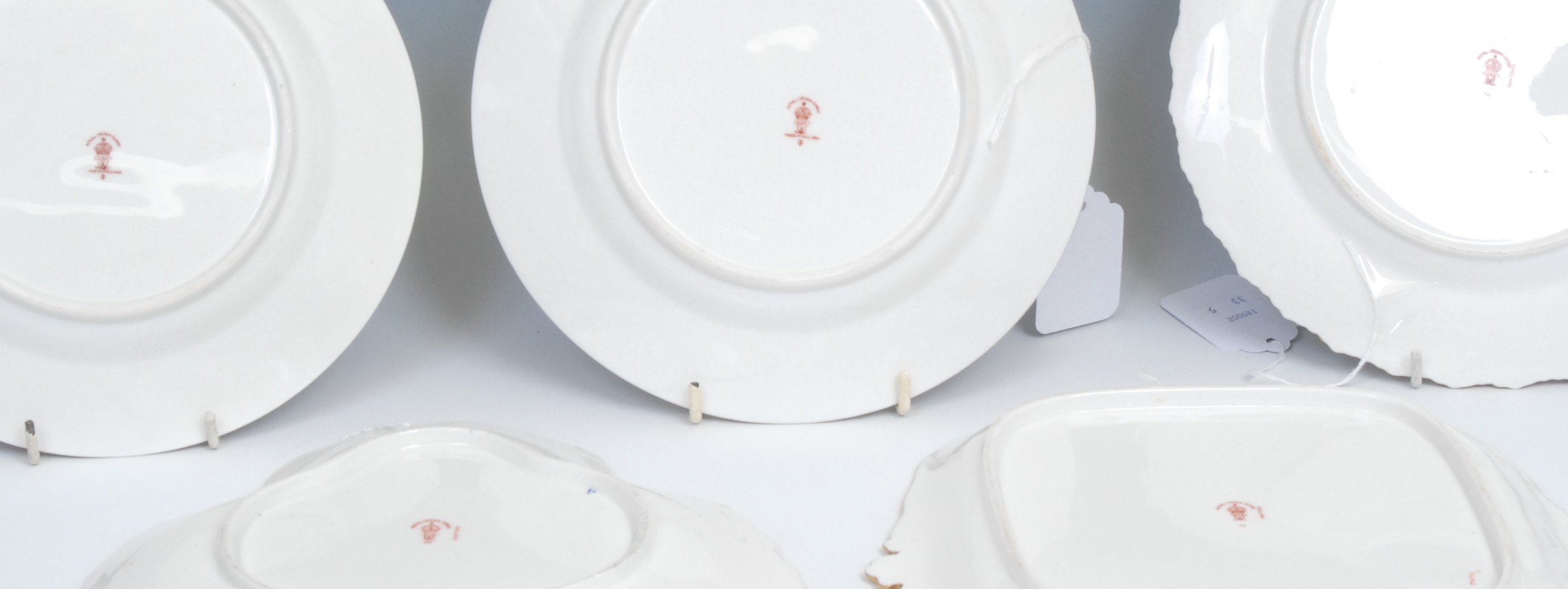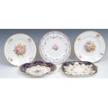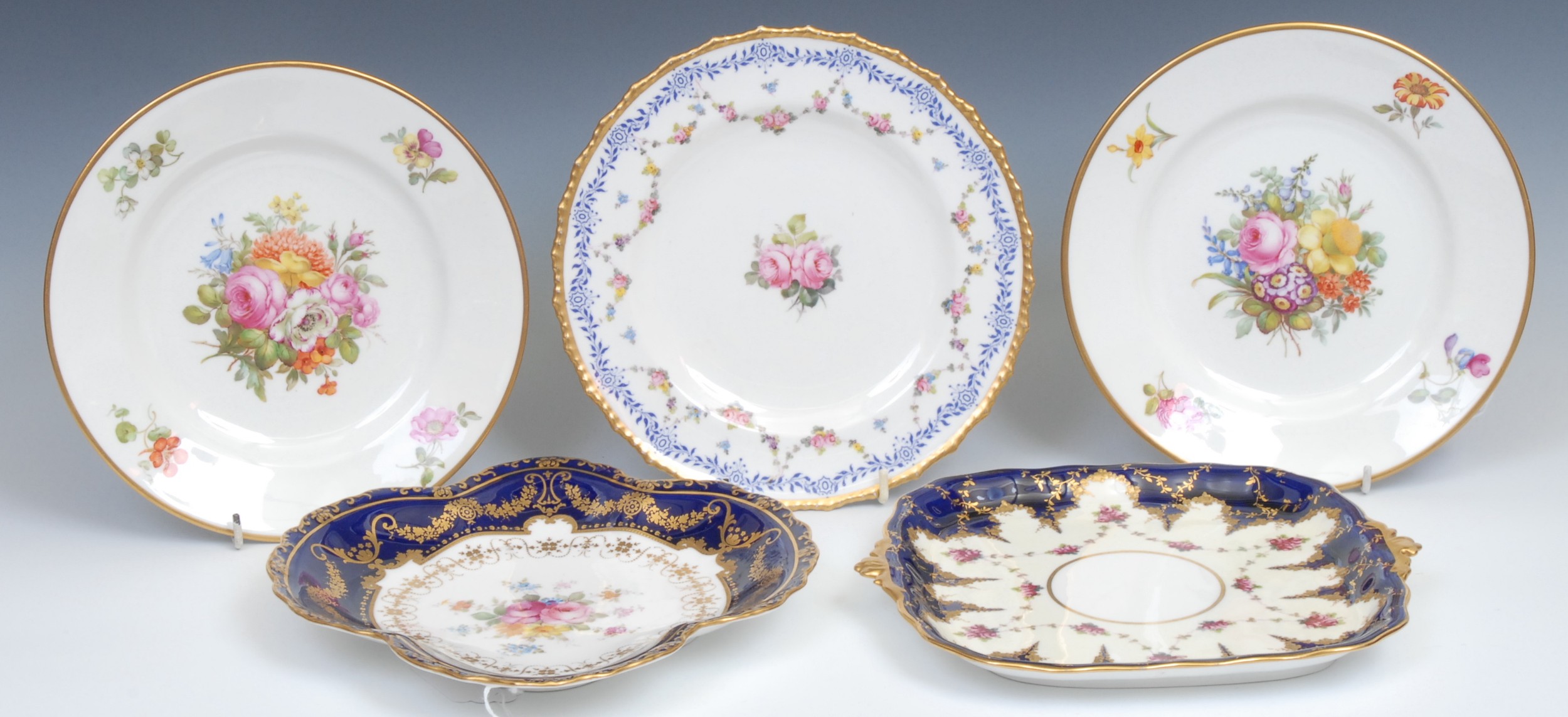 A Royal Crown Derby lobed dessert dish, the field painted with summer flowers, cobalt blue border gilded with floral swags, 24.5cm wide, printed and impressed marks, date code for 1901; a Royal Crown Derby shaped square dish, decorated with rose garlands, raised tooled gilding on a cobalt blue border, lobed gilt handles, printed and impressed marks, date code for 1907; a pair of Royal Crown Derby plates, painted with flowers in the early 19th century style, gilt line rim, 22cm diameter, date code for 1937; another Royal Crown Derby plate, decorated with flowers and blue foliate swags, date code for 1906 (5)