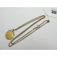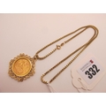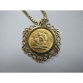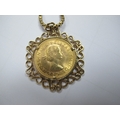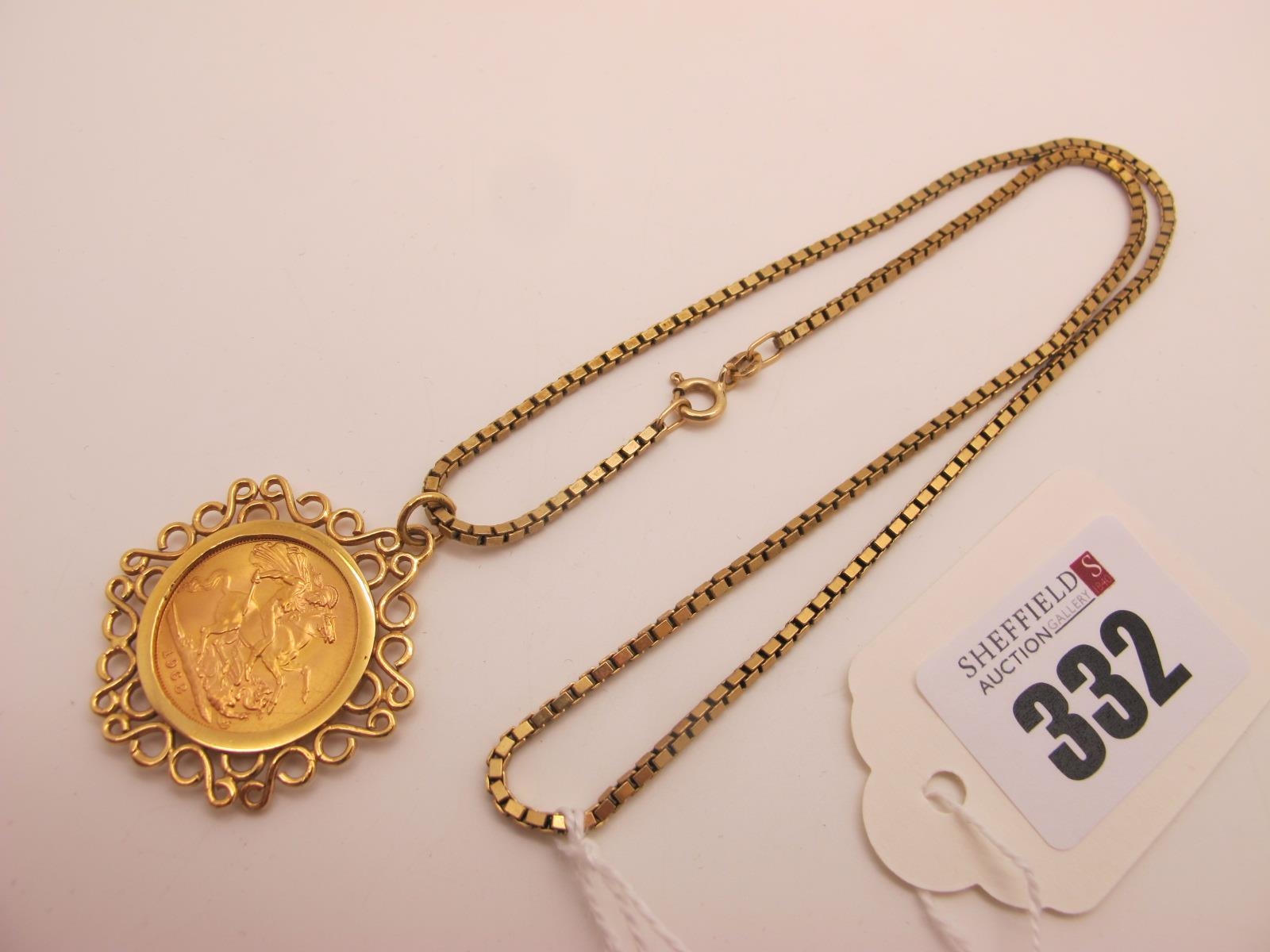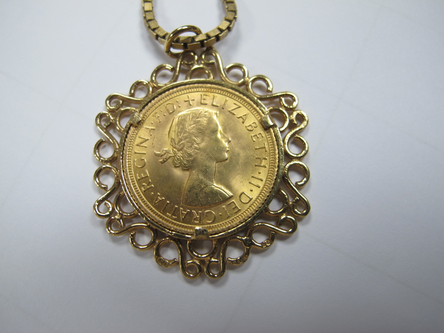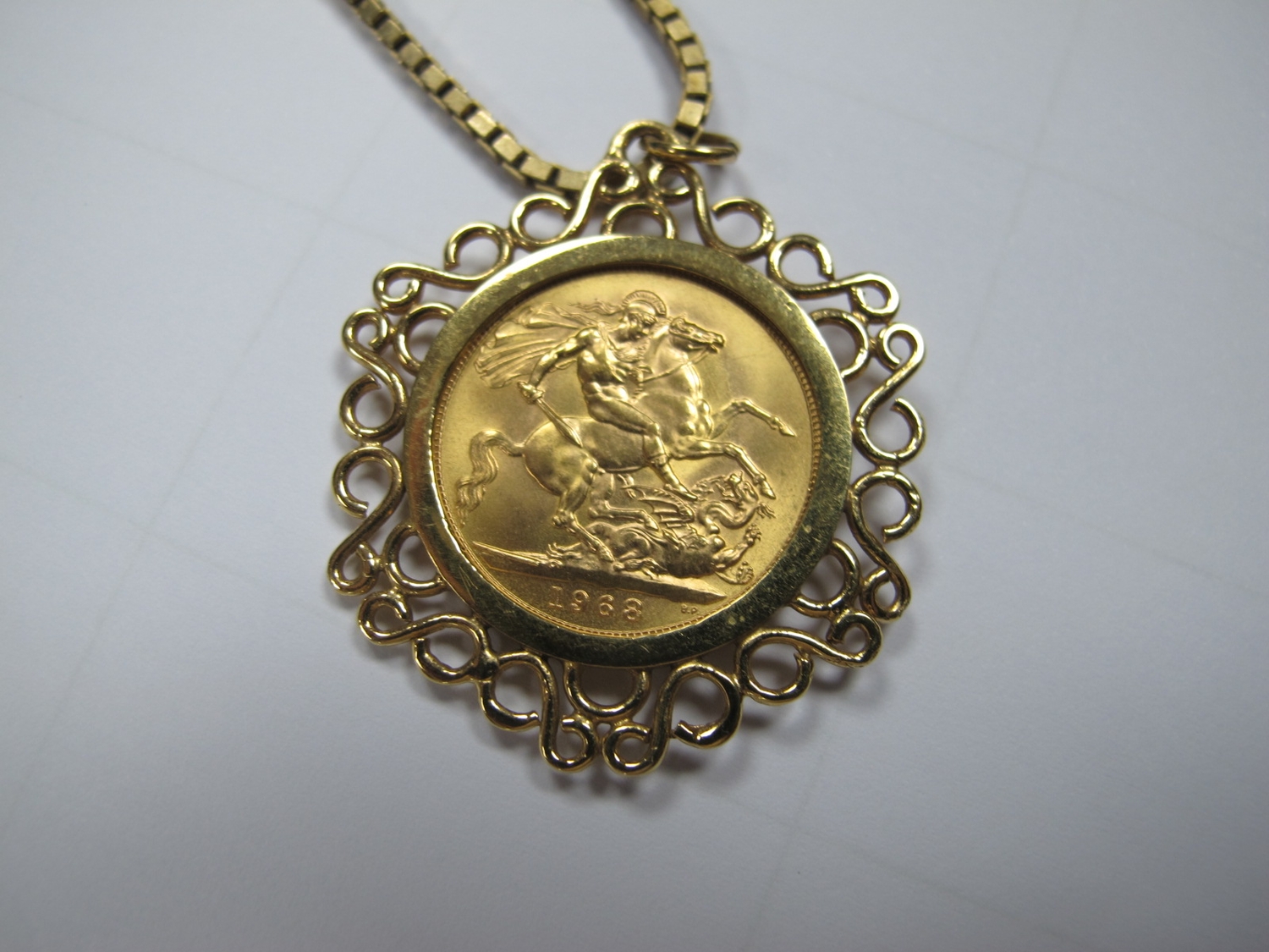 Queen Elizabeth II Sovereign, 1968 (lose/) set within 9ct gold scroll pendant mount, suspended on a 9ct gold box link chain.