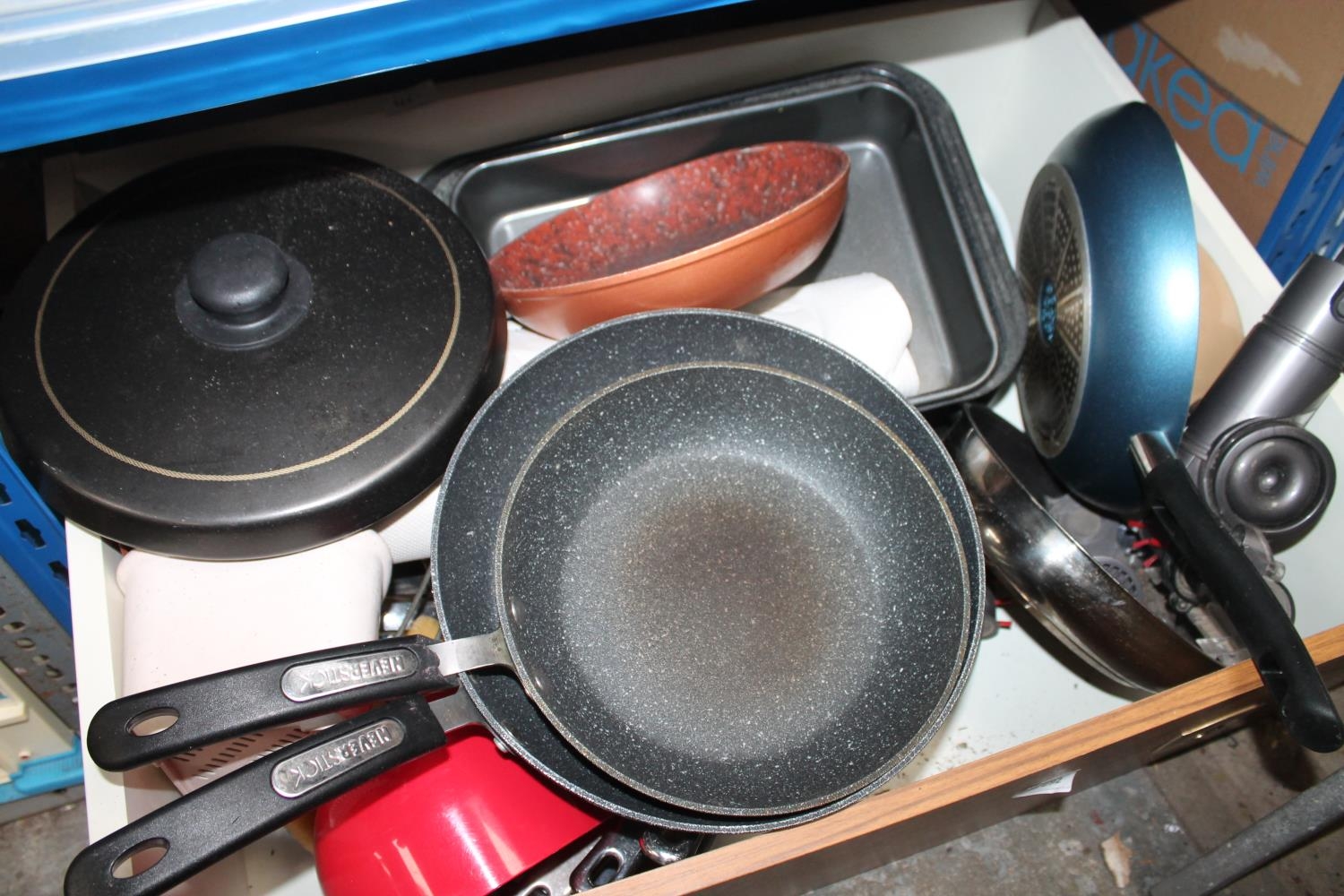 DRAWER OF KITCHEN ITEMS, SAUCEPANS, FRYING PANS, DOG BOWL, BAKING TRAYS ETC