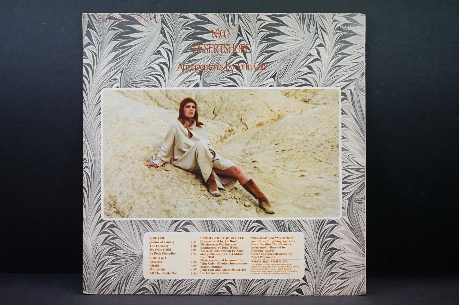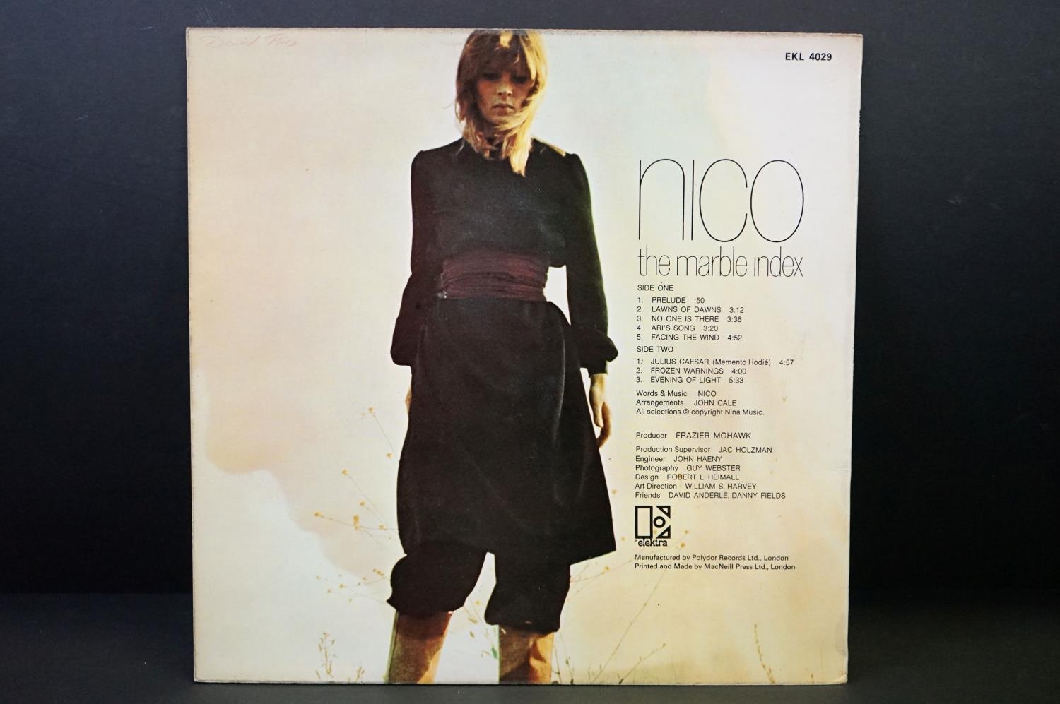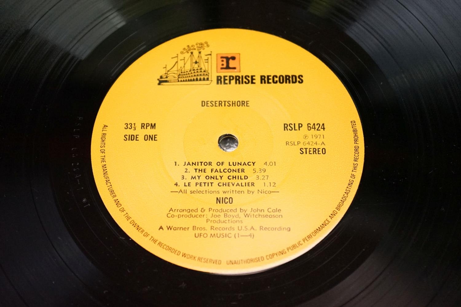 Vinyl – 2 Nico LPs to include The Marbel Index original UK 1969 1st pressing on Elektra Records EKL 4029. Mono, orange / silver Elektra labels. Fully laminated sleeve VG+, Vinyl VG+, and Desertshore original UK 1971 1st pressing on Reprise records RSLP 6424. Textured sleeve VG+, Vinyl EX-.