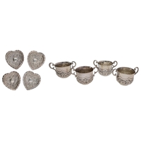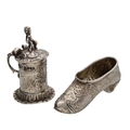 Dutch novelty miniature silver tankard with hinged cover, decorated with putti and with a figural finial, bearing import hallmarks for Thomas Hayes 1902, 2.25" high; together with a shoe pin cushion mount (base only, no cushion), bearing import marks for David Bridge, date mark rubbed, 43gm total (2)
