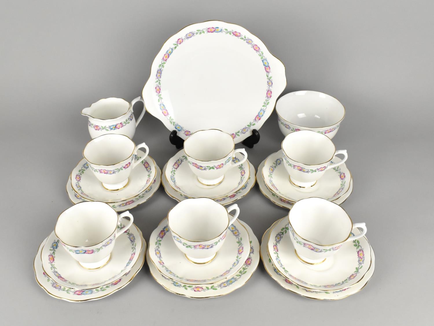 A Royal Albert Floral Trim Decorated Tea Set to Comprise Six Cups, Six Saucers, Six Side Plates, Cake Plate, Milk Jug and Sugar Bowl