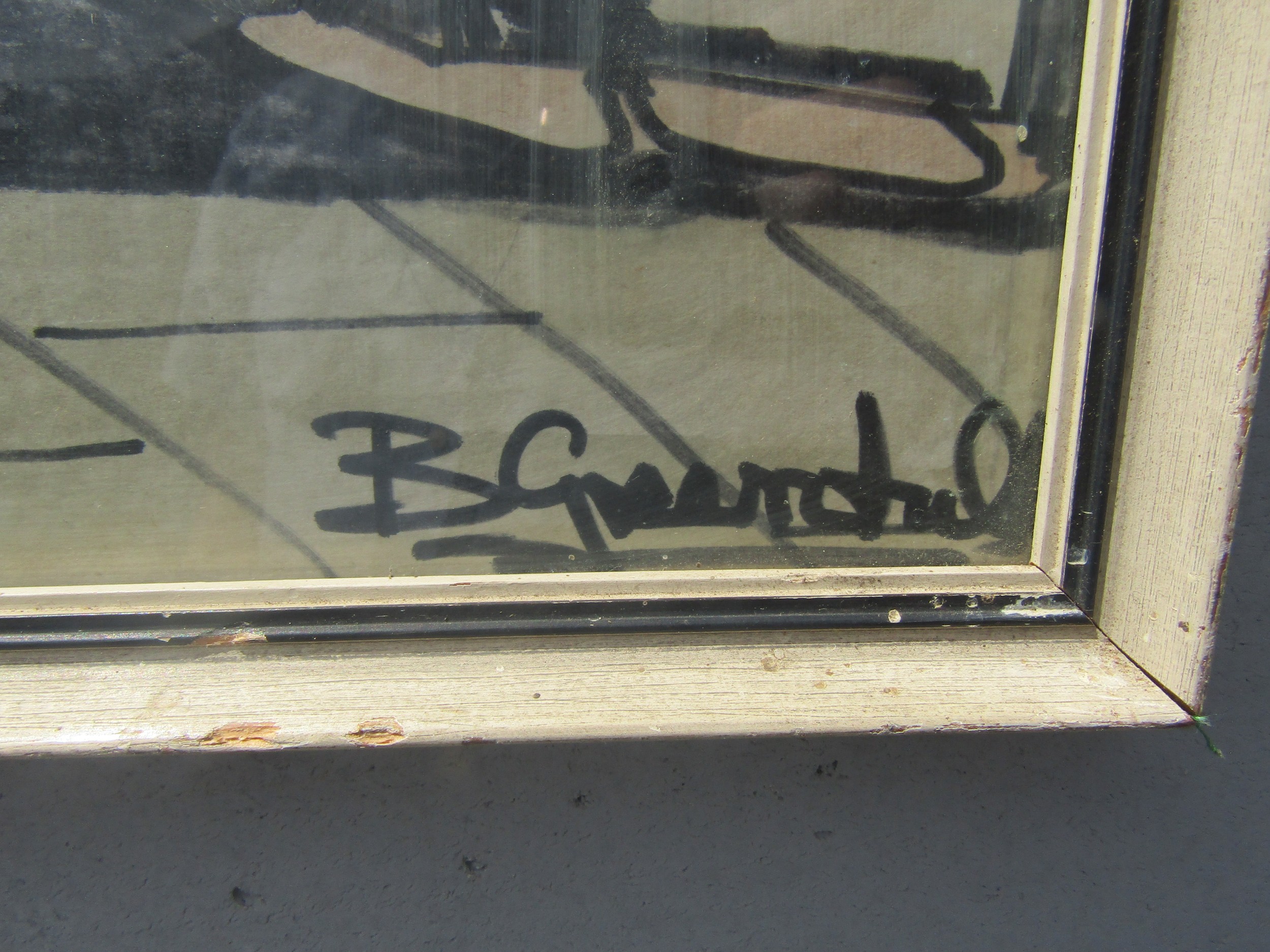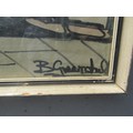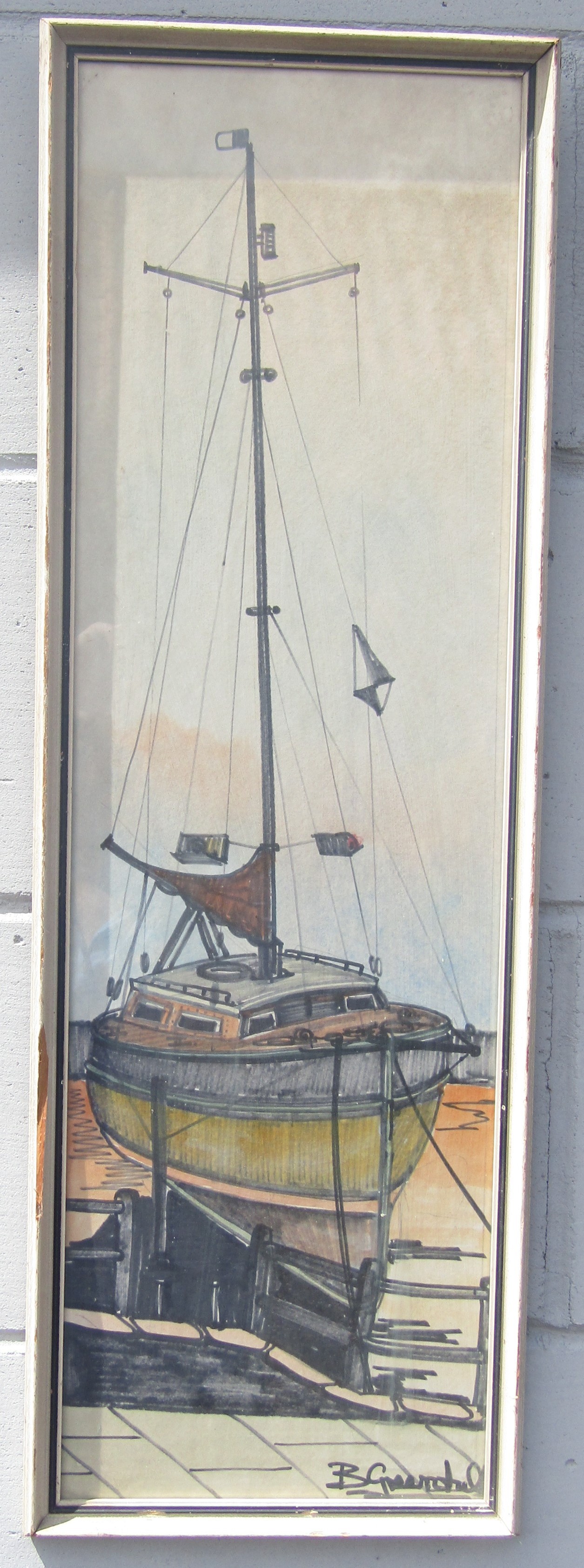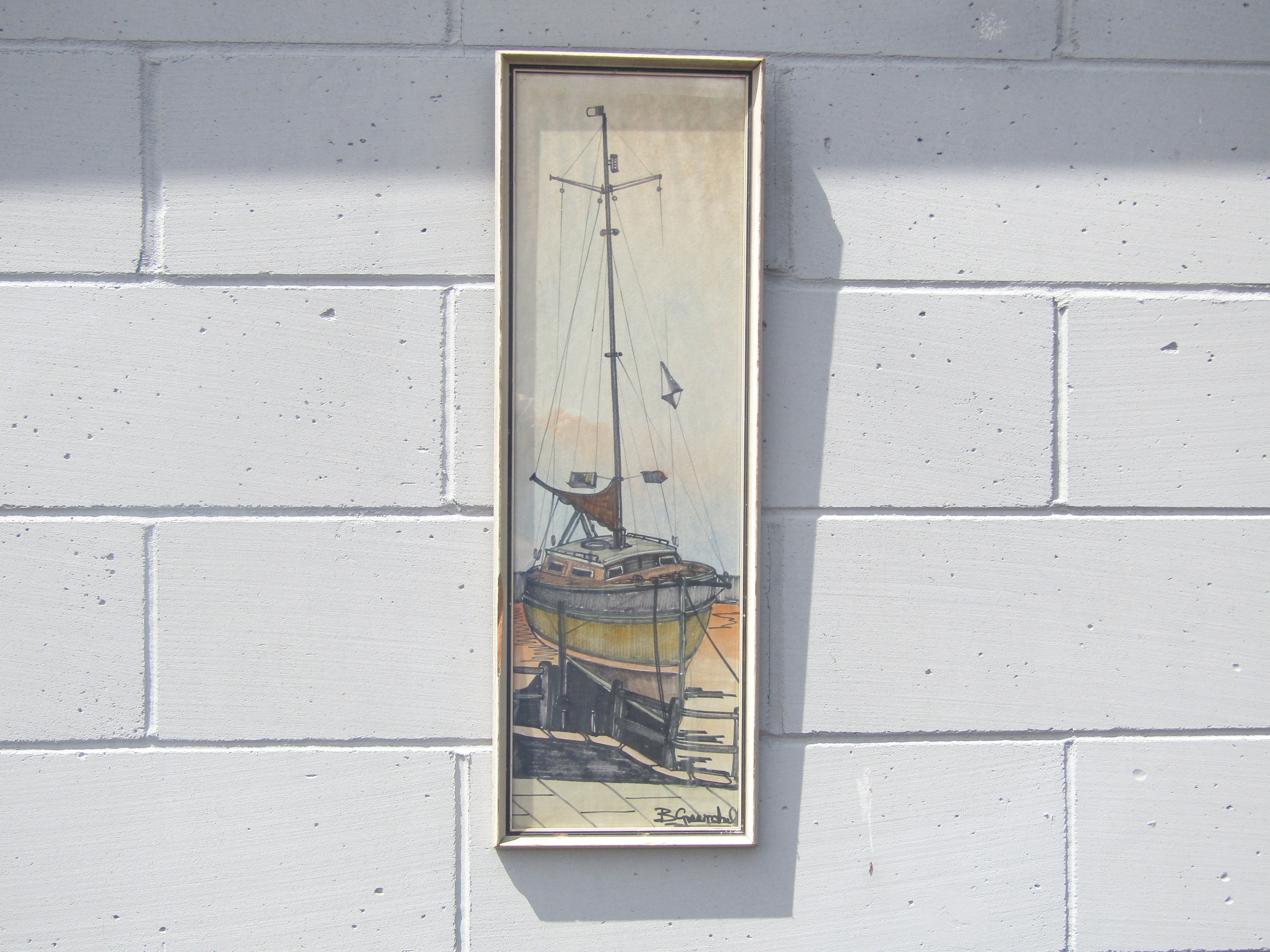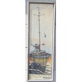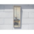 A mid 20th Century framed and glazed coloured pen on paper depicting a sailing vessel. Indistinctly signed bottom right. Image size 73cm x 22cm