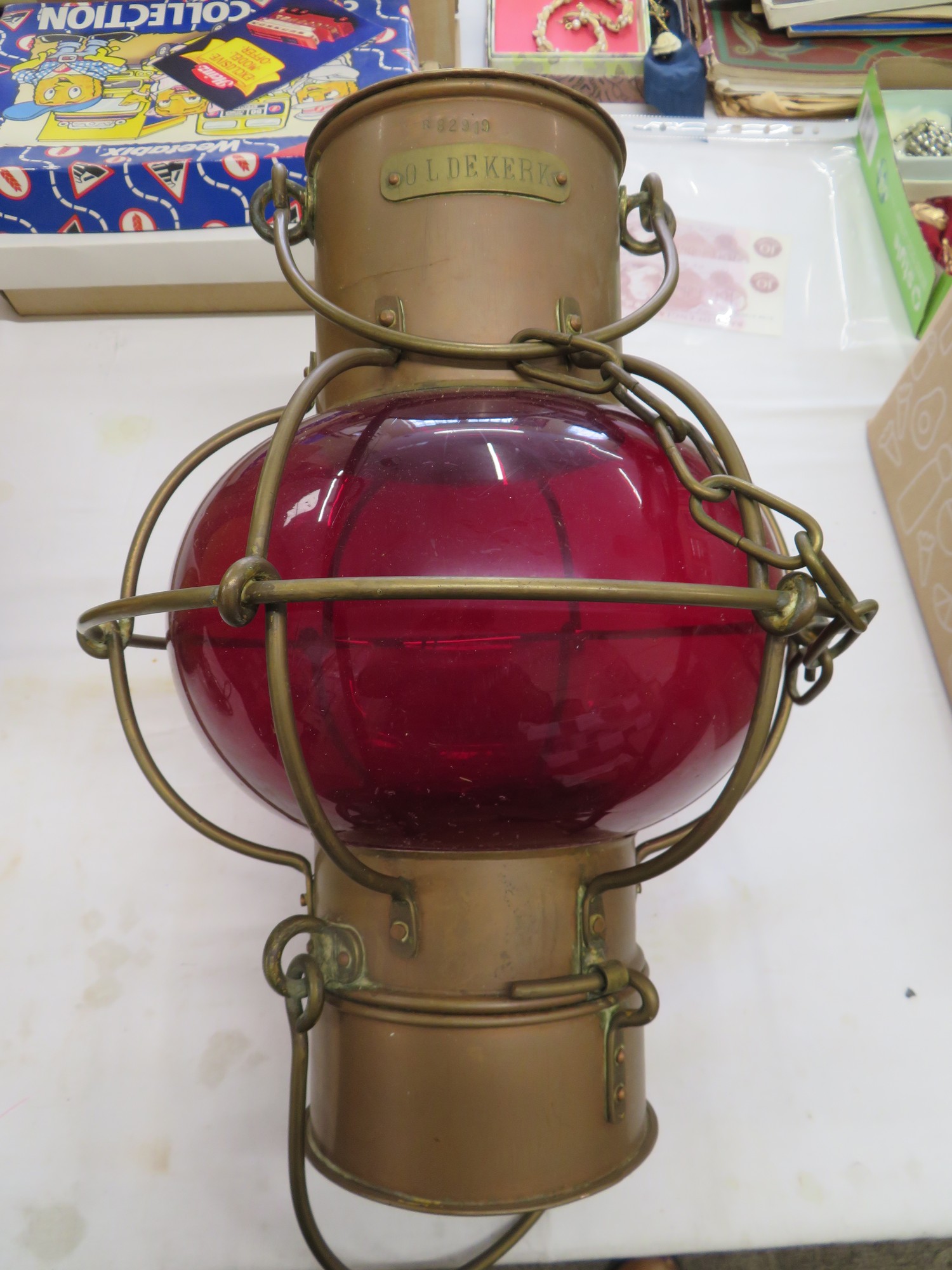 Copper and brass ship's port light, with label 'Olde Kerk'