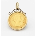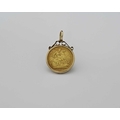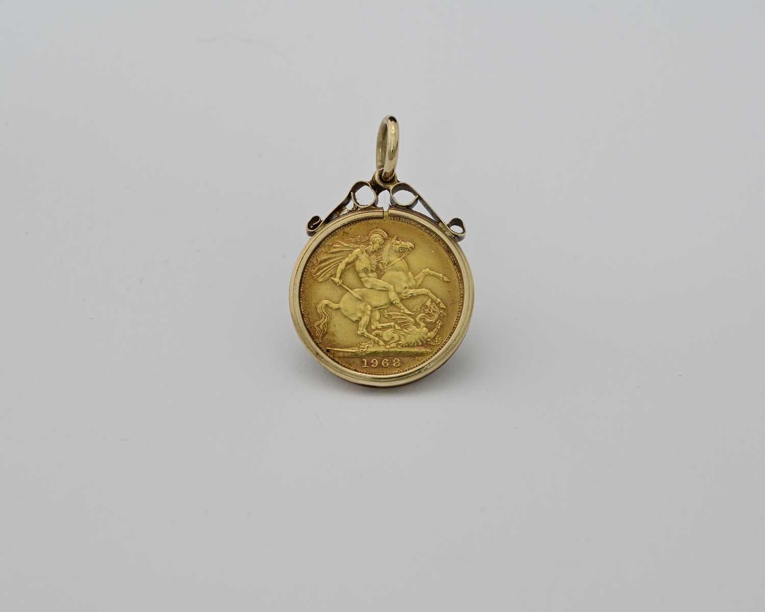 A full sovereign pendant, mount stamped 9ct, length 3.5cm, 10.2g.