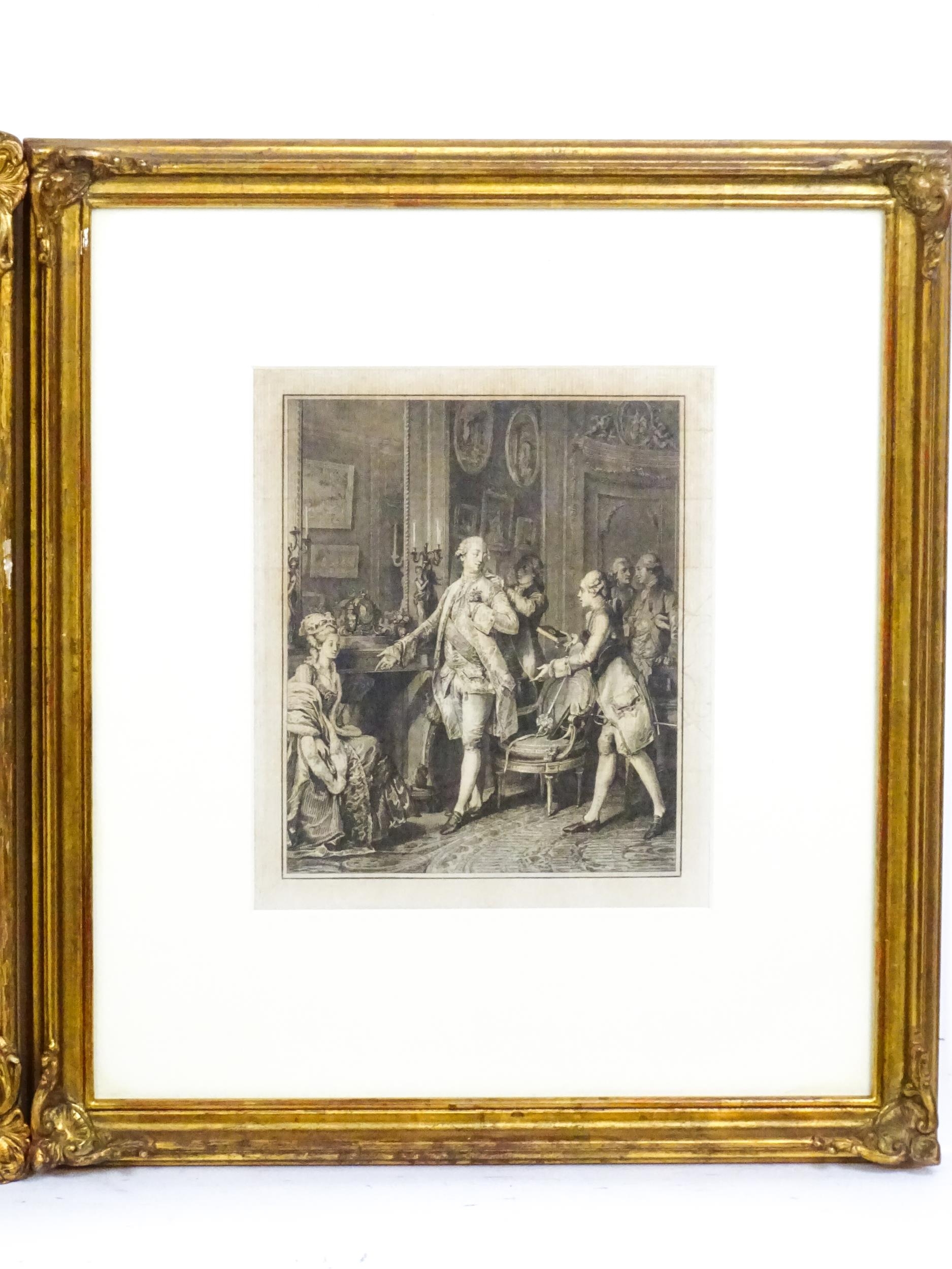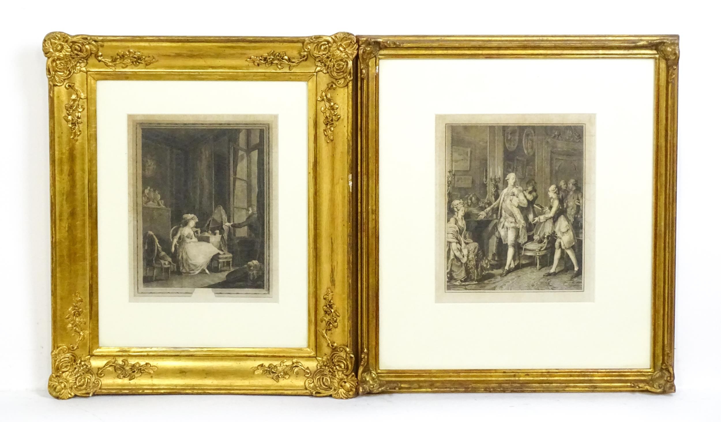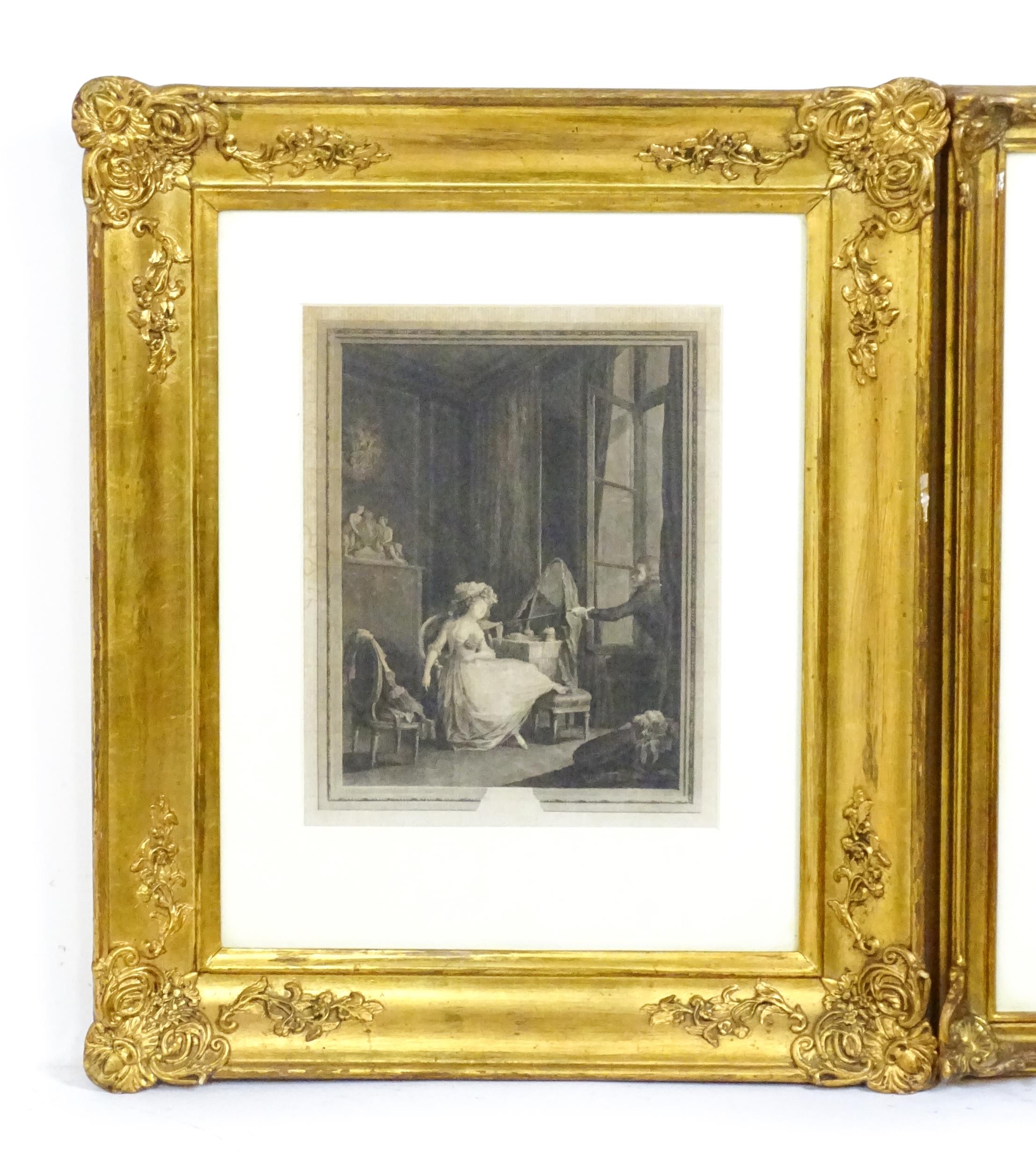 Jacques-Firmin Beauvarlet after Pierre-Antoine Baudouin, Engraving, L'Amour Frivole. Together with Antoine Louis Romanet after Jean Michel Moreau le Jeune, Engraving, La Grande Toilette. Largest approx. 9" x 7" (2)