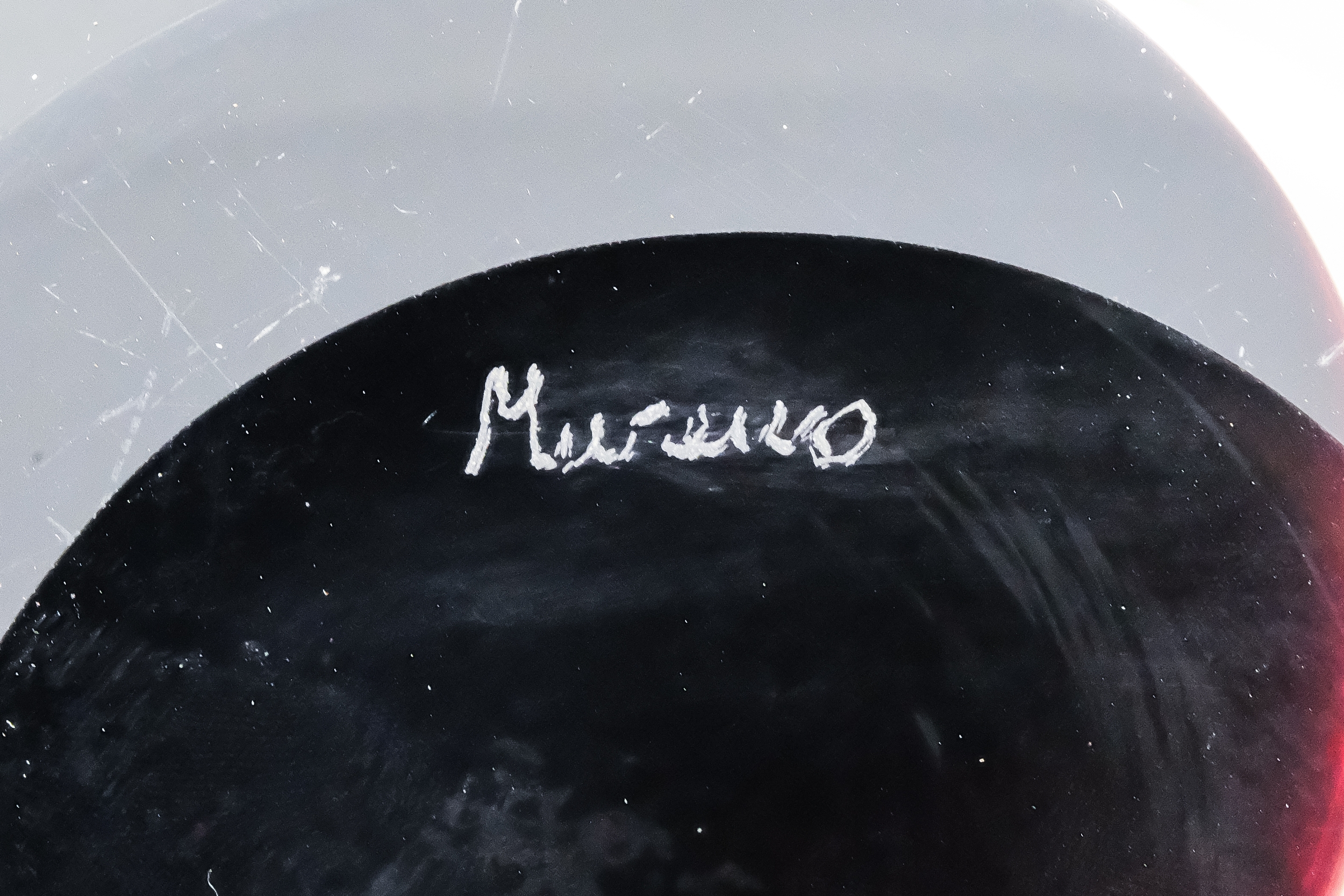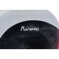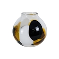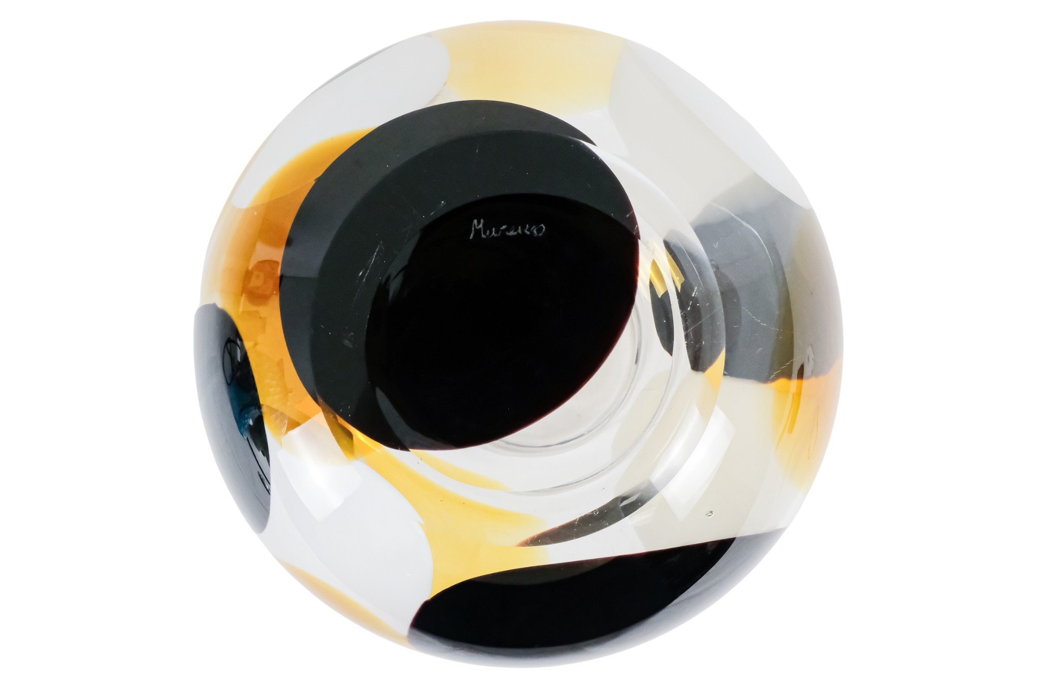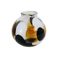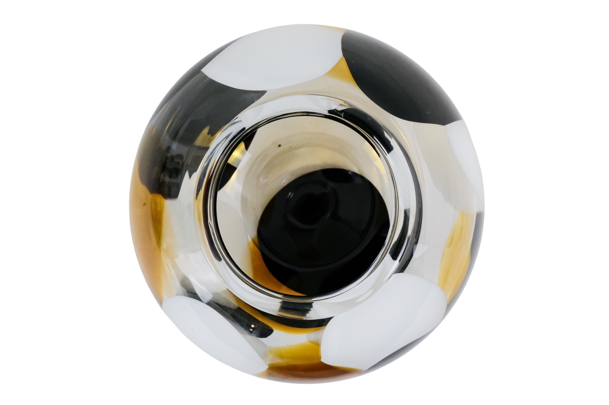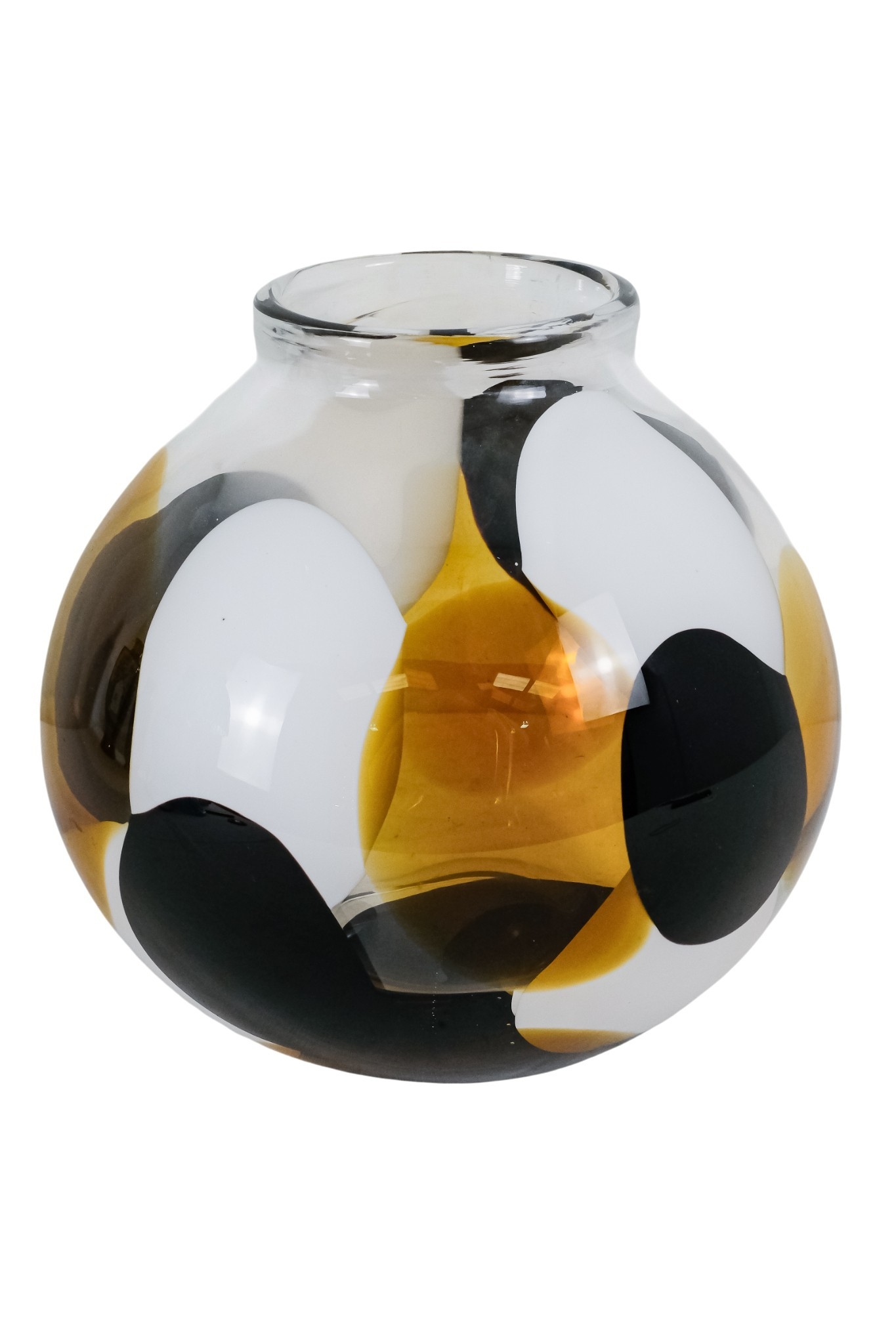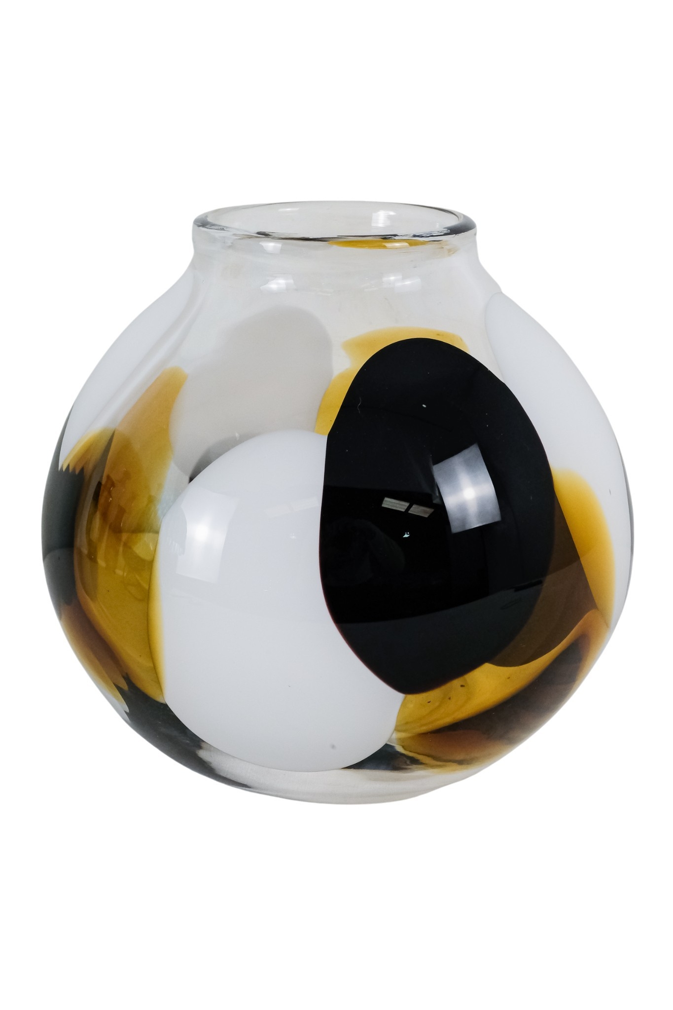 A vintage Murano glass vase - of globe form and decorated with abstract panels of amber, white and deep red glass, engraved to base, 23cm high.