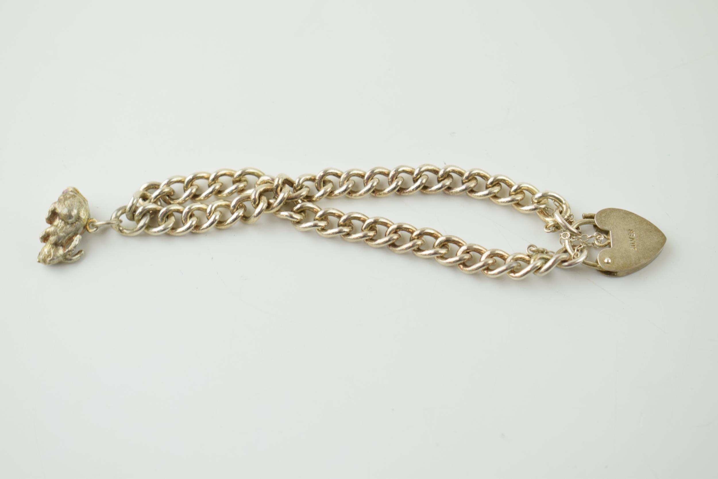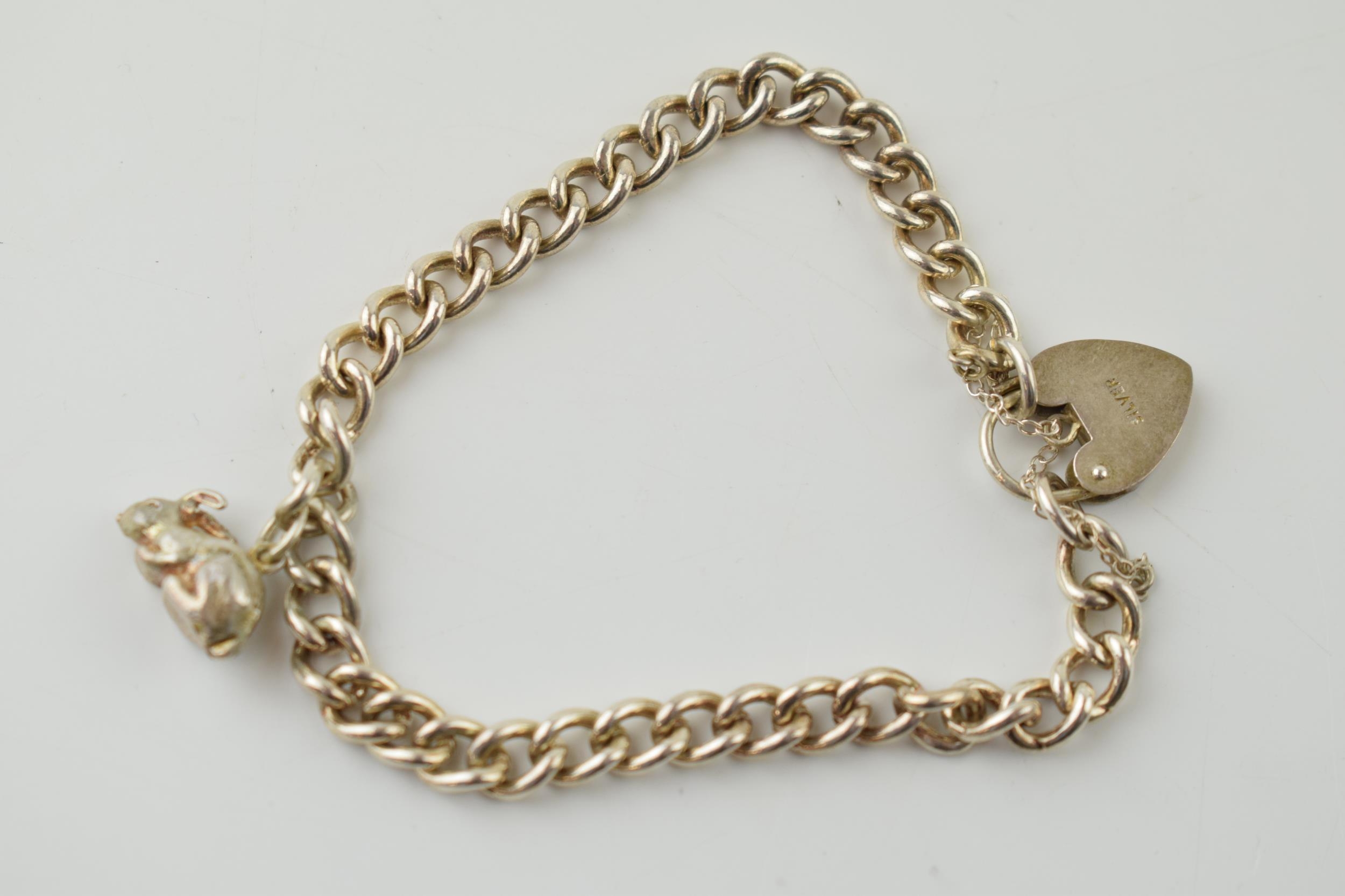 A silver bracelet with heart shaped clasp and rabbit charm, 20.0 grams.