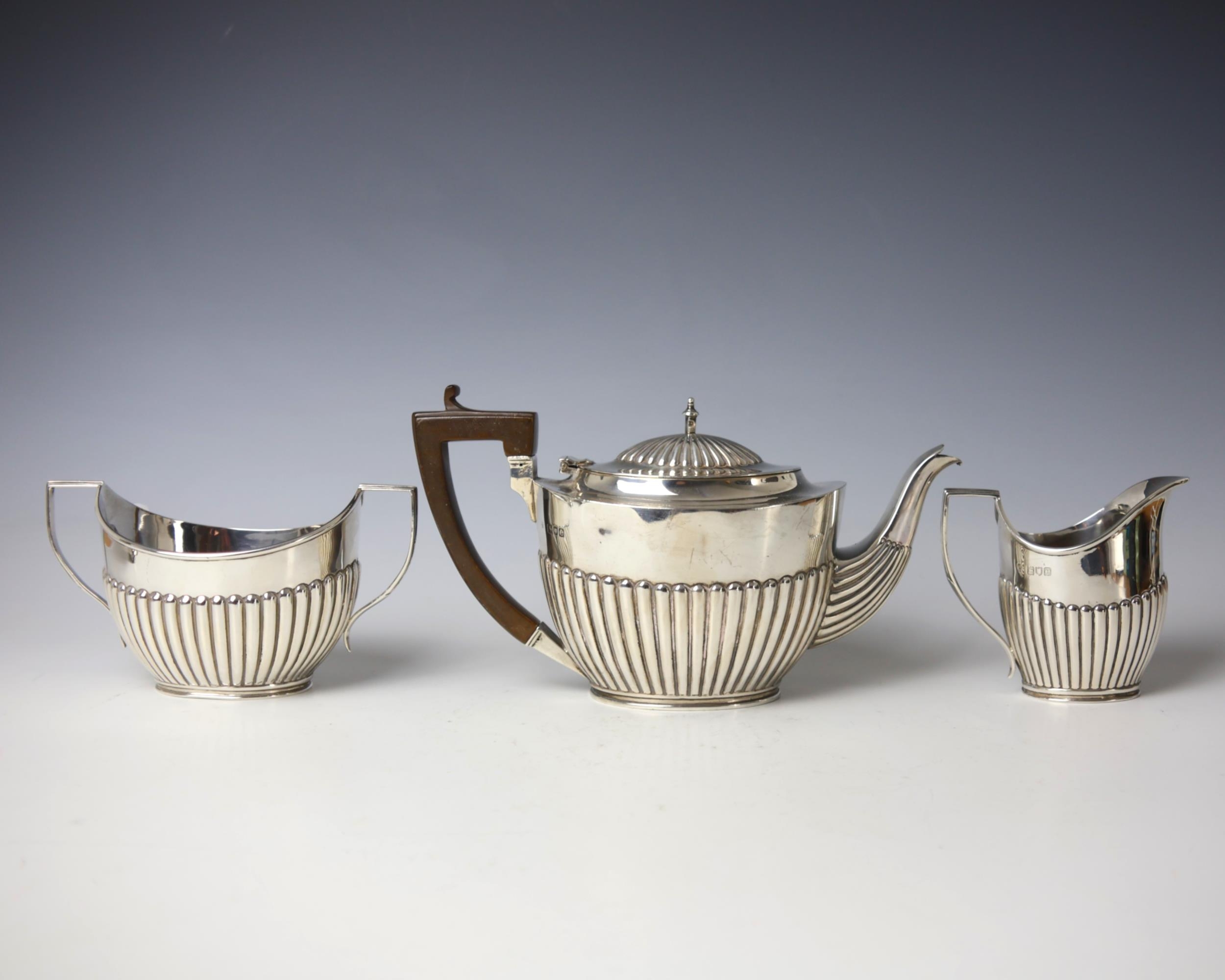 An early 20th century silver tea service, Charles Stuart Harris, London 1900/1901, comprising teapot, sugar bowl and milk jug, of demi fluted design, teapot 14cm high, gross weight 28ozt (3) (at fault)