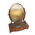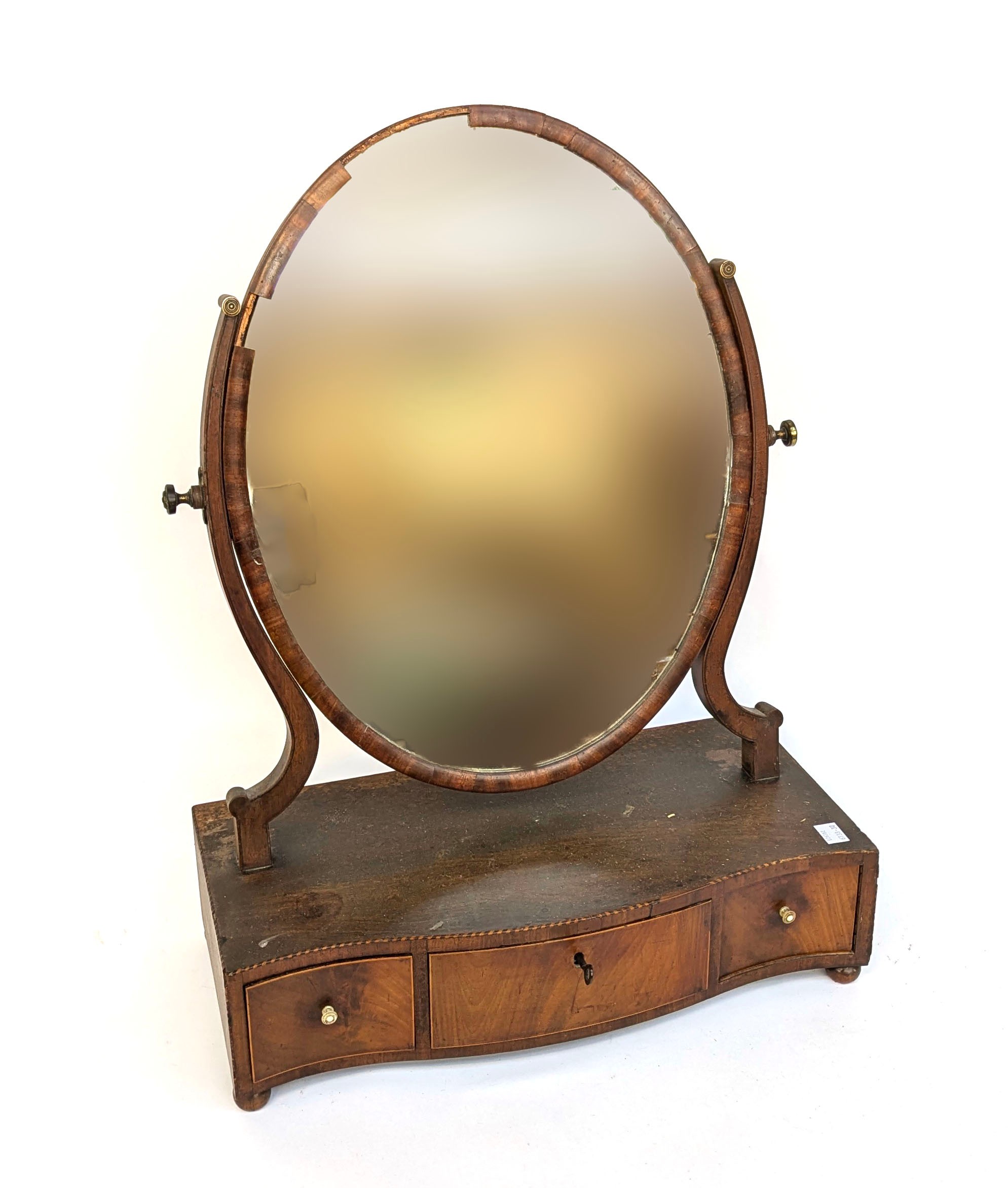 A George III oval box mirror, three serpentine drawers with barbers pole stringing (af) 46cmW