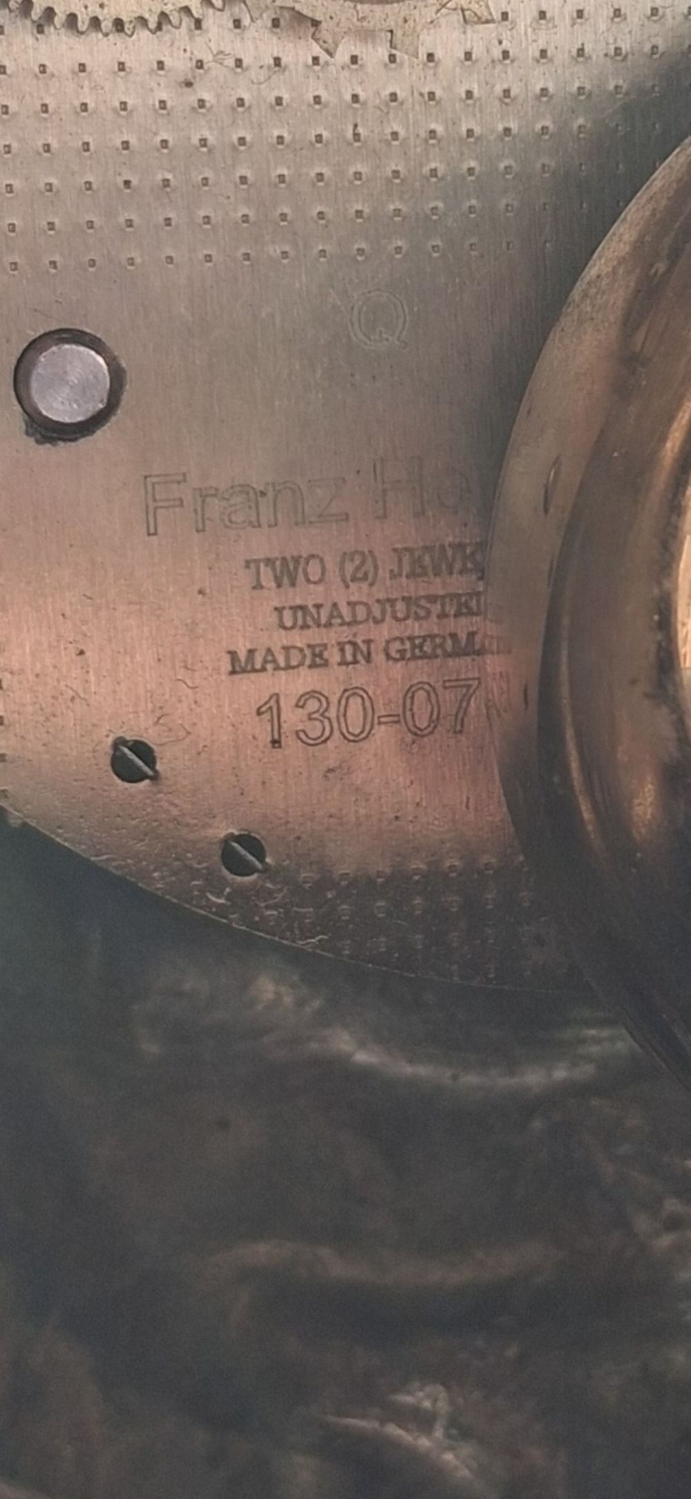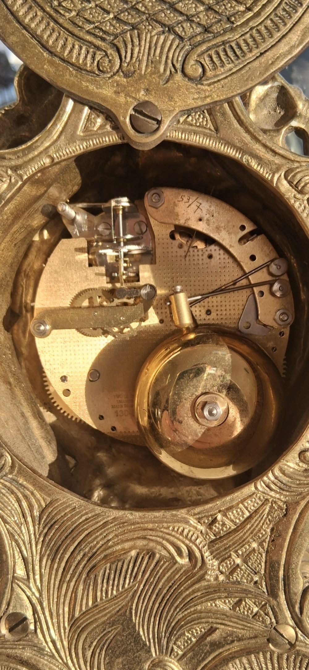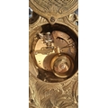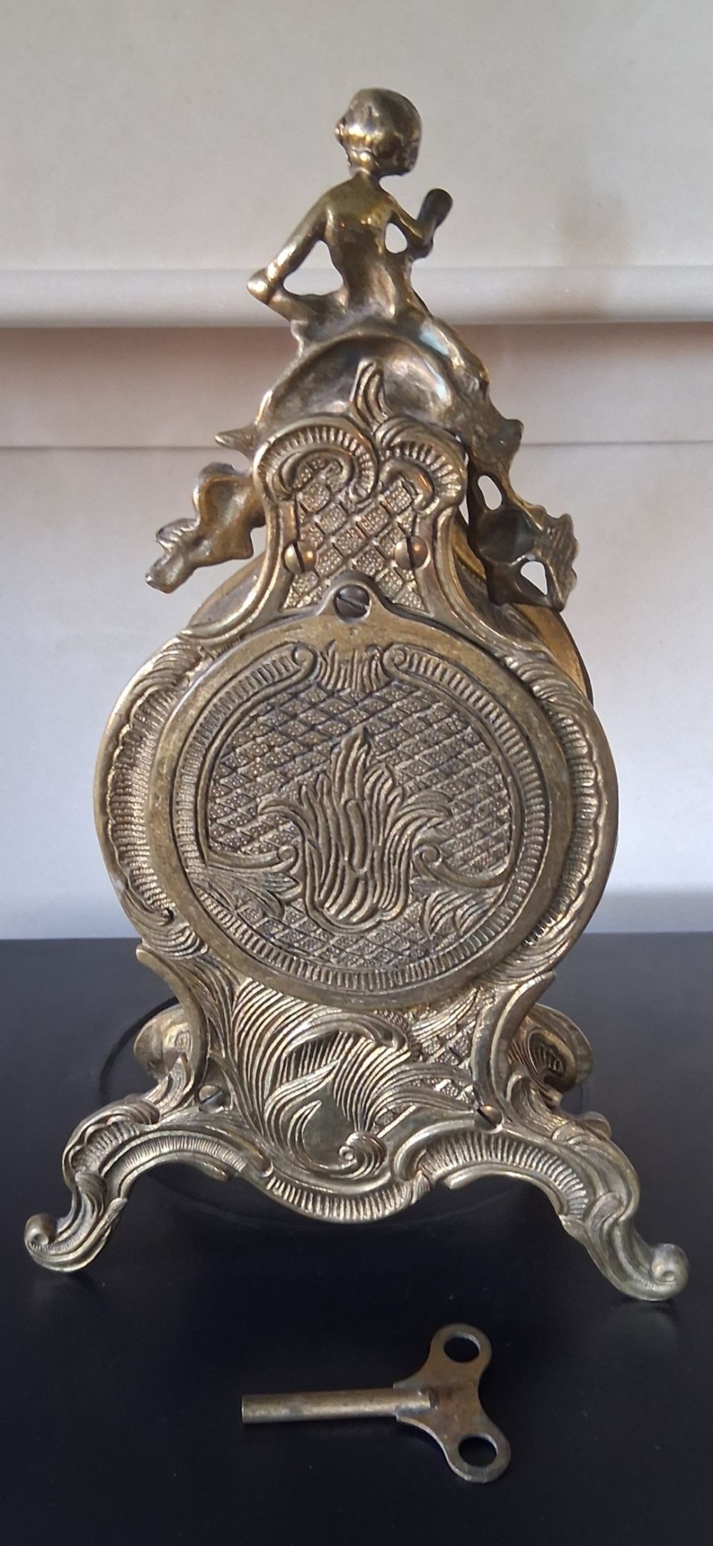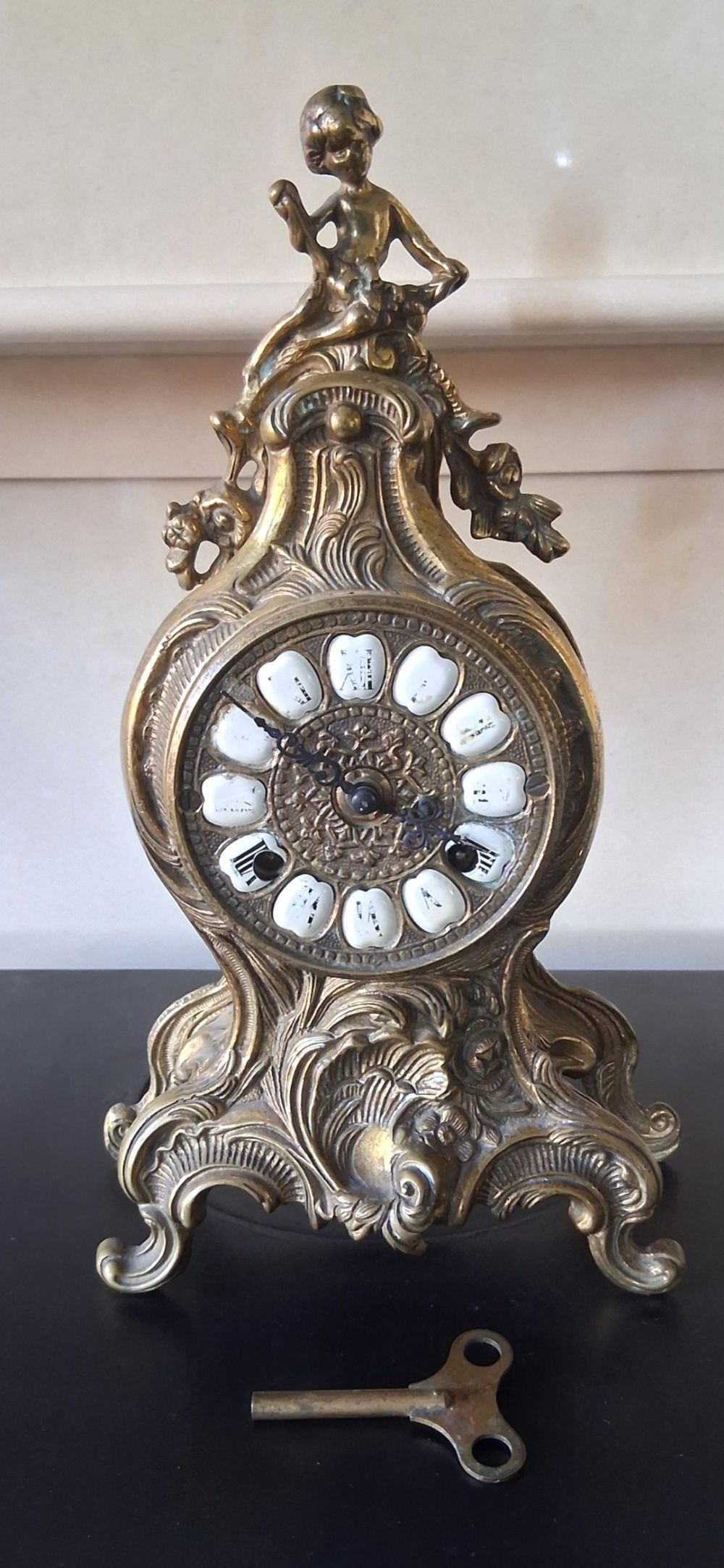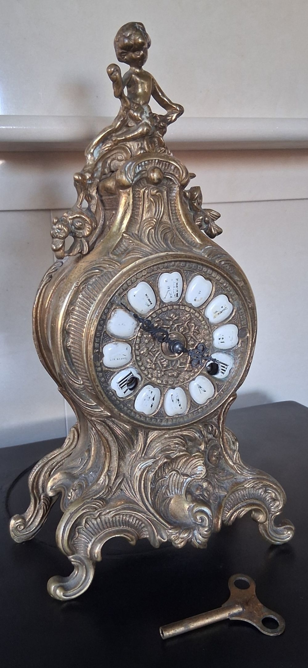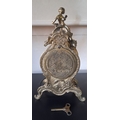 A LOUIS XV STYLE BRASS FRANZ HERMLE MANTLE CLOCK, intricate piece with figural putti finial, raised on base on scroll feet. The dial with enamel Roman Numerals. Appears to be in working order, chiming. Makers mark to interior ‘Franz Hermle Made in Germany numbered 130-07’. Dimensions: 13 inches high approx.