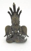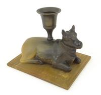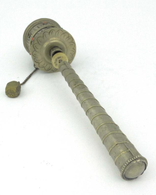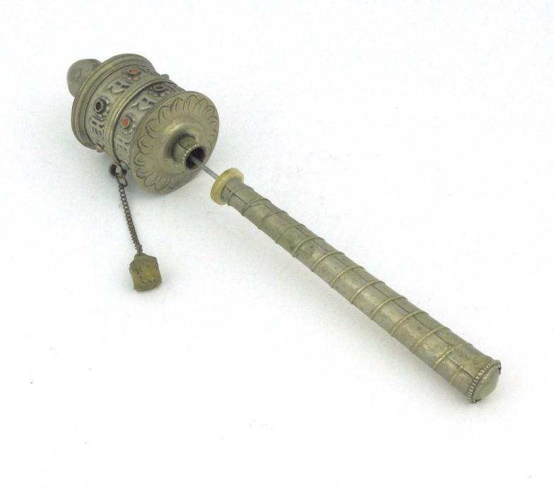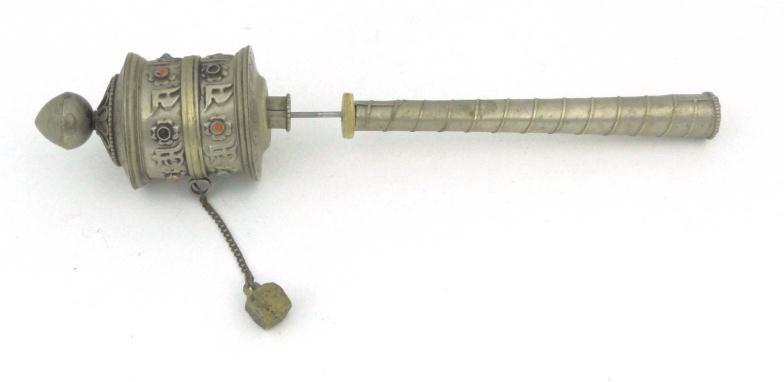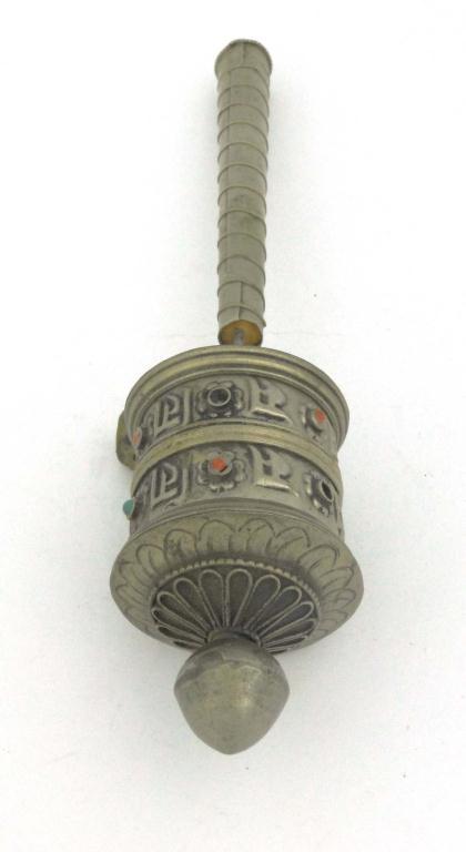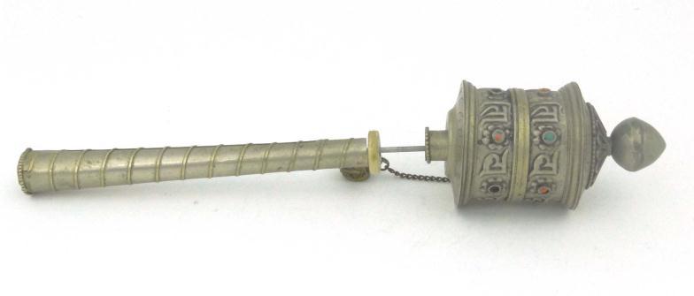 Islamic metal prayer wheel with coloured stone set decoration, 21cm in length