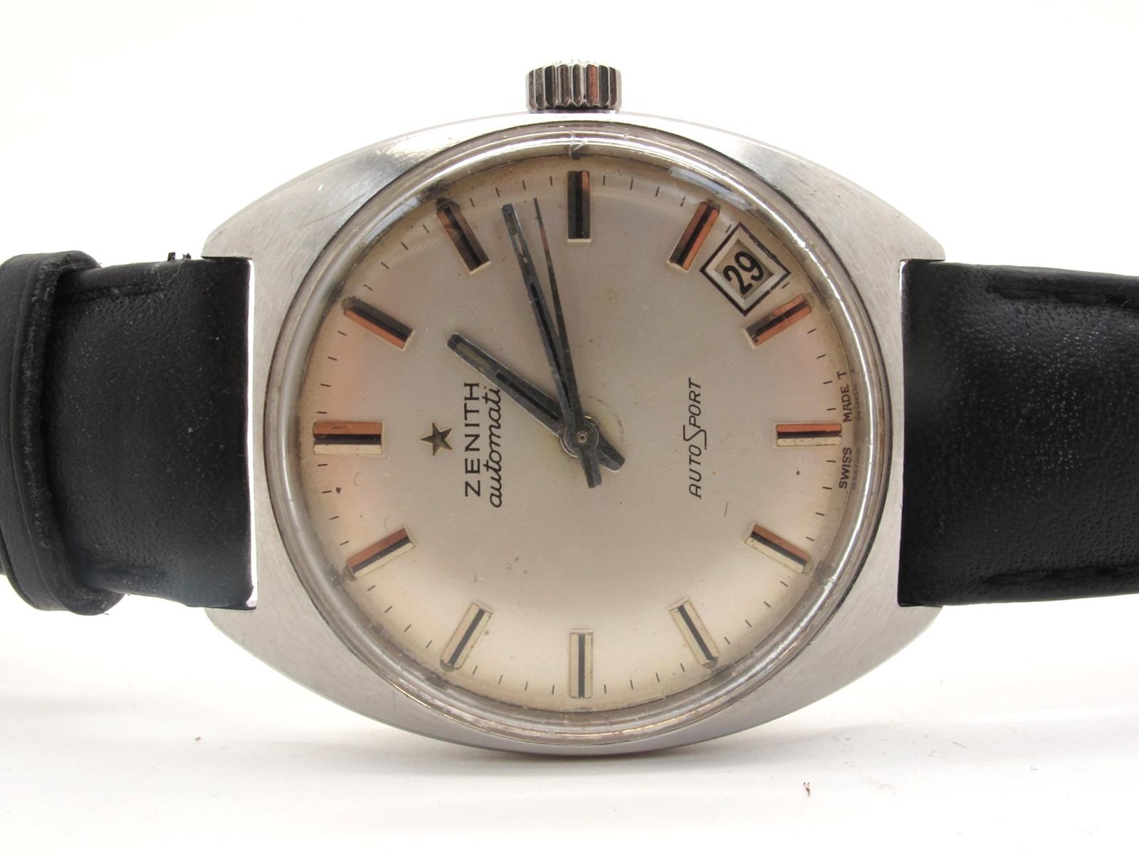 Zenith; An AutoSport Automatic Gent's Wristwatch, the signed dial with line markers, centre seconds and date aperture, the movement stamped "Zenith", with screw down case back, on a later strap.