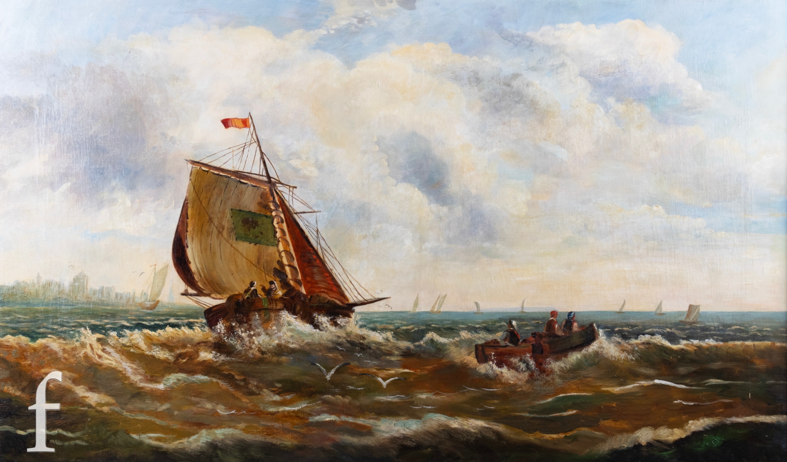 Follower of William Webb (1862-1903) - Fishing boats at sea, oil on canvas, framed, 70cm x 121cm, frame size 80cm x 130cm.