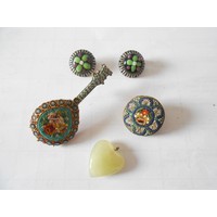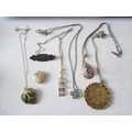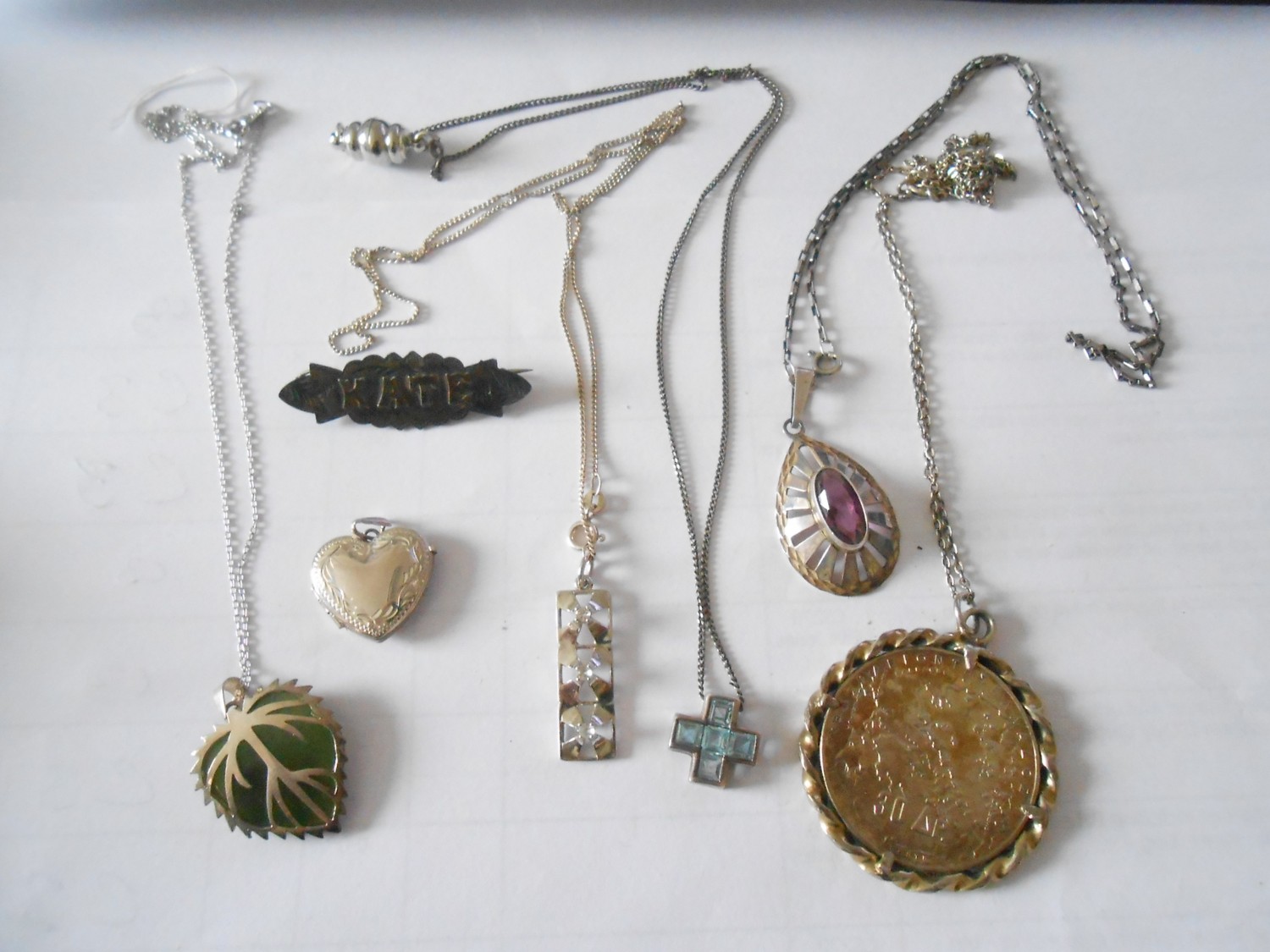 A green hardstone pendant in a silver frame, on chain, a Greek coin in a silver gilt frame, on chain, a silver pendant set amethyst coloured stone, on a silver chain, a silver brooch, a sterling silver pendant set white stones, on a silver chain, a silver locket and one other pendant