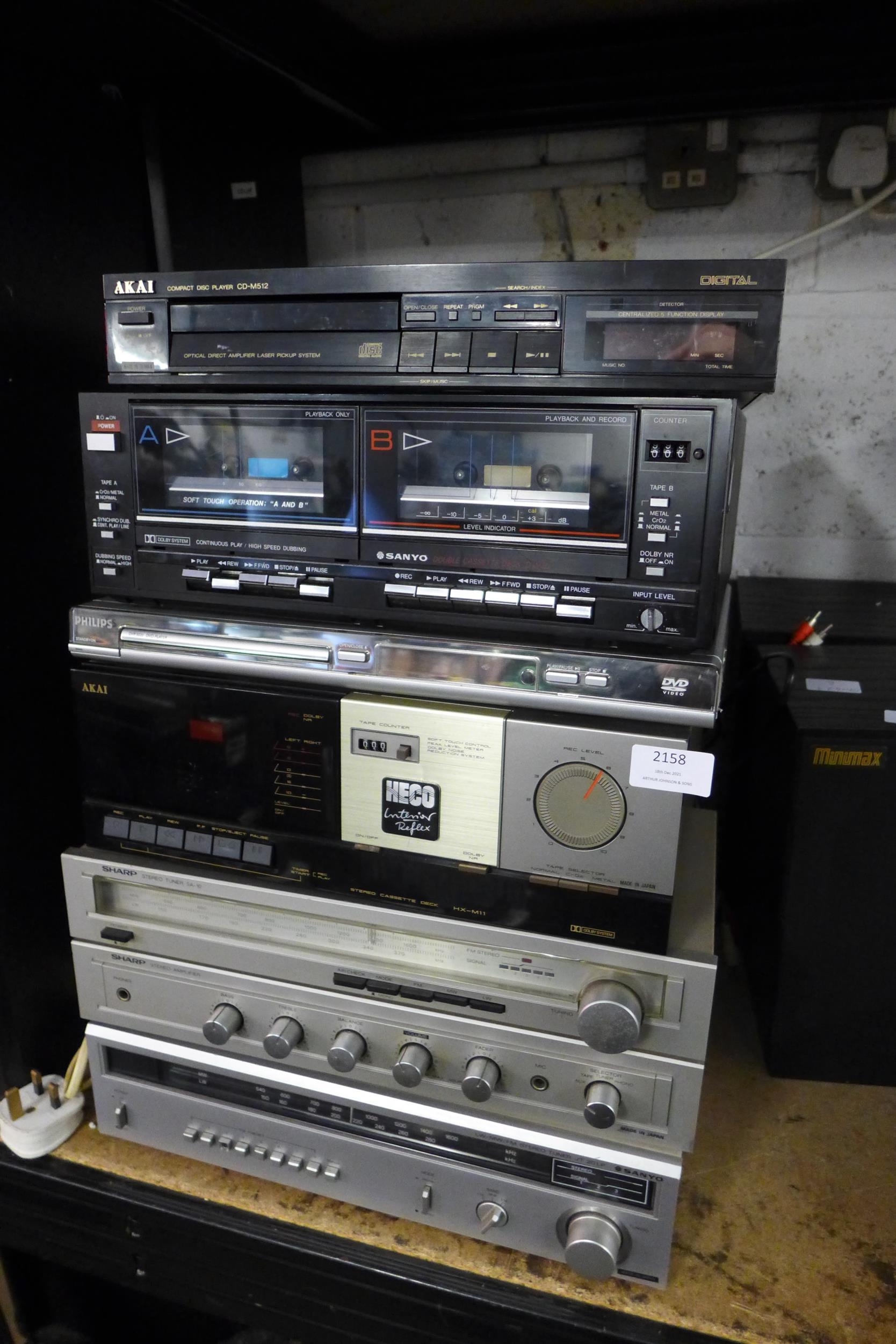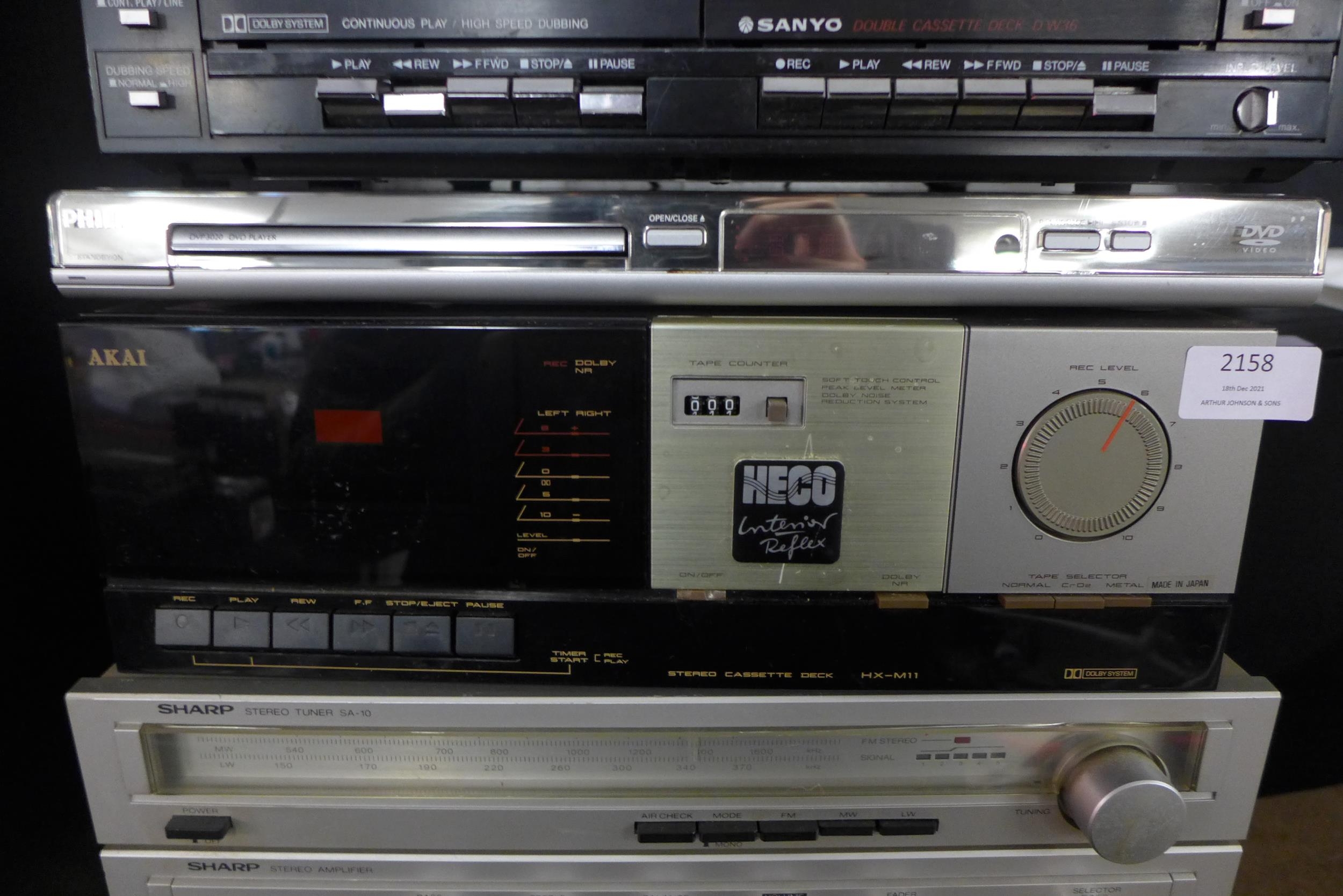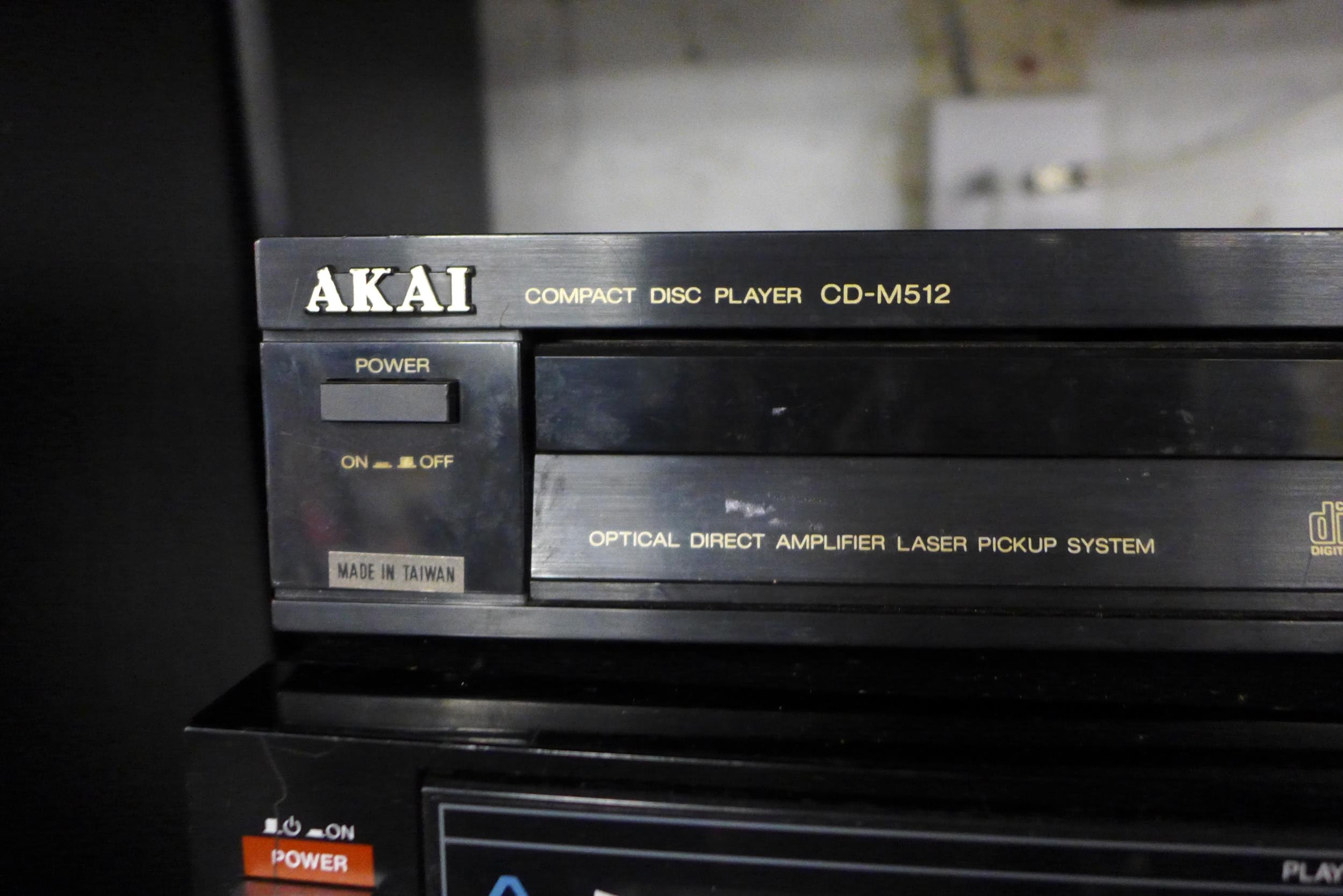 5 Separate systems:- Akai CDM512 CD player, Sharp SA-10 receiver, Sanyo JT20LP tuner, Akai HXM11 tape deck, Akai twin tape deck plus DVD player