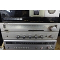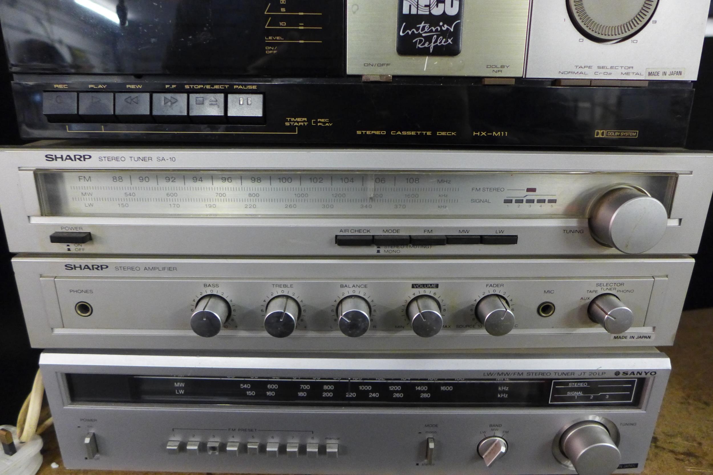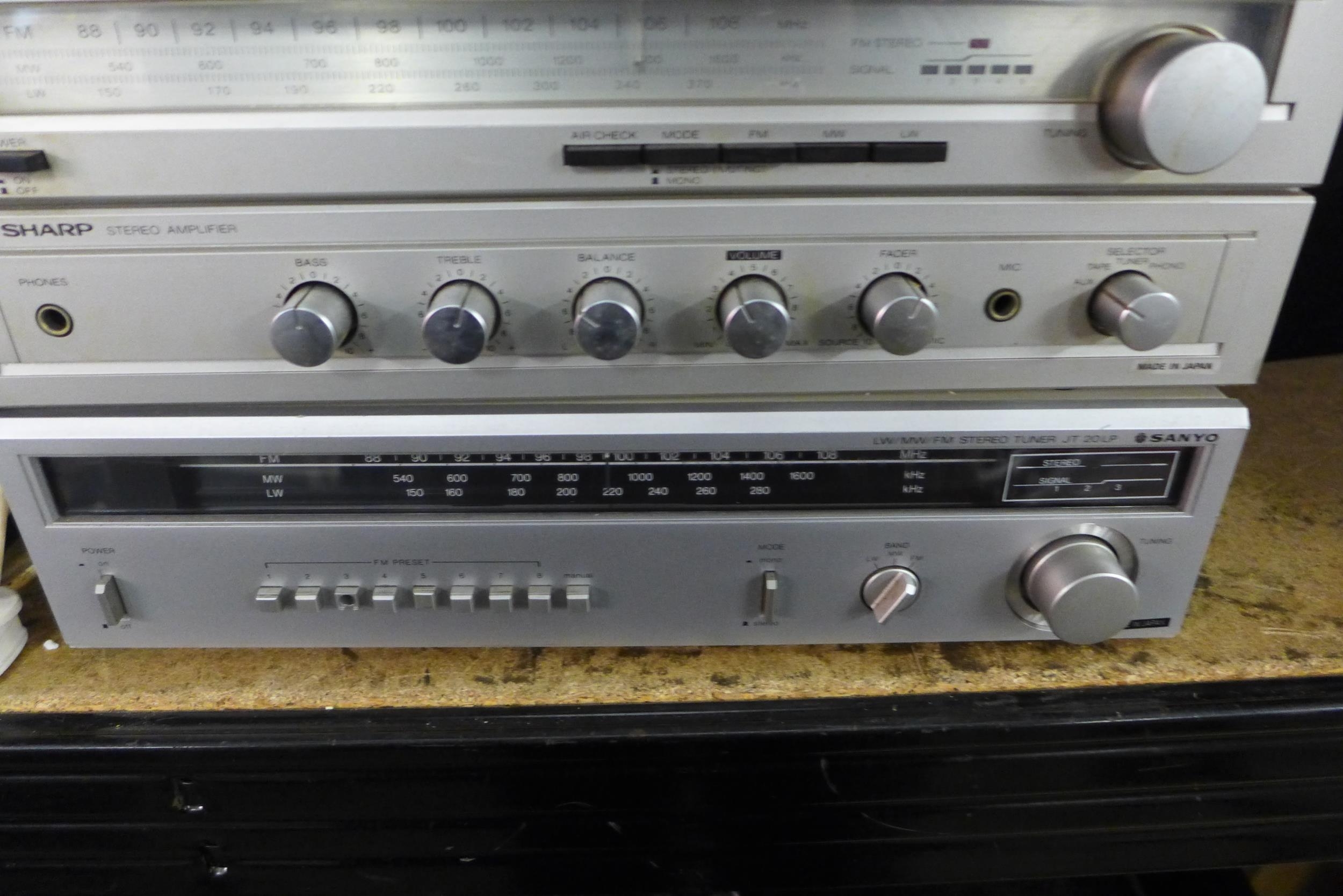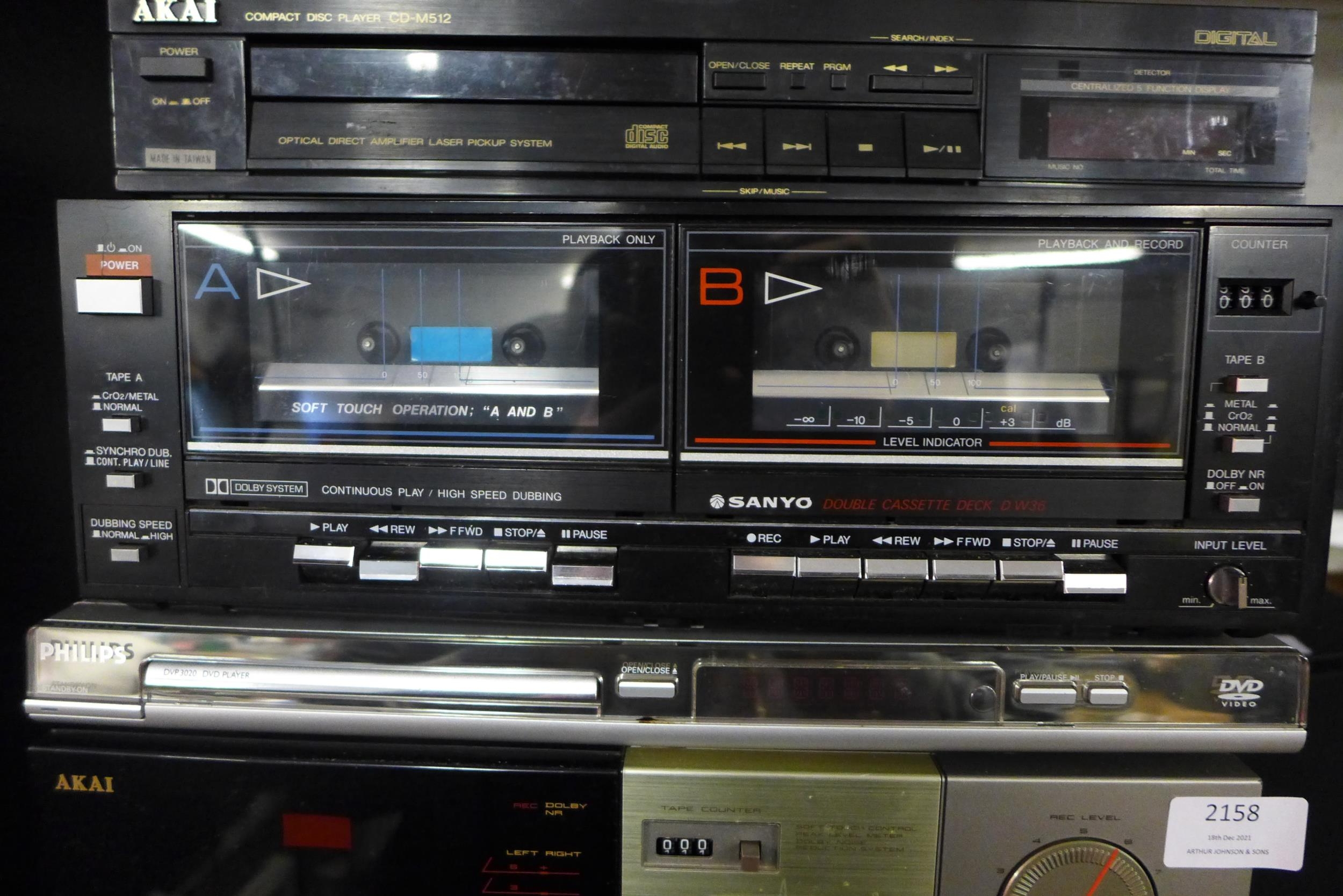 5 Separate systems:- Akai CDM512 CD player, Sharp SA-10 receiver, Sanyo JT20LP tuner, Akai HXM11 tape deck, Akai twin tape deck plus DVD player