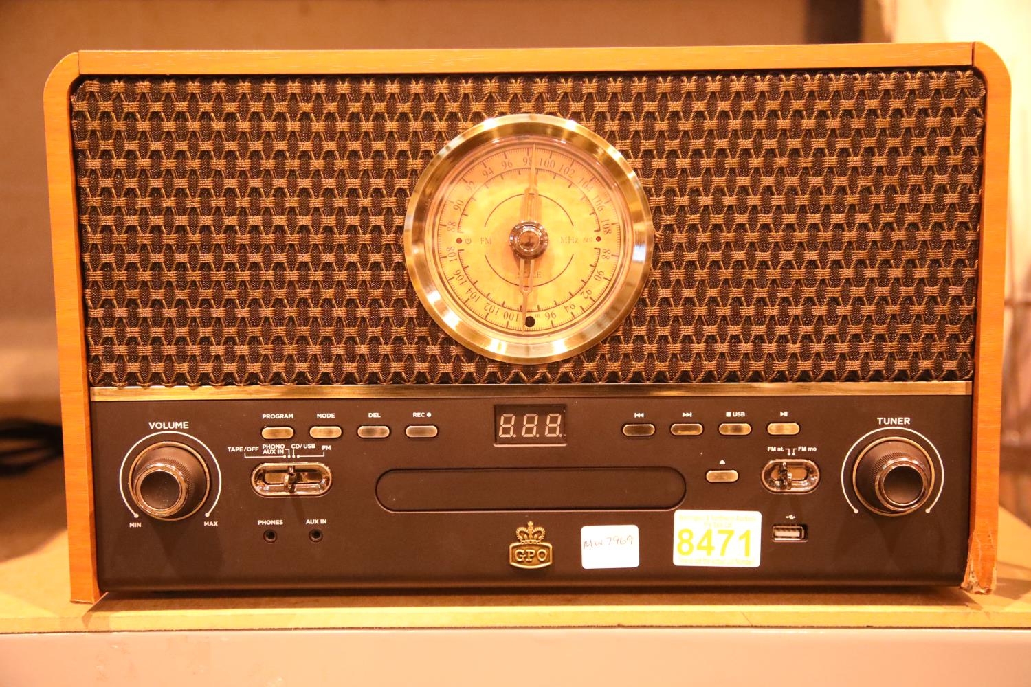 GPO Chesterton retro music centre; 3 speed turntable; CD/MP3/USB player; FM radio; MP3 recorder; remote control; wooden case. Not available for in-house P&P