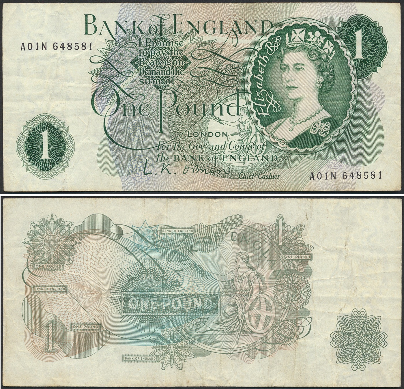 L.K. O'Brien. Experimental Issue first run £1 A01N 648581 good very fine. (Duggleby B283) (N)