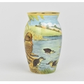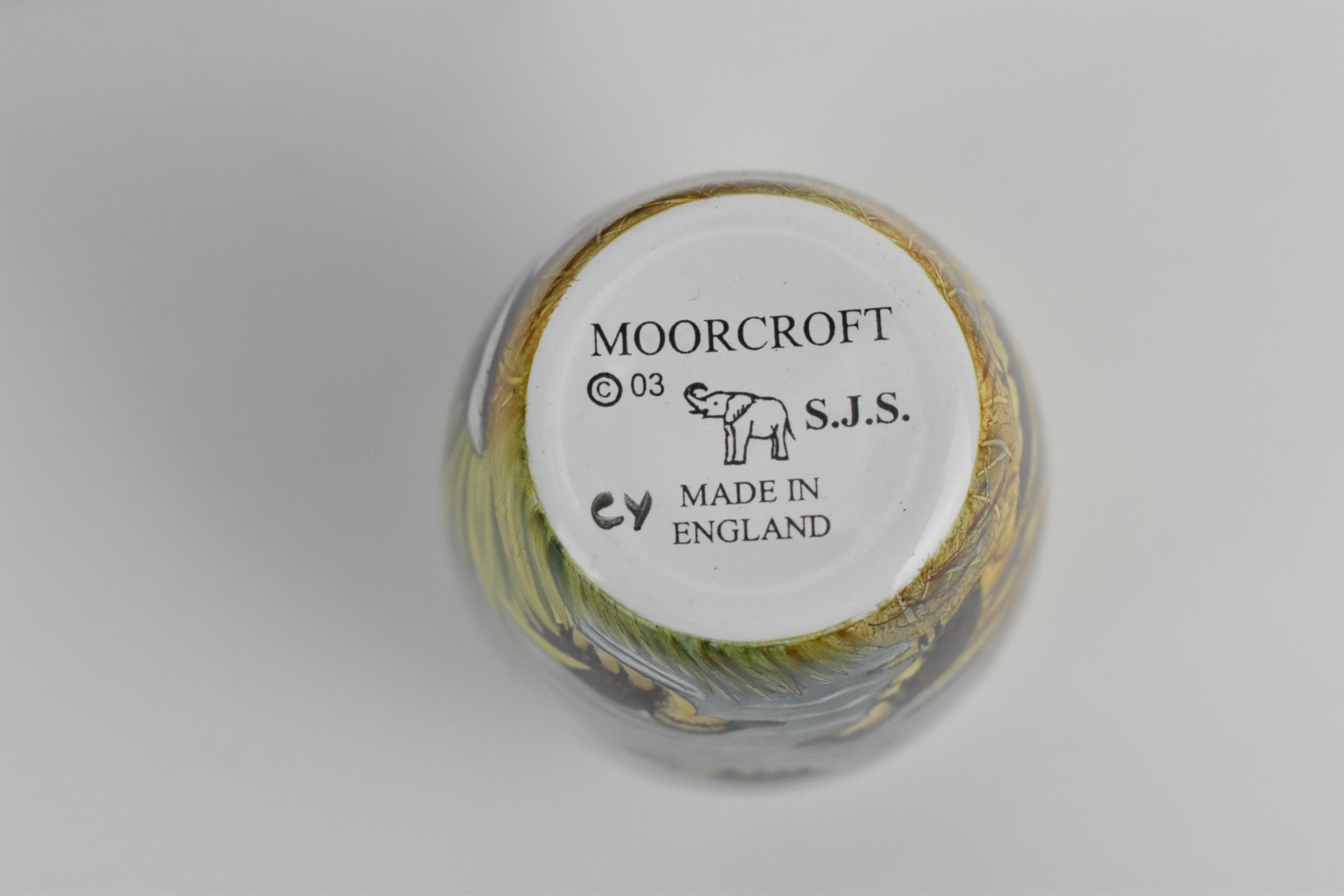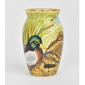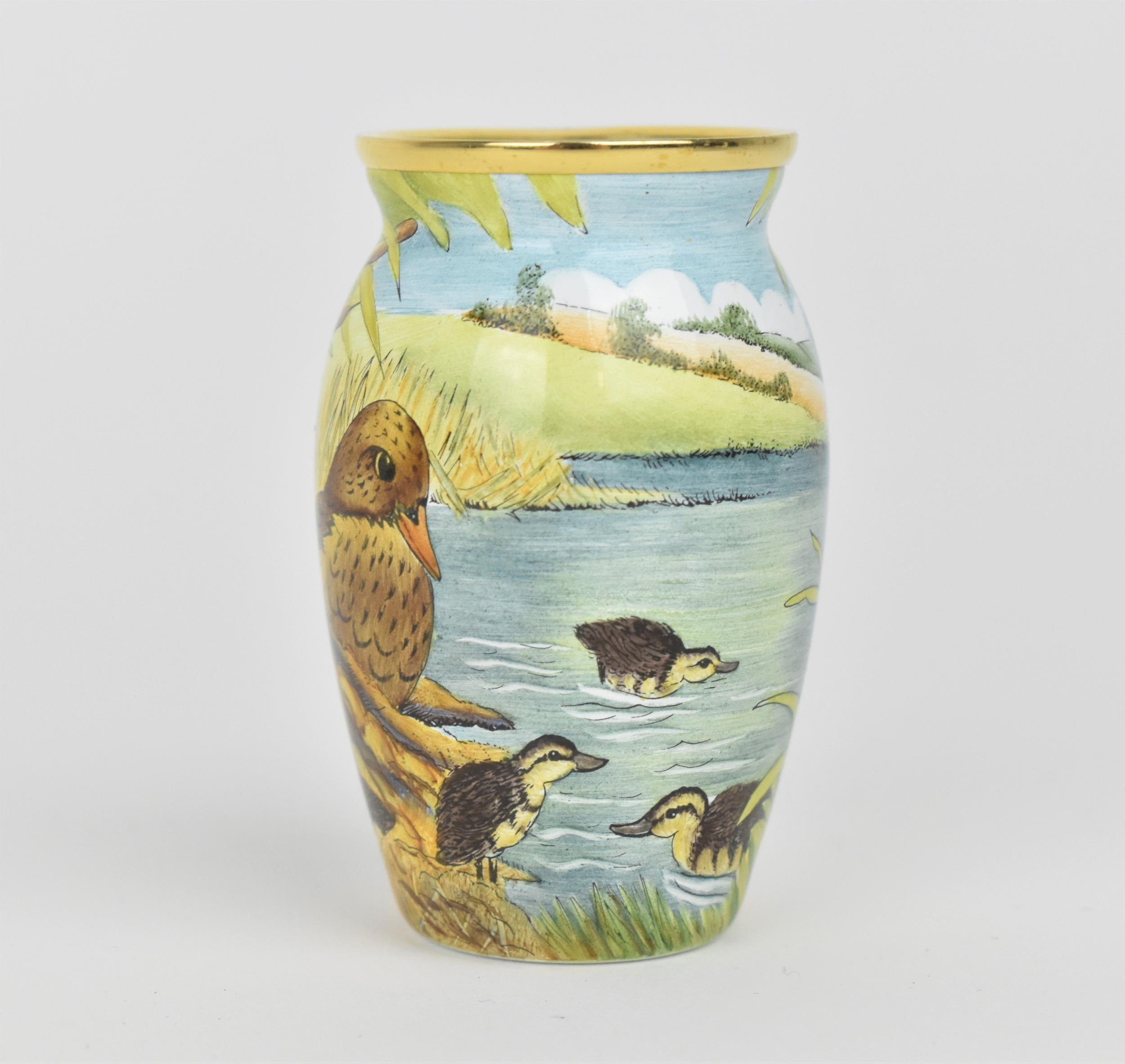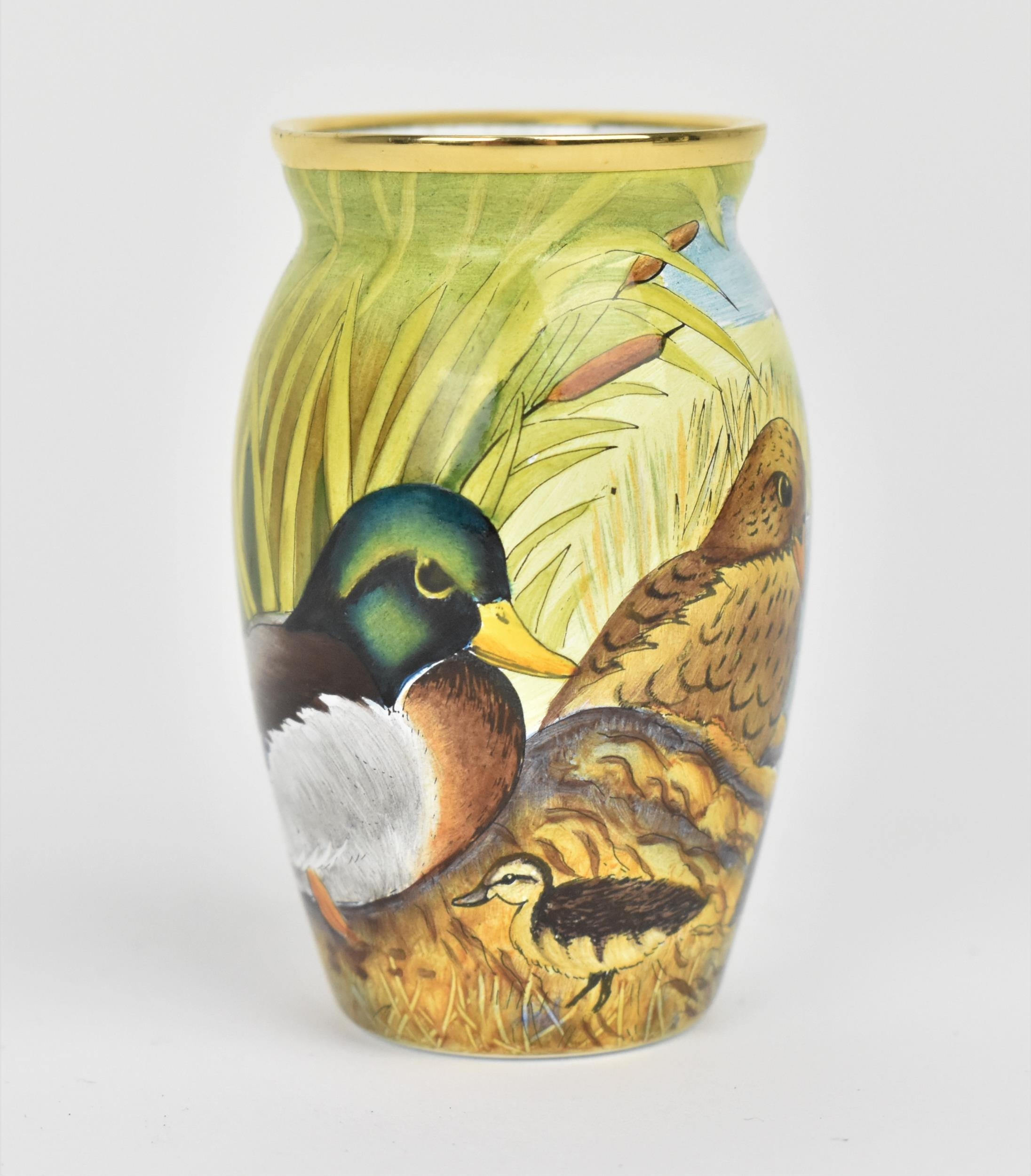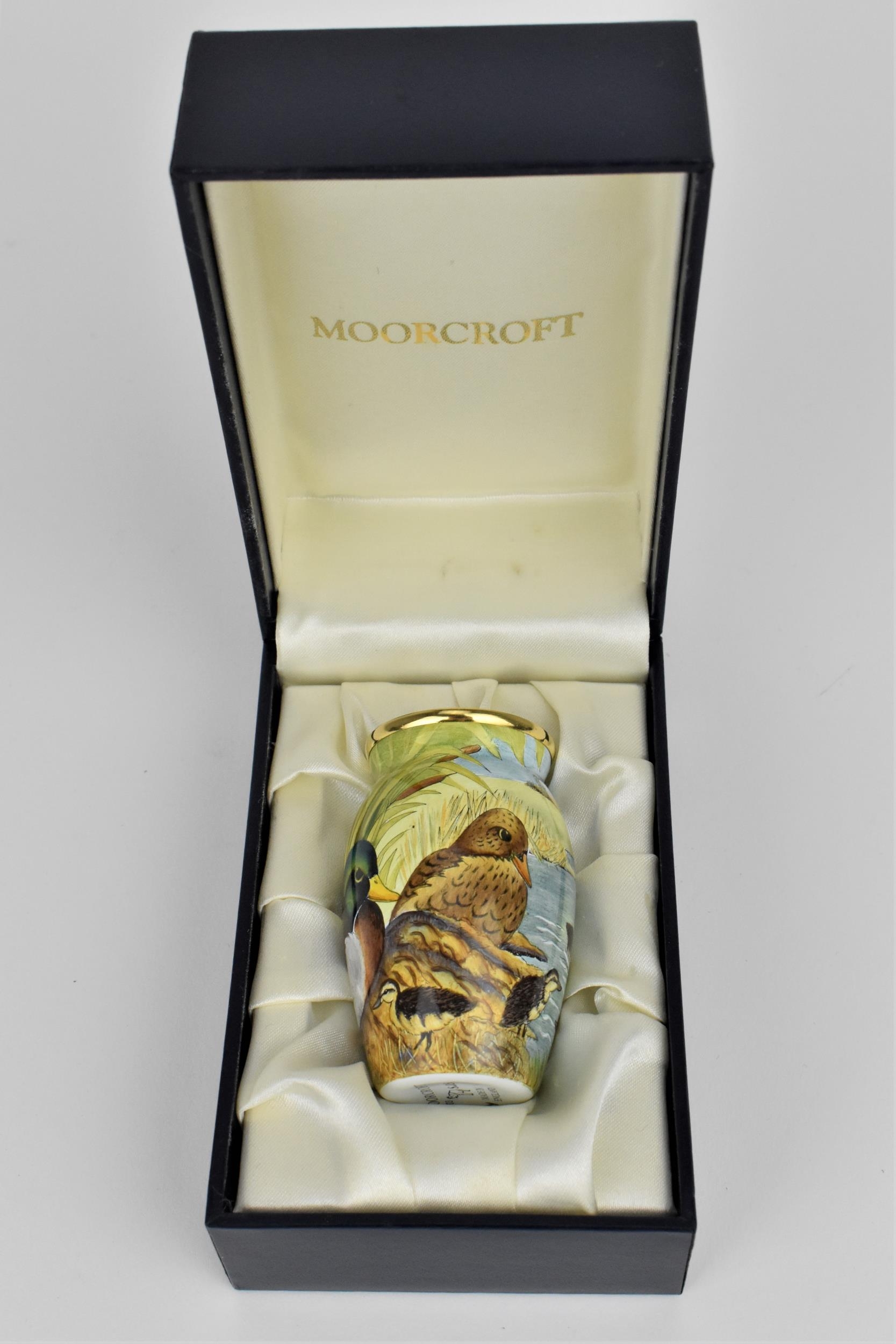 A Moorcroft Enamels Ltd miniature vase with painted mallards pattern designed by Stephen Smith, painted by Carol Yarnold, in original fitted box, 6.5 cm high