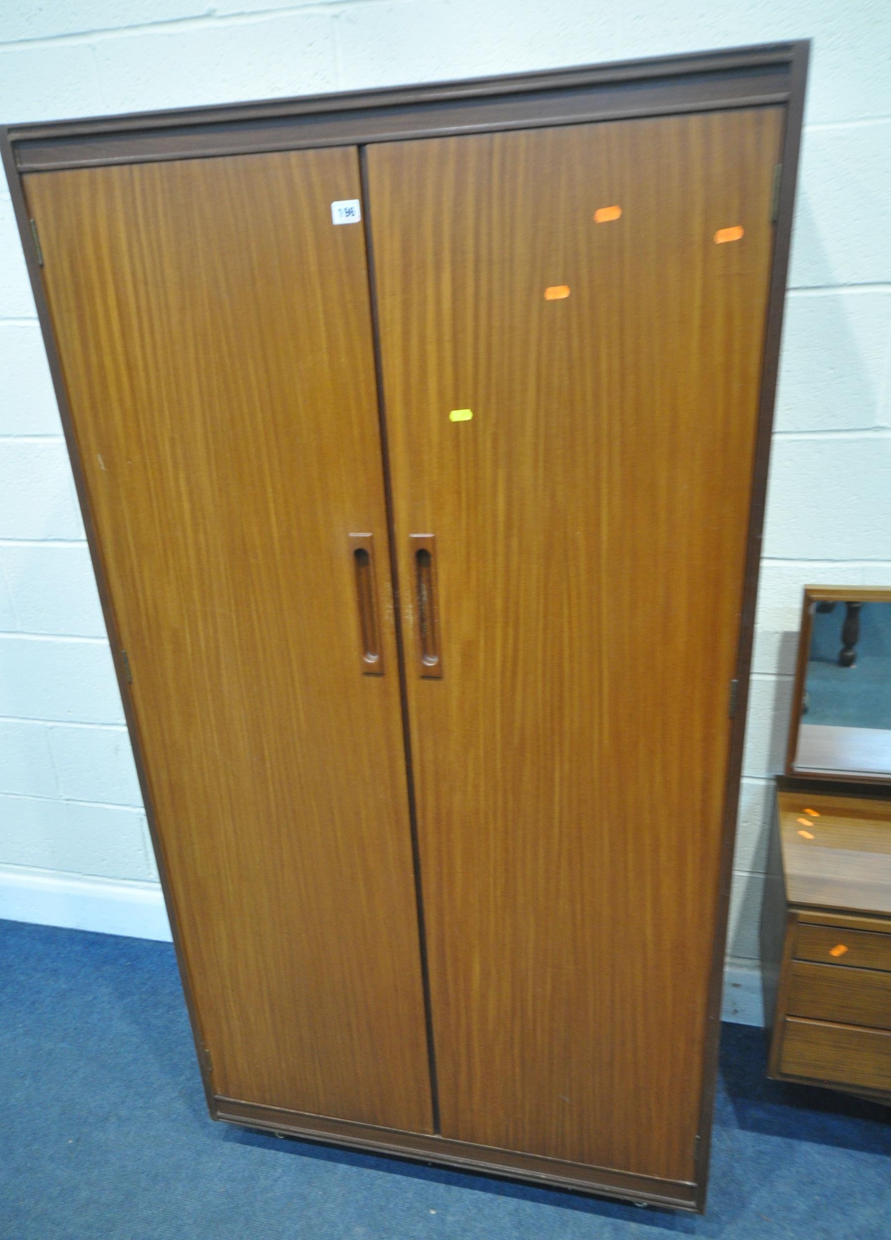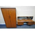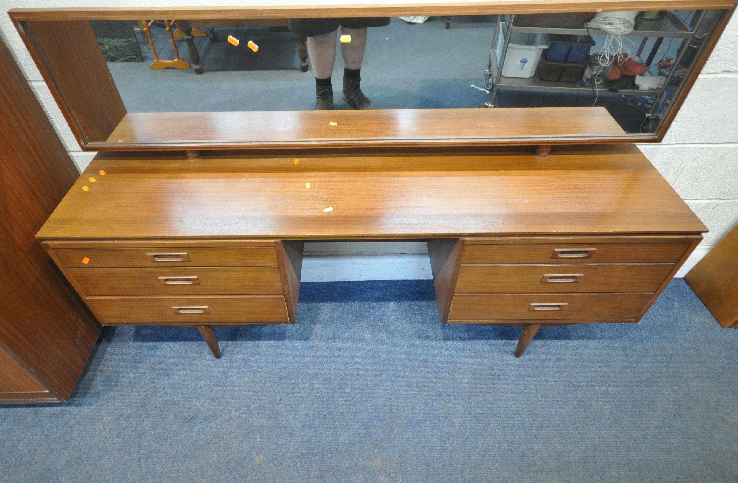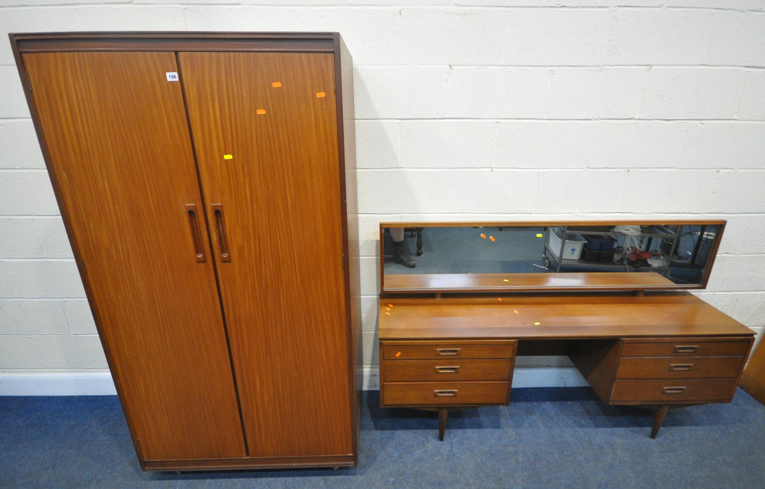 WHITE AND NEWTON, A MID-CENTURY TEAK TWO PIECE BEDROOM SUITE, comprising a double door wardrobe, width 93cm x depth 57cm x height 177cm, along with a dressing table, with a rectangular mirror, two banks of three drawers, raised on cylindrical tapered legs, condition report: marks, scuffs, scratches to the sides, other signs of usage (2)