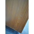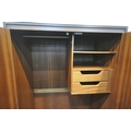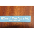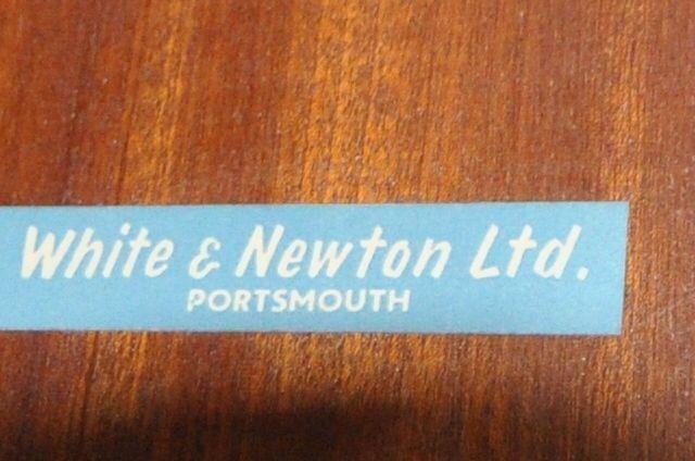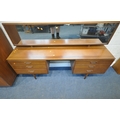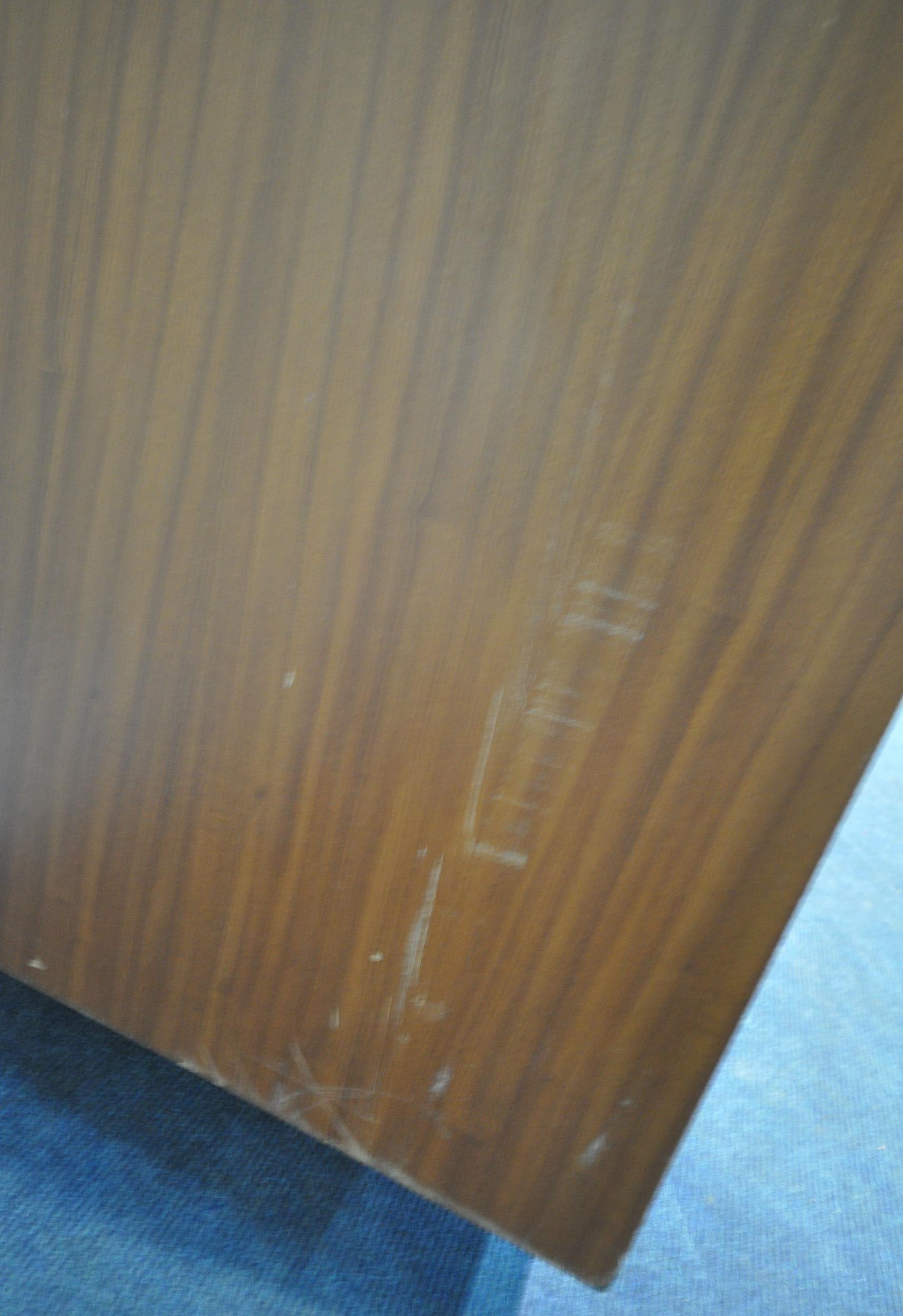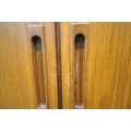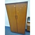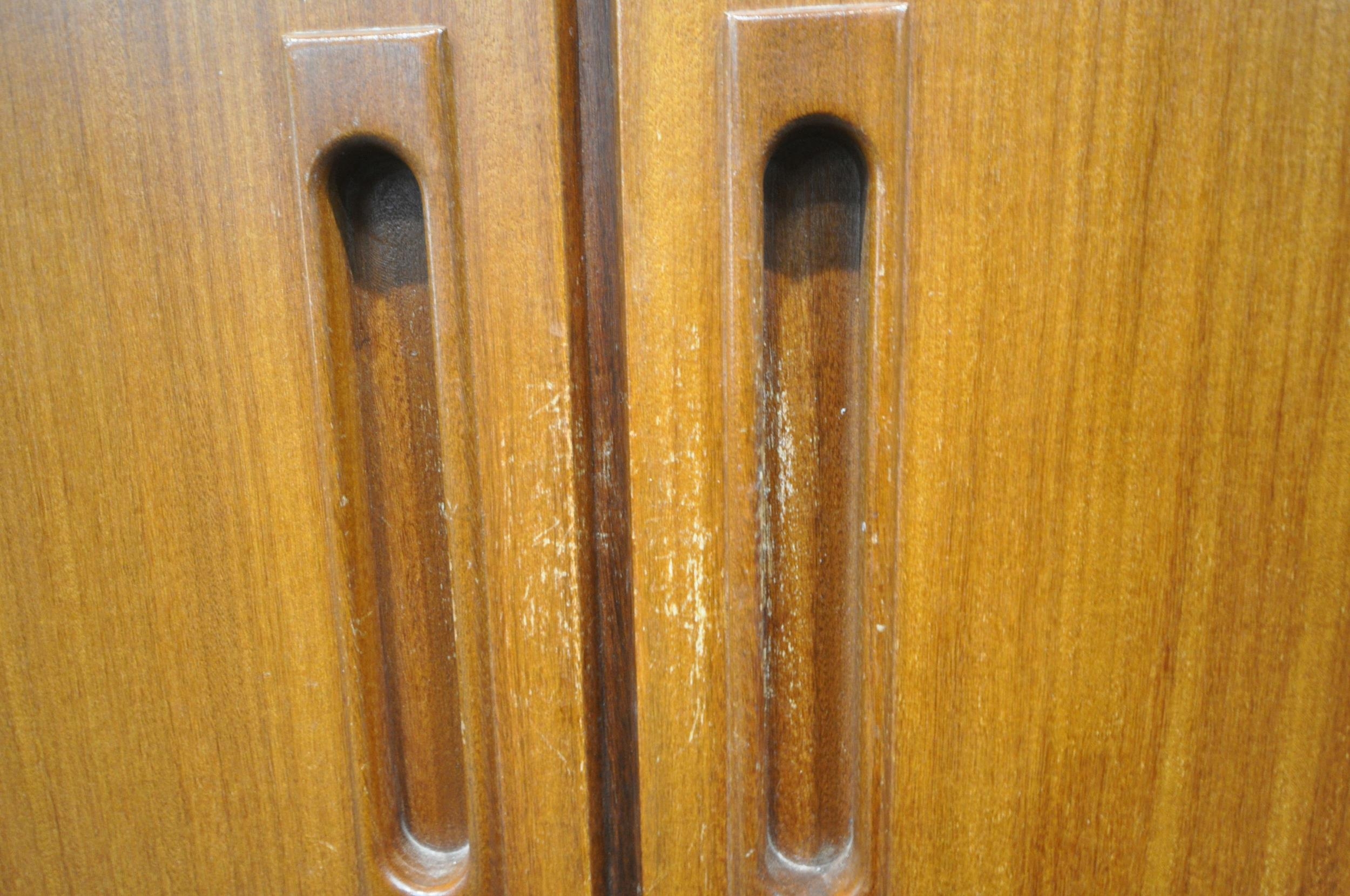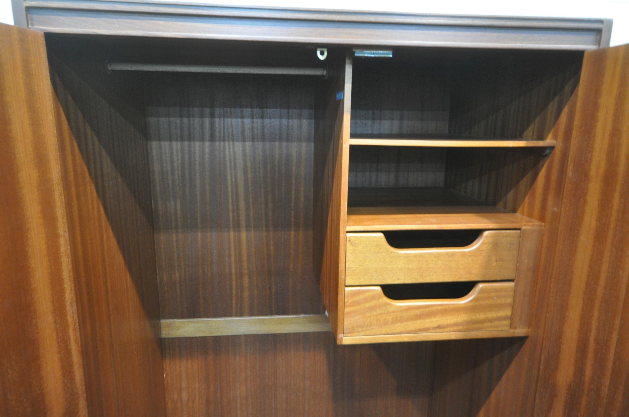 WHITE AND NEWTON, A MID-CENTURY TEAK TWO PIECE BEDROOM SUITE, comprising a double door wardrobe, width 93cm x depth 57cm x height 177cm, along with a dressing table, with a rectangular mirror, two banks of three drawers, raised on cylindrical tapered legs, condition report: marks, scuffs, scratches to the sides, other signs of usage (2)
