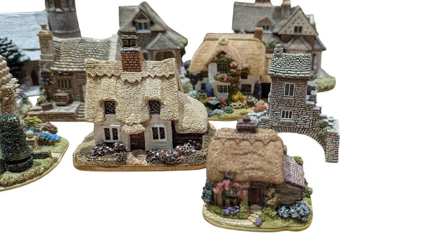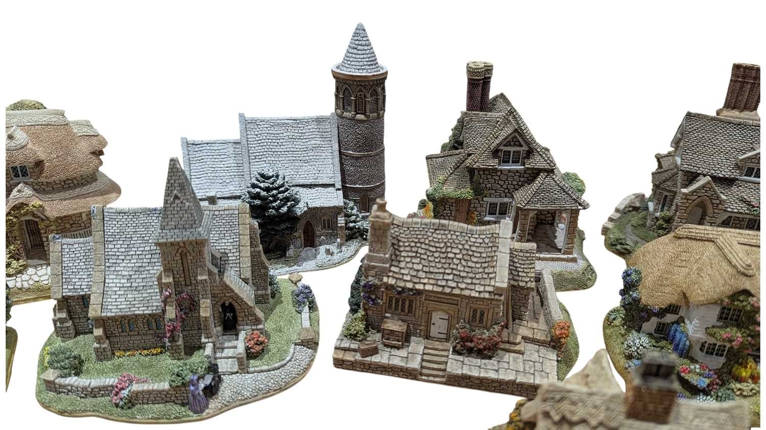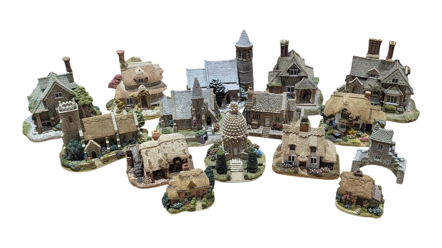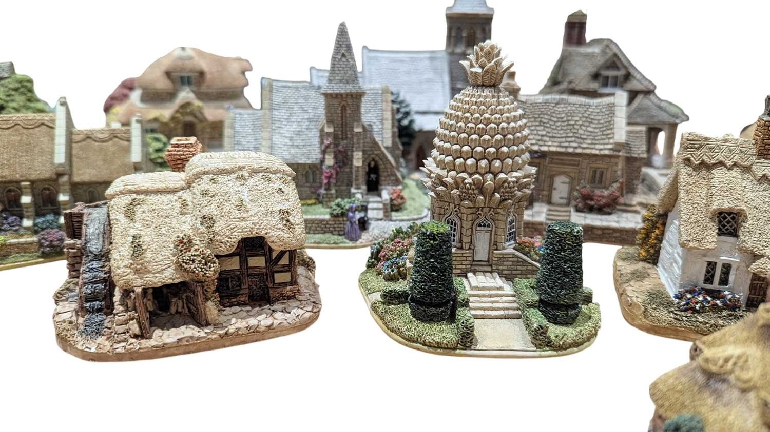 Lilliput Lane - A collection of vintage 20th century resin cottage house figures. Including St Stephen's Church, Double Cottage, Circular Cottage, All Things Bright & Beautiful, Rose Cottage, The Pineapple House, Watermill, Clare Cottage, Chocolate Box Cottage, and more. Approximately 15 cottage figures present.