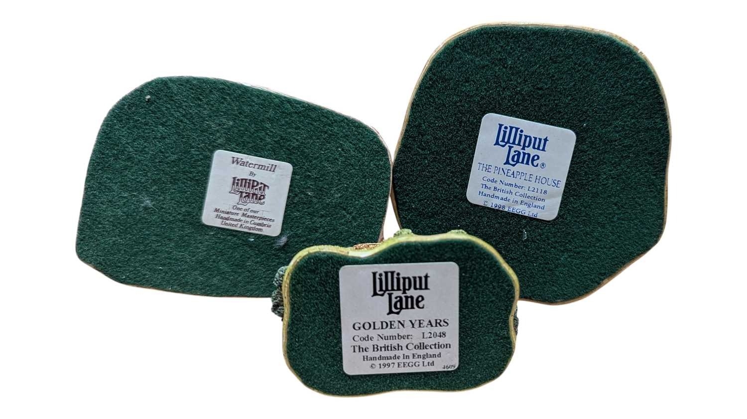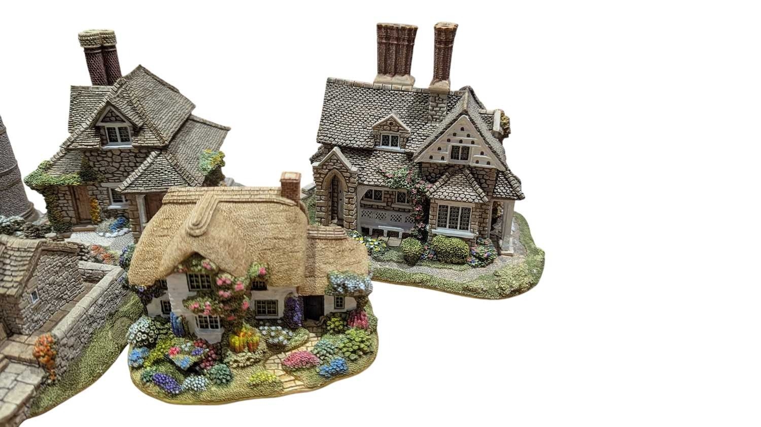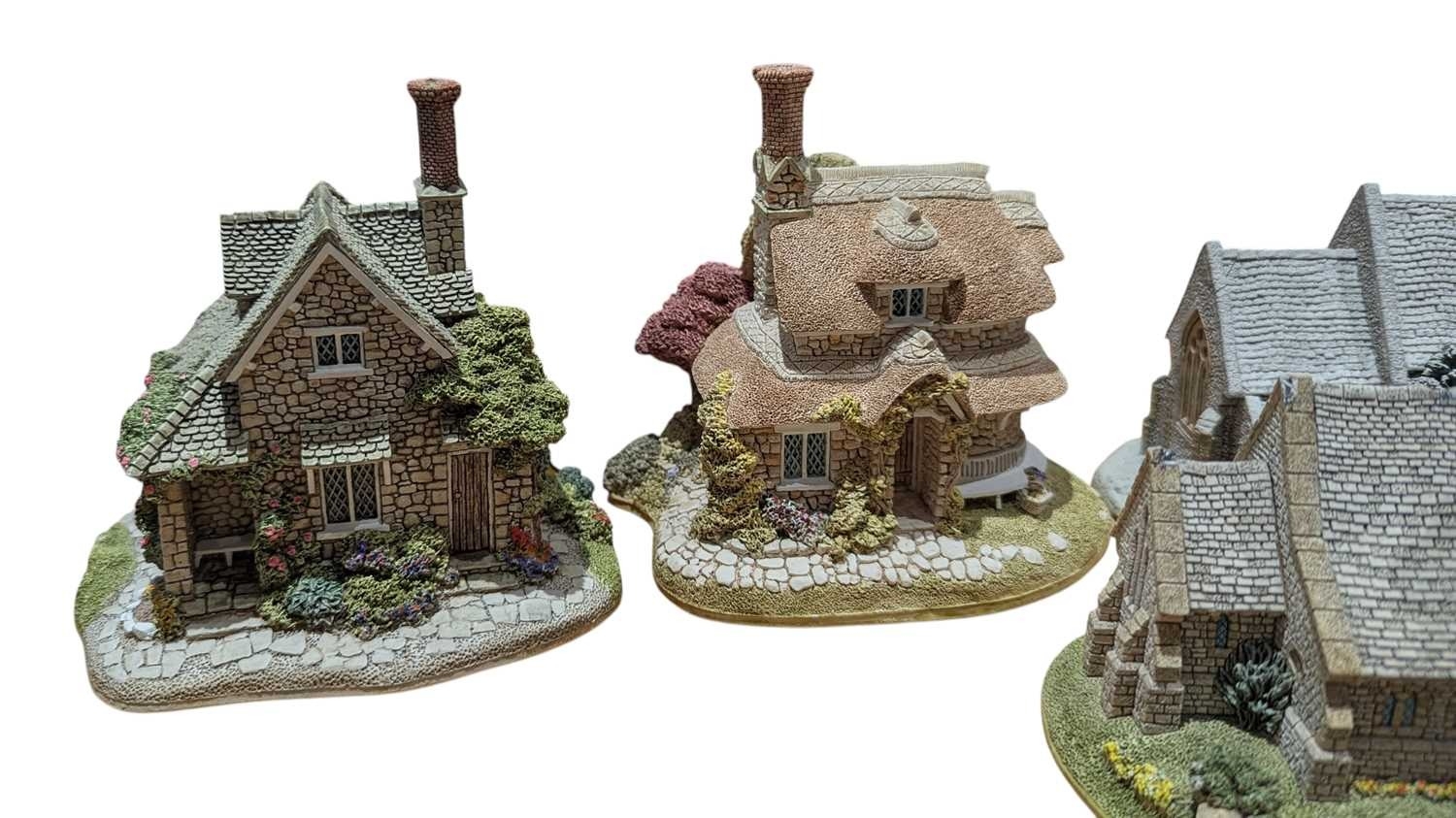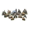 Lilliput Lane - A collection of vintage 20th century resin cottage house figures. Including St Stephen's Church, Double Cottage, Circular Cottage, All Things Bright & Beautiful, Rose Cottage, The Pineapple House, Watermill, Clare Cottage, Chocolate Box Cottage, and more. Approximately 15 cottage figures present.