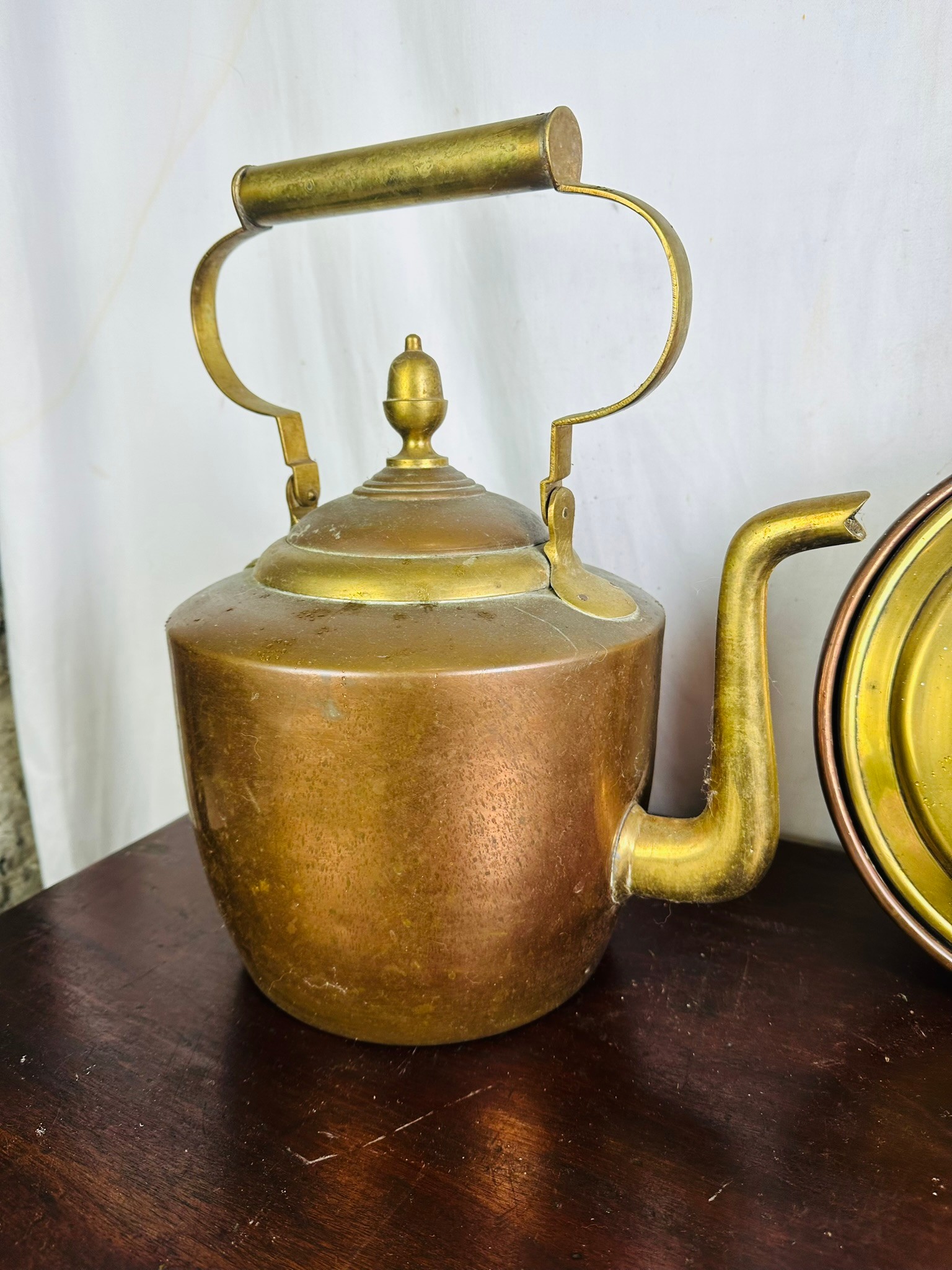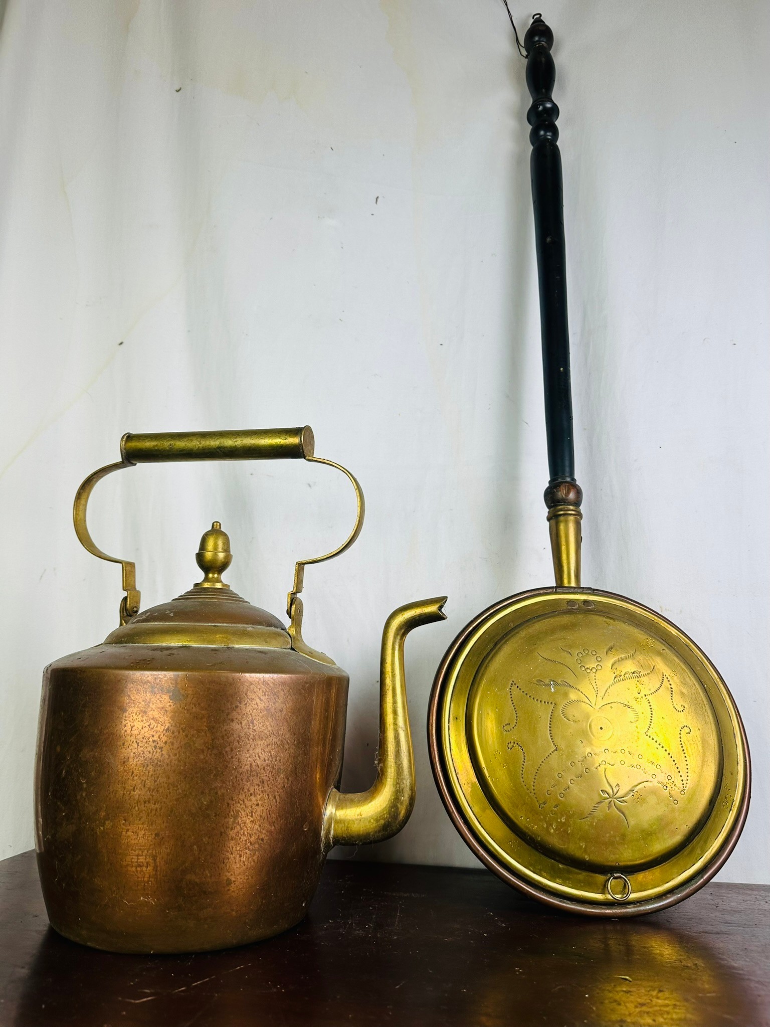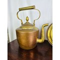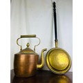 An antique copper kettle (15''h) and a copper and brass bed warmer (40'')
