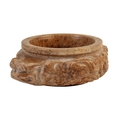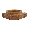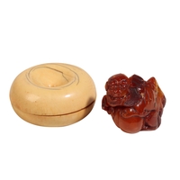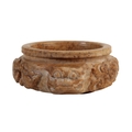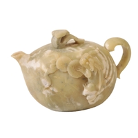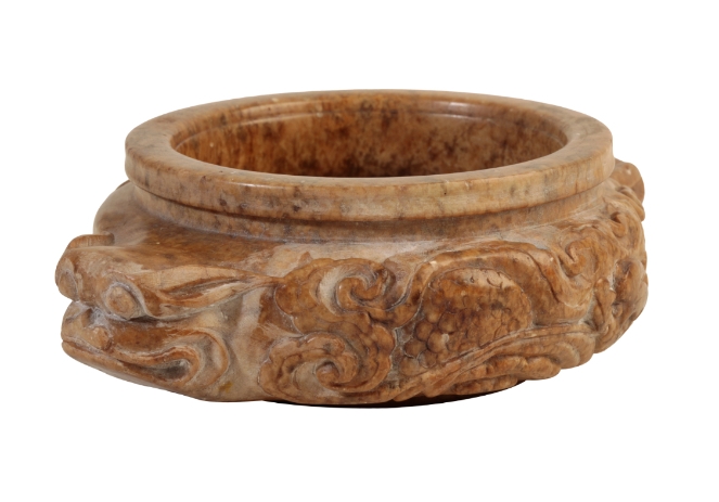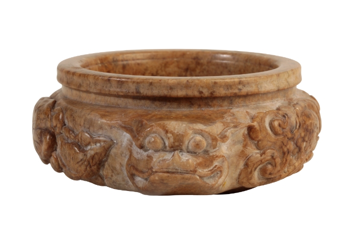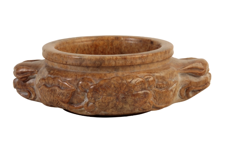 A CHINESE SOAPSTONE CENSER in finely mottled stone of amber colour, the compressed circular body carved with lotus and scrolling foliage, the mask handles with bulging eyes, Qing, 16.5cm