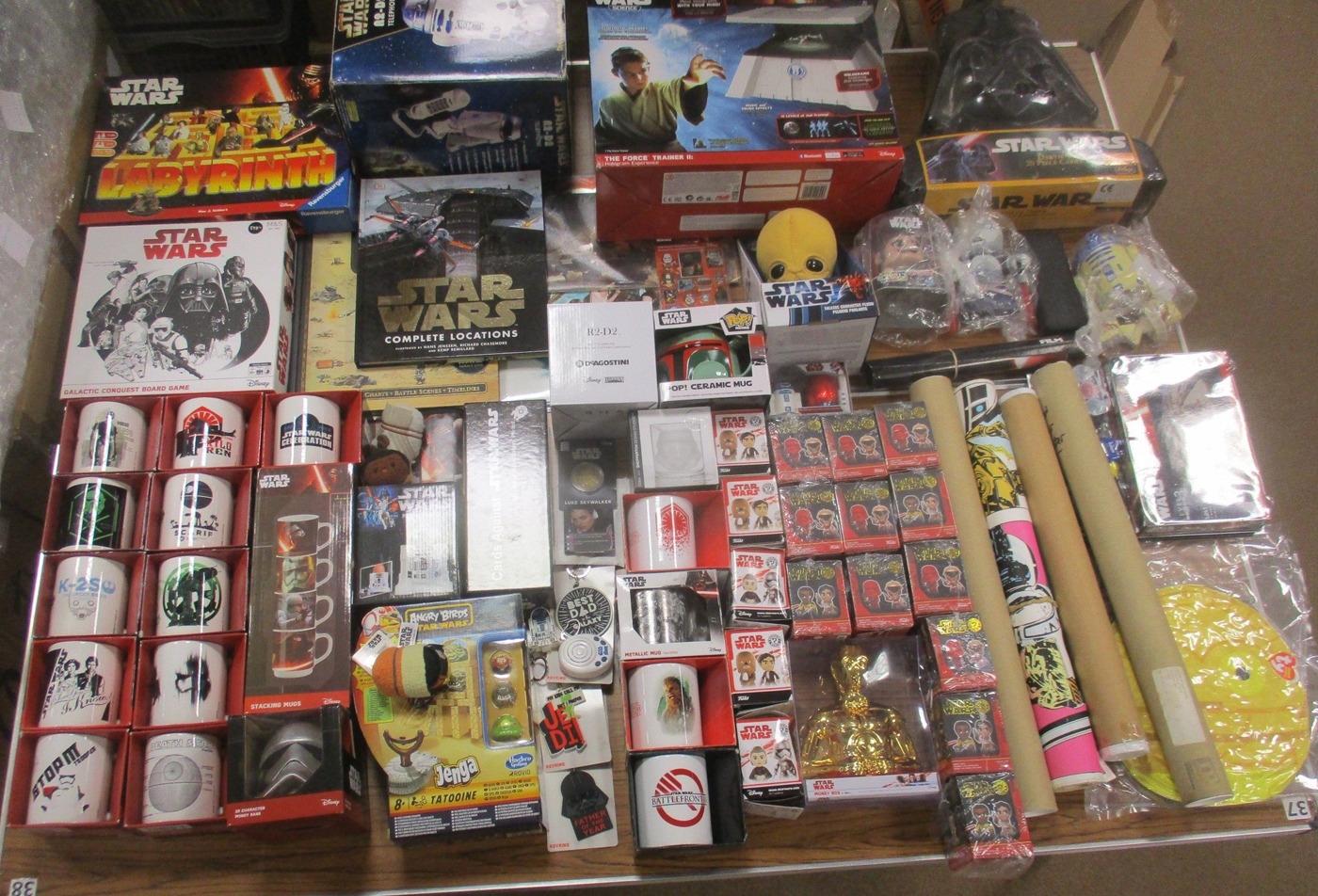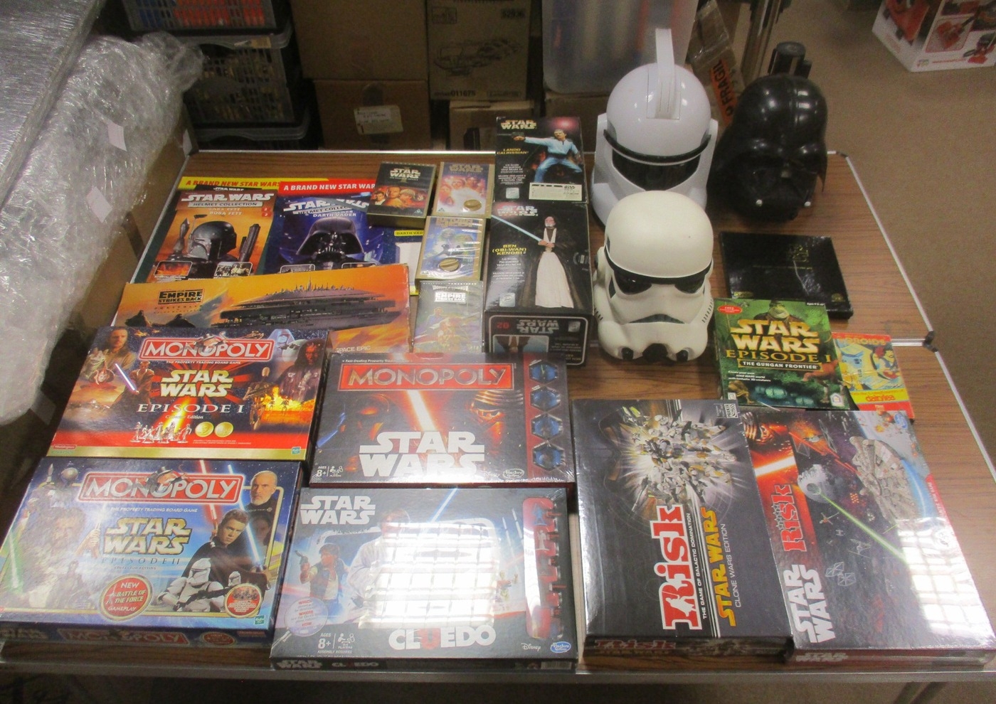 Star Wars. Accumulation of various collectables, generally very good to near mint with majority of items in good to excellent boxes and rest unboxed, includes ranges of Helmets, Model Kits, Posters, Mugs, Funko Mystery Minis, Board Games, Books, VHSs, Cardboard Advert Standees, etc. (6B + standees)
