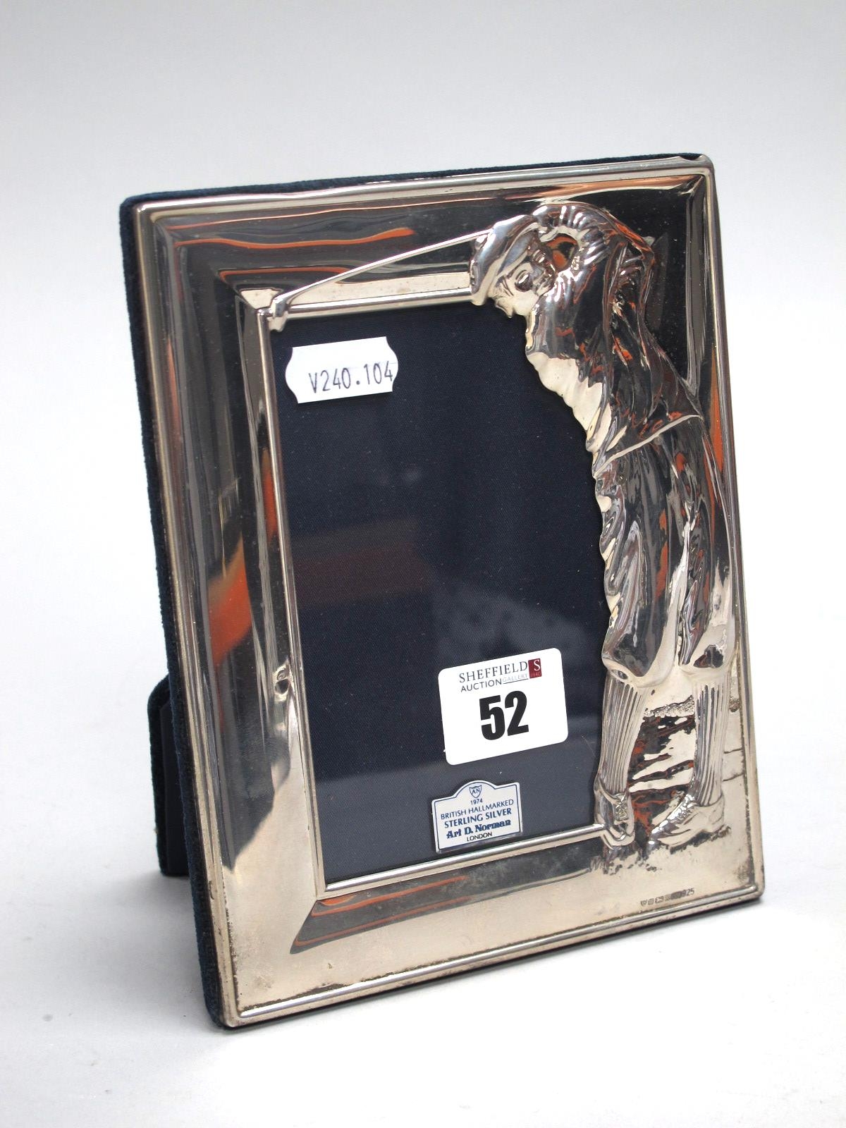 A Modern Hallmarked Silver Mounted Rectangular Photograph Frame, Art Norman, Sheffield 1997, detailed in relief with a golfer, on dark blue plush easel back, overall height 17.8cm.